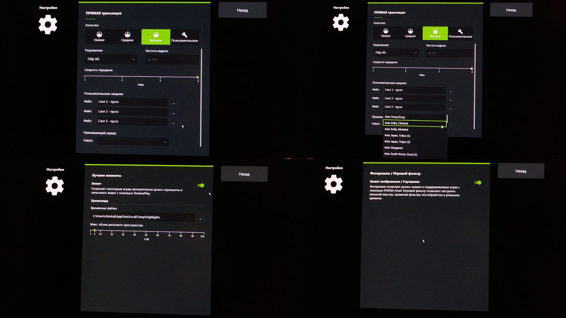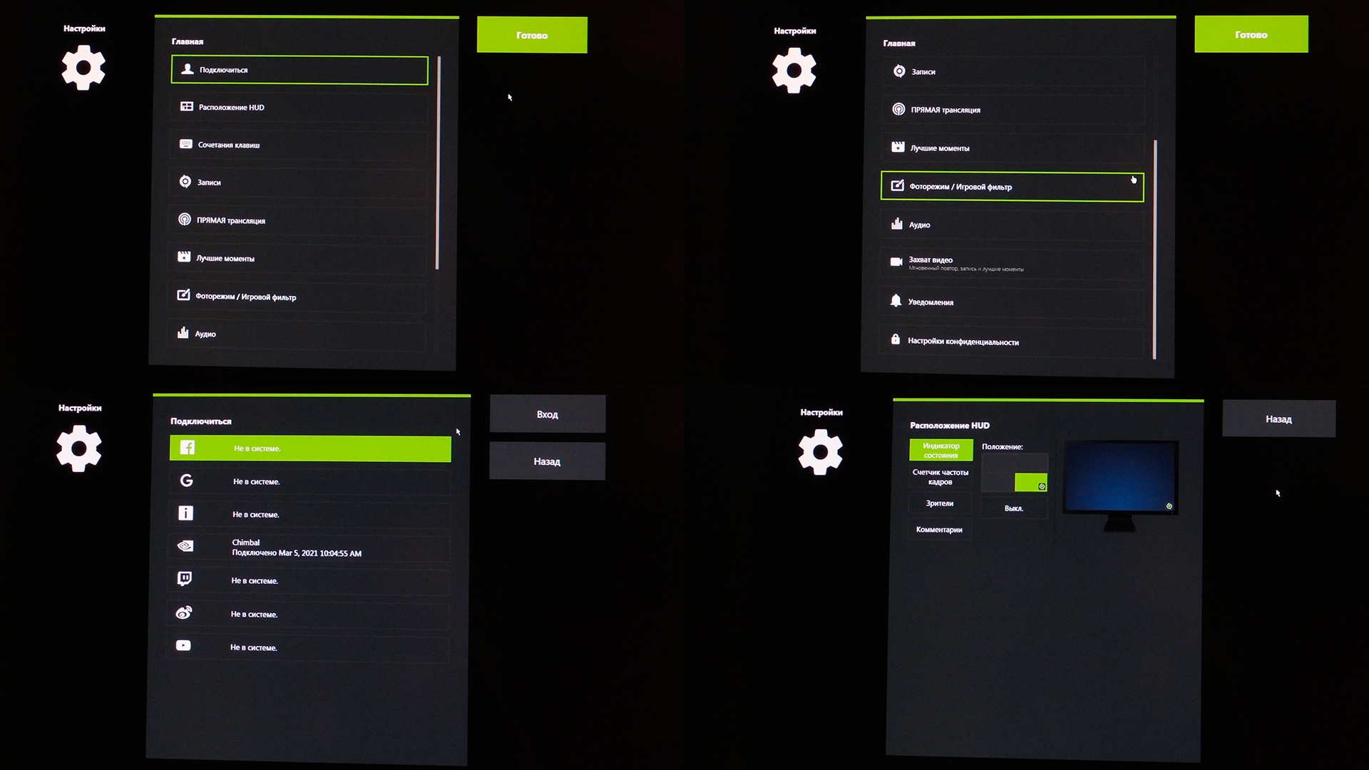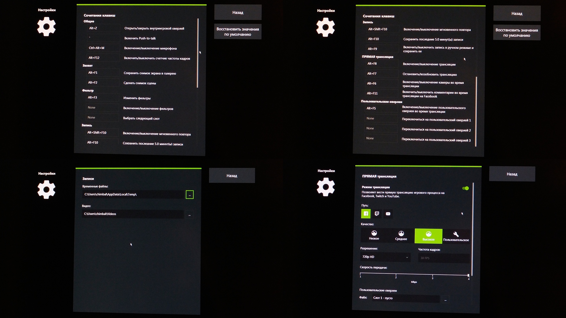 Недоступно без GF Experience. 1) ПРЯМАЯ трансляция: Facebook, Twitch, Youtube. 2) Сочетания клавиш: Вкл./выкл. пользовательского оверлея во время трансляции. |