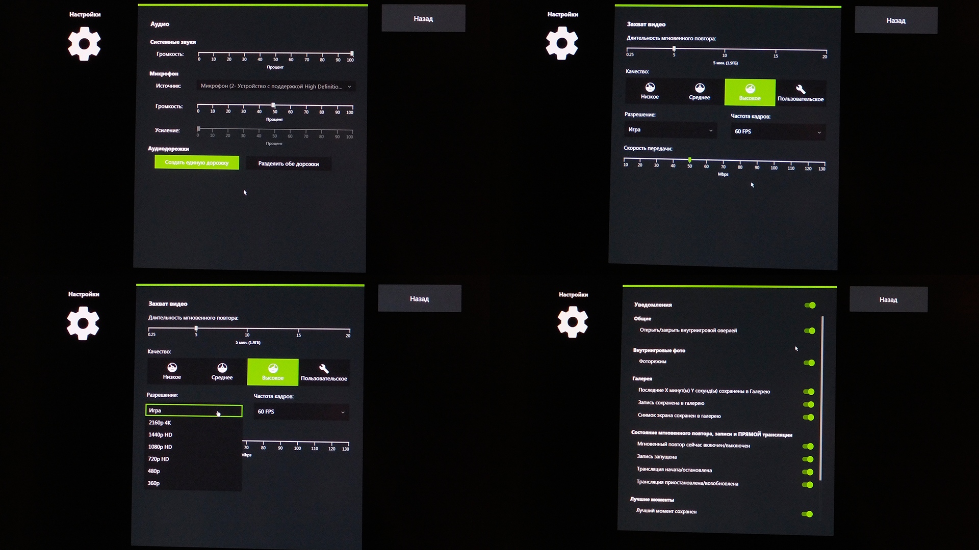 Недоступно без GF Experience. Пресеты "Качество": низкое, среднее, высокое. FPS: 30 или 60 Bit Rate: 10 - 130 Mbps Разрешение: Игровое, 2160p, 1440p, 1080p, 720p, 480p, 360p. |