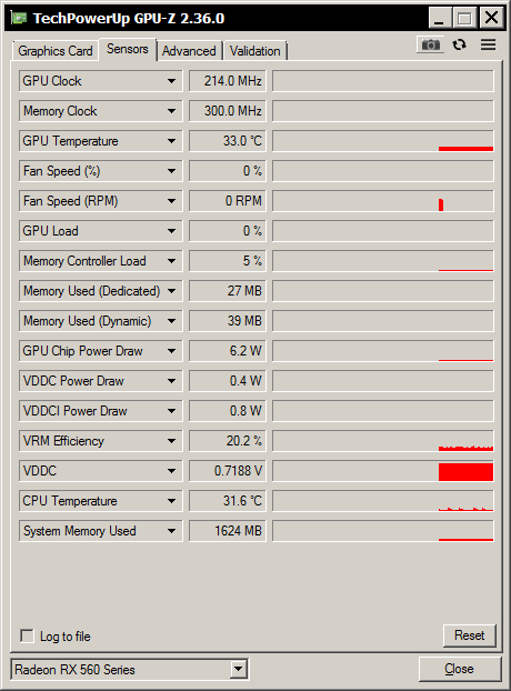 8) Датчики: В GPU-Z неоднозначные позиции с датчиками, с одной стороны nVidia информативнее, с другой стороны AMD, но не стоит забывать что взяты видеокарты из разного класса производительности и датчики могут различаться если взять ту же RX580 вместо RX560, но чего точно нет у nVidia так это отслеживания показателей самим драйвером.