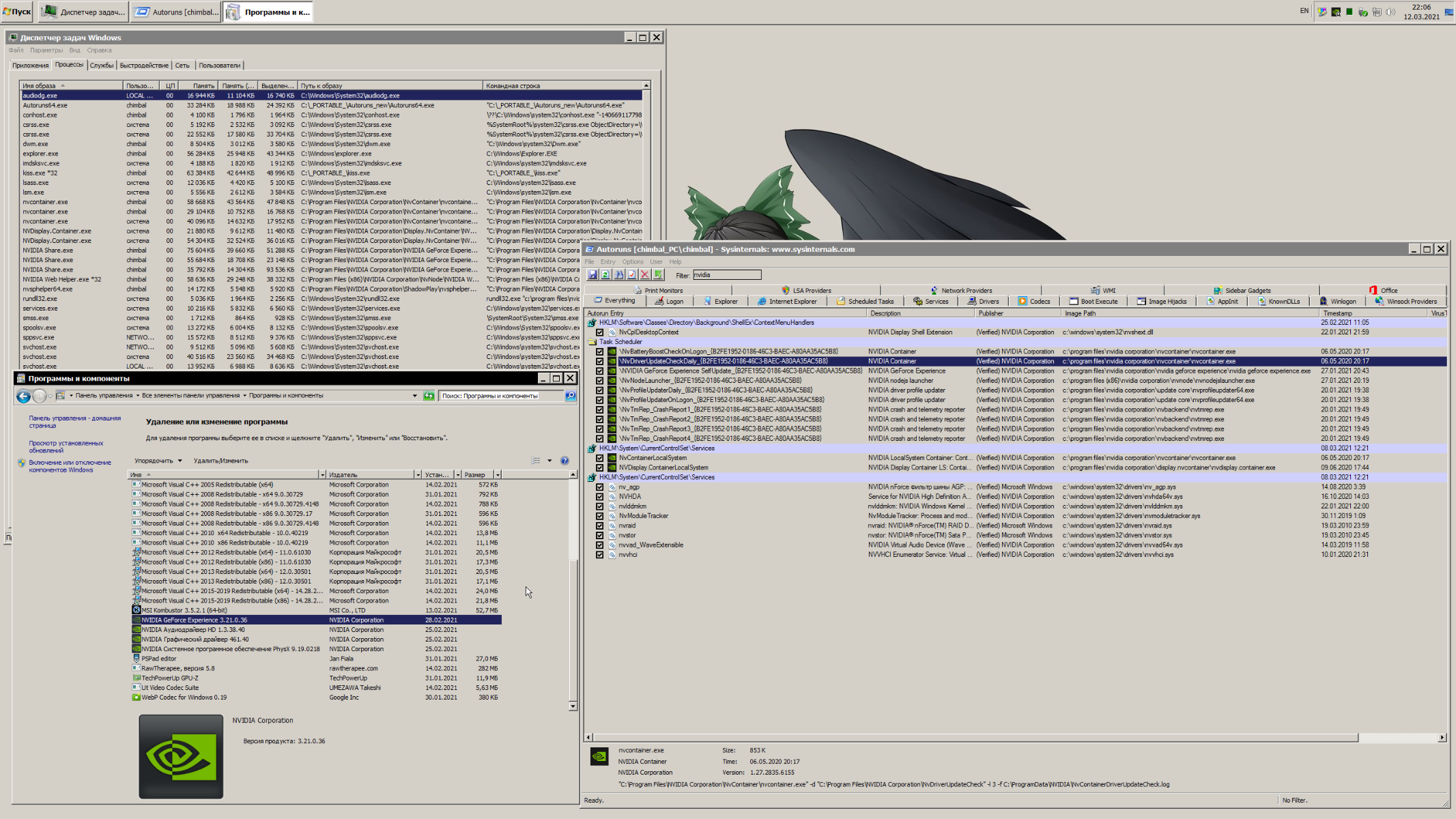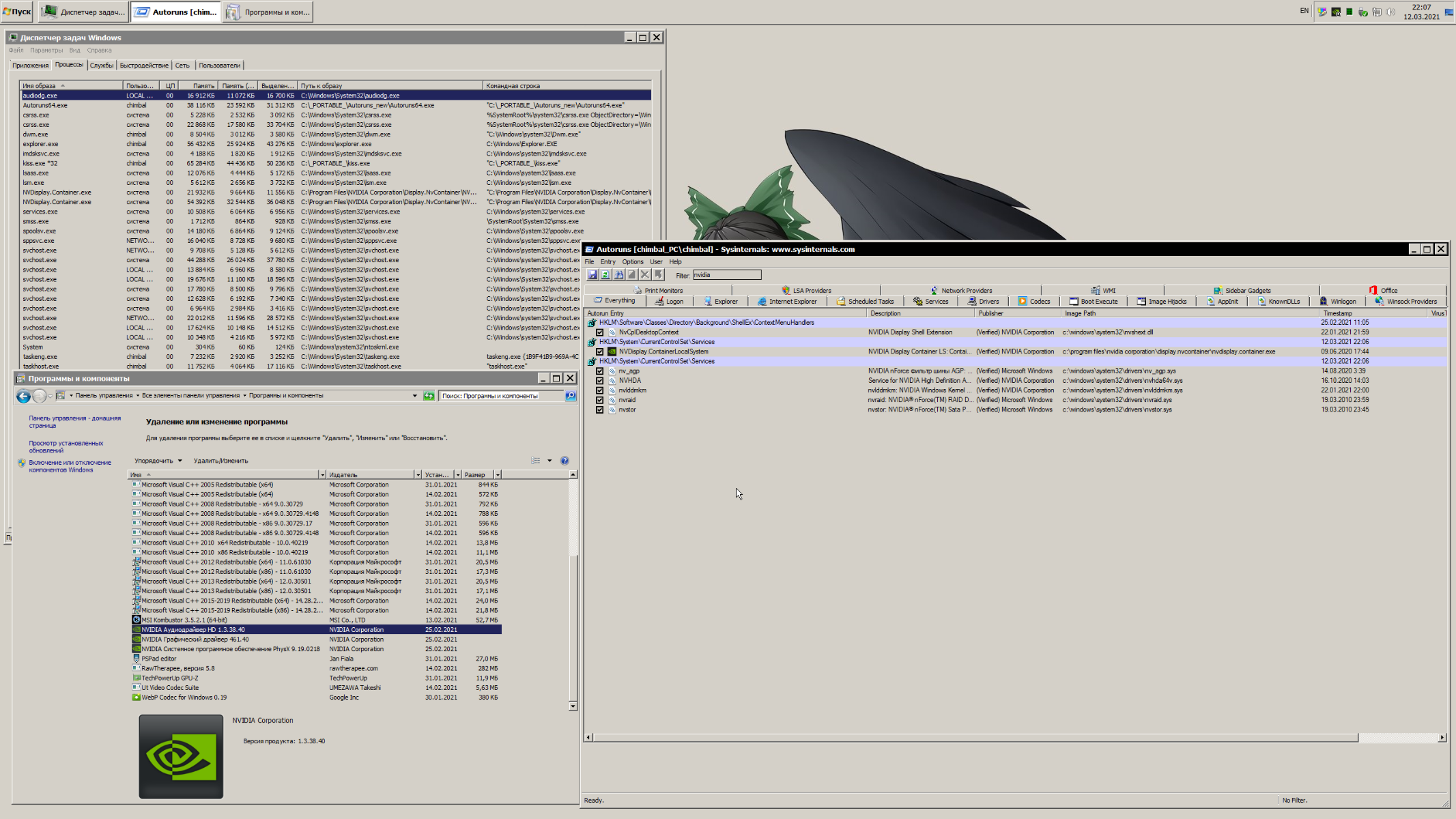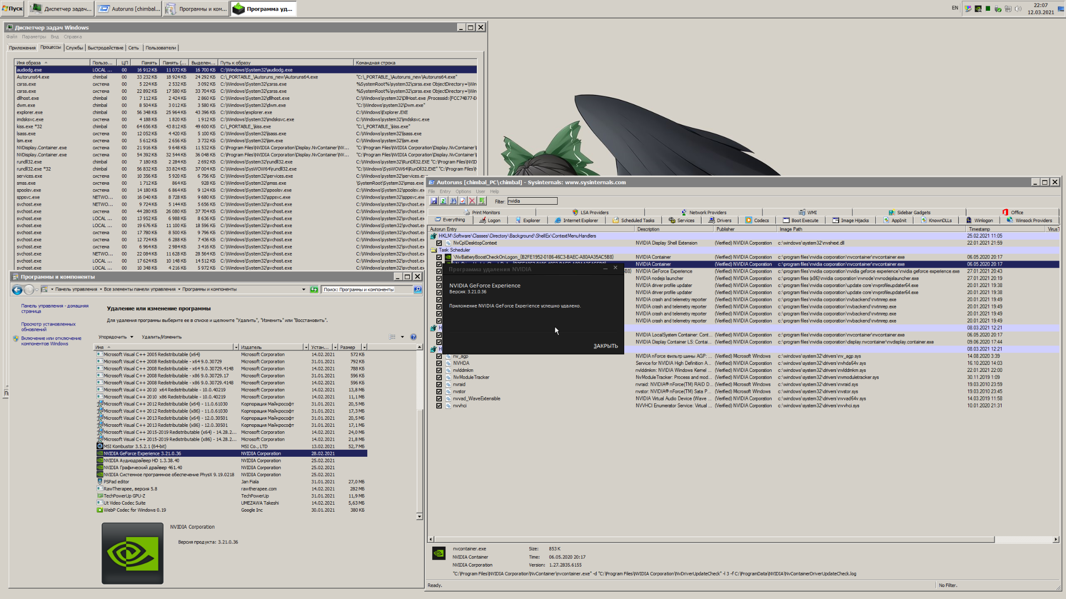| Обнаруженные записи в автозагрузке | 9 элементов за исключением системных (CPU, USB и т.п.) | 21 элемент, из них 4 штуки "NVIDIA crash and telemetry reporter" и 2шт. "NVIDIA Container" |
