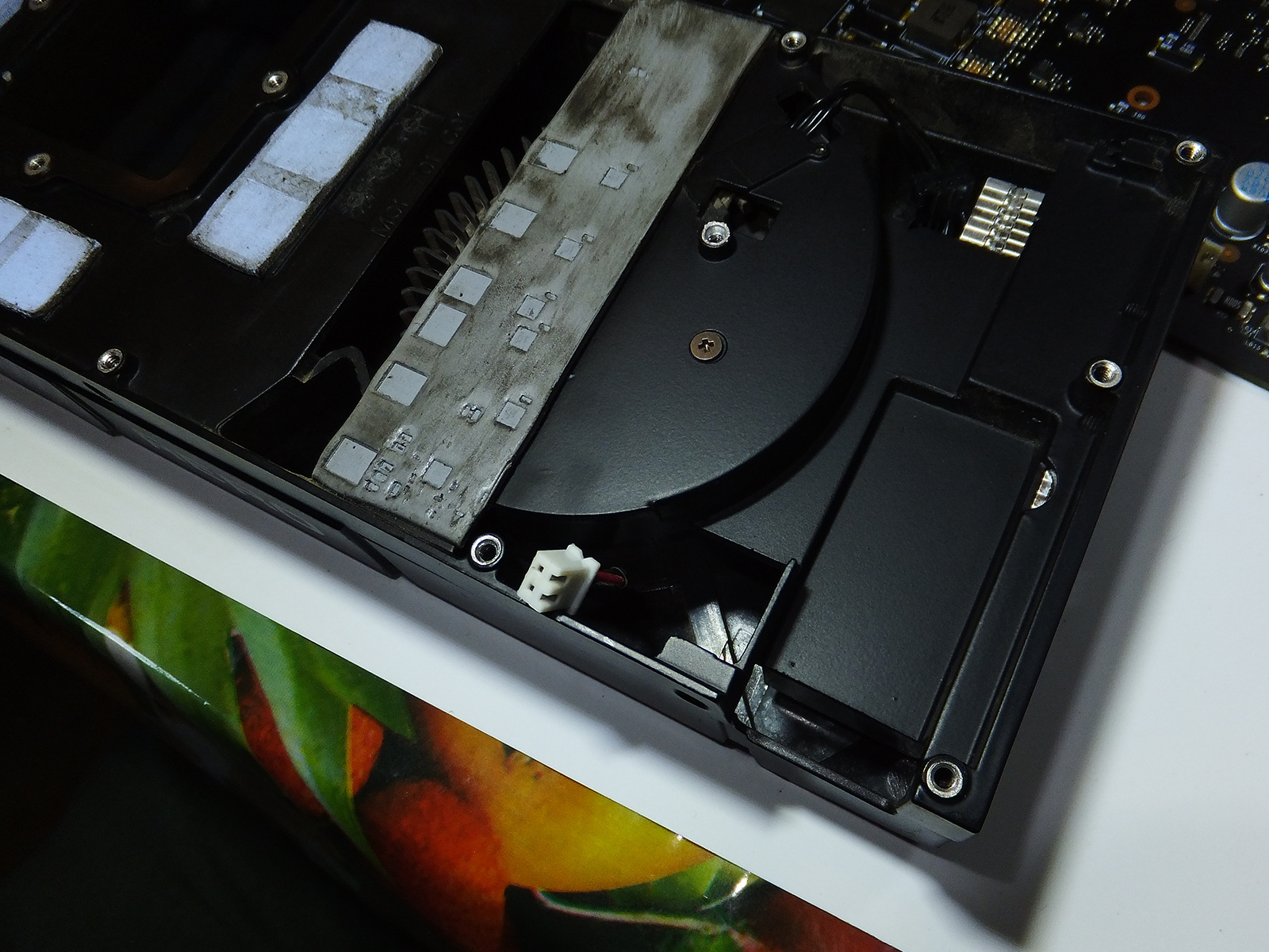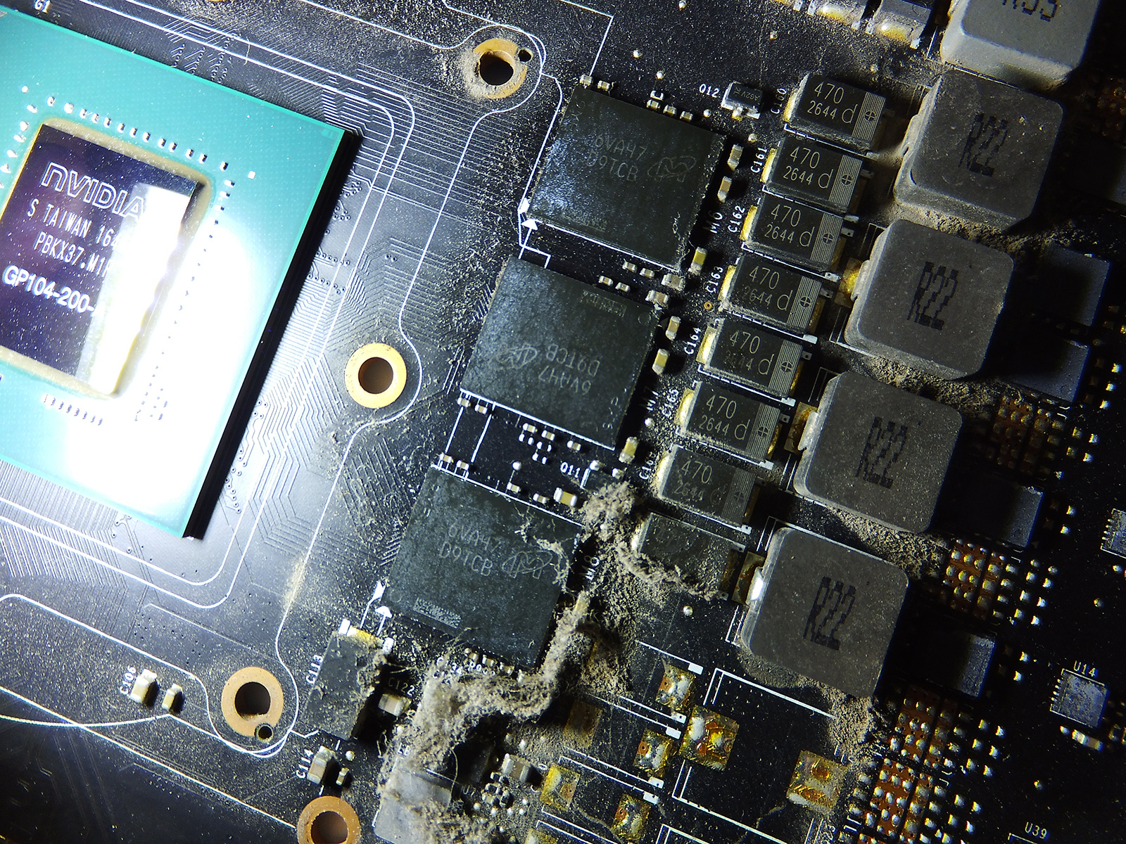 Если снять основу системы охлаждения, можно увидеть плату (очевидно ведь...), однако на плате накопилось много пыли смешавшейся с жижей из термо прокладок.