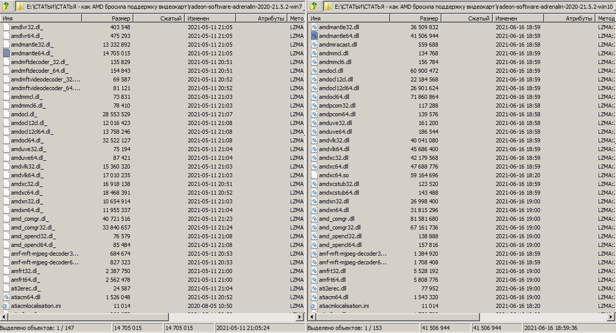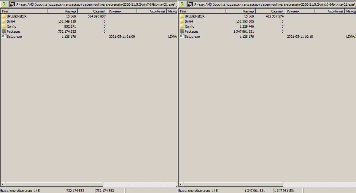 Ради интереса я распаковал драйверы под Windows 7/10, и запаковал в 7zip формате, чтобы исключить возможные хитрости со сжатием пакета от AMD, но драйвер под Windows 10 все равно сжался гораздо лучше, чем драйвер под Windows 7.