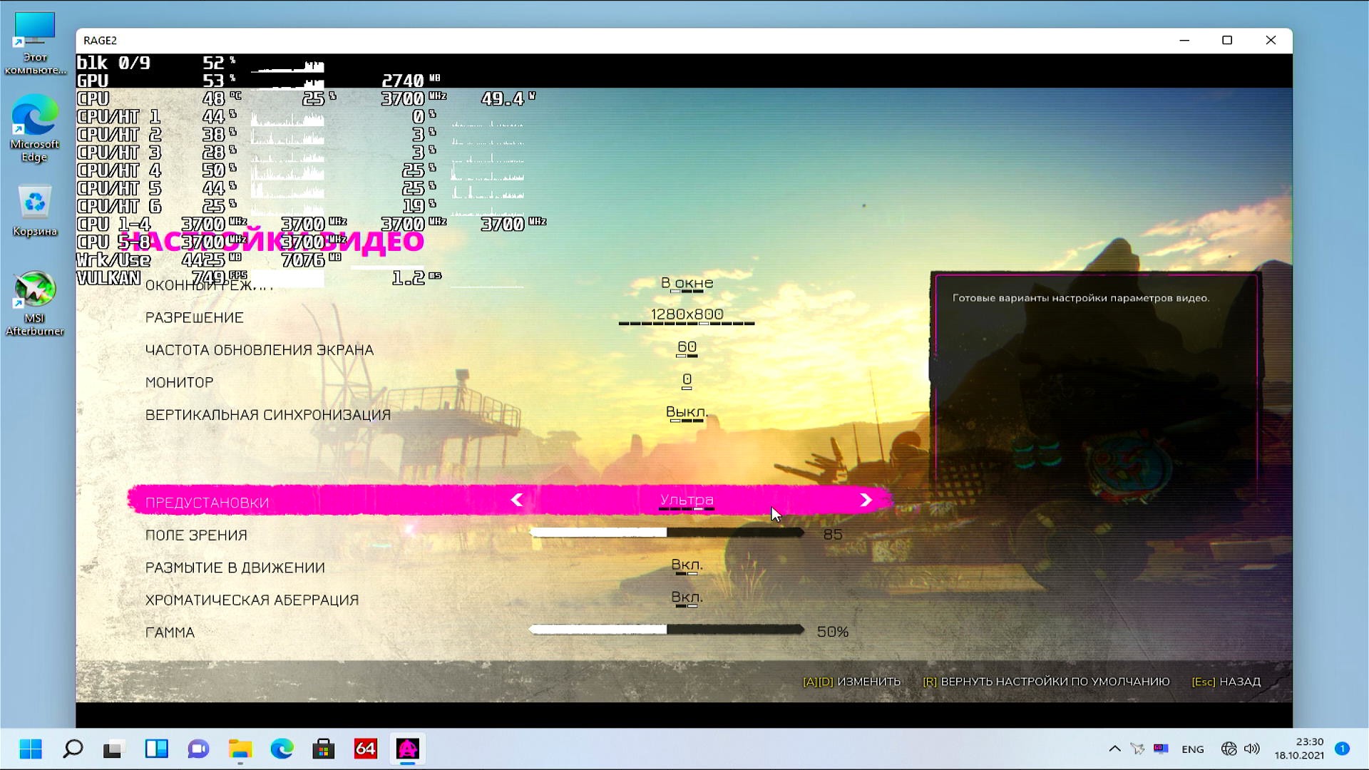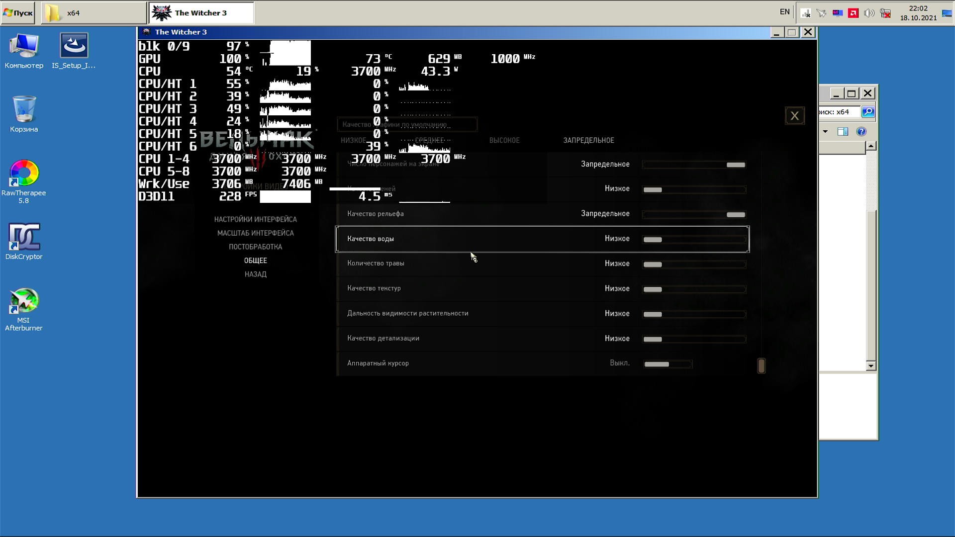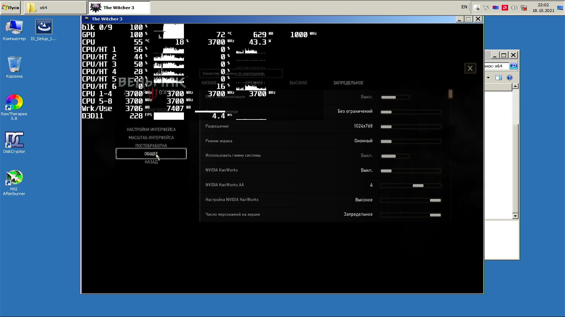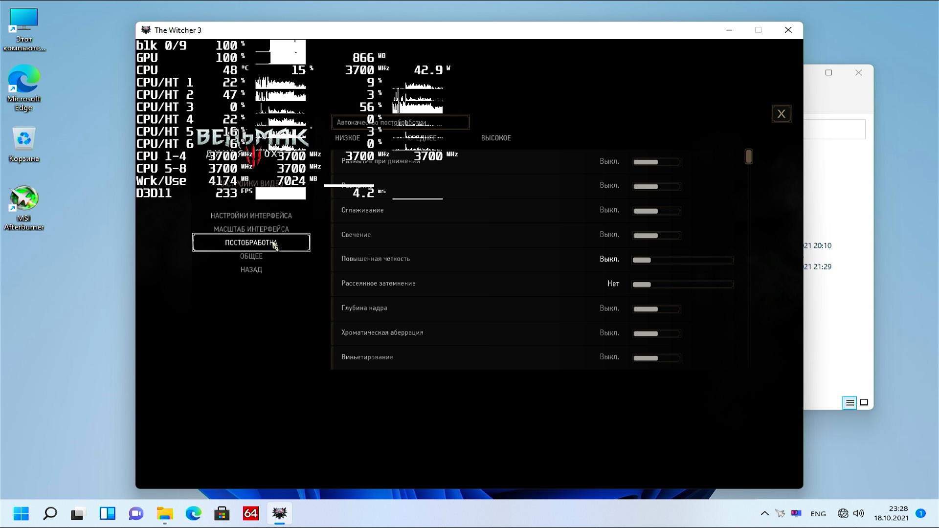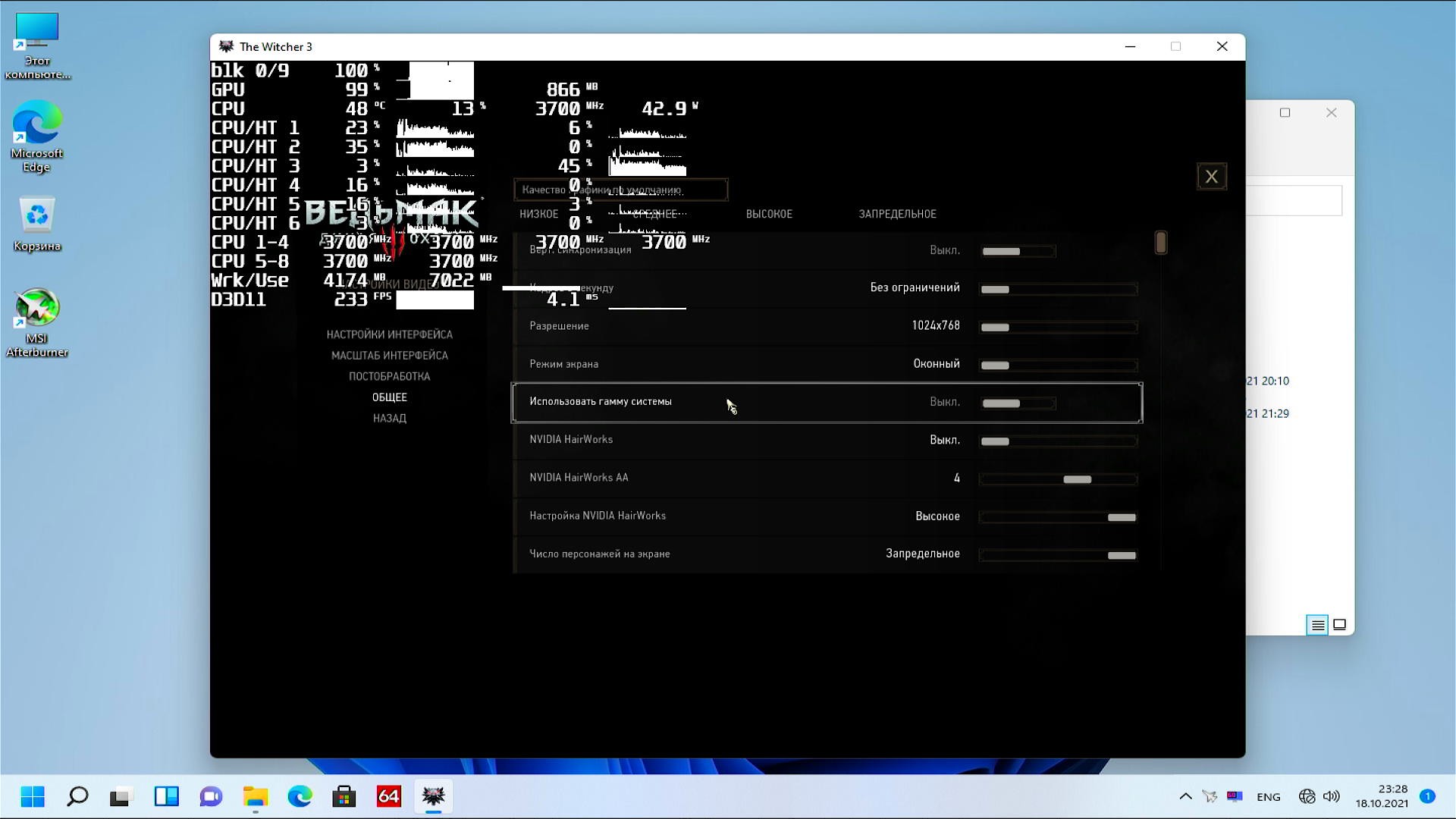 Я конечно забыл включить затенение оверлея в настройках RivaTuner при тестировании Windows 10/11, но я его проверил на Windows 11 и оно не способно уронить производительность заметно, так что дело с производительностью точно не в этой настройке оверлея.