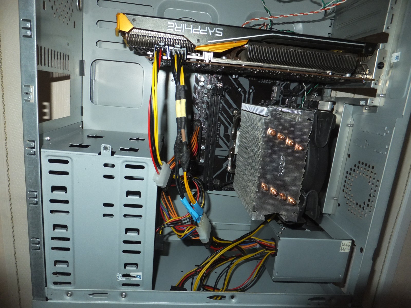 В итоге система была собрана на основе MicroATX блока питания STC DELUX AP-450 Micro, состоит она из Gigabyte B450M H, Ryzen 7 2700X и Sapphire R9 290 Tri-X, хотя изначально я устанавливал GTX 750 Ti так как она не требует дополнительное питание.