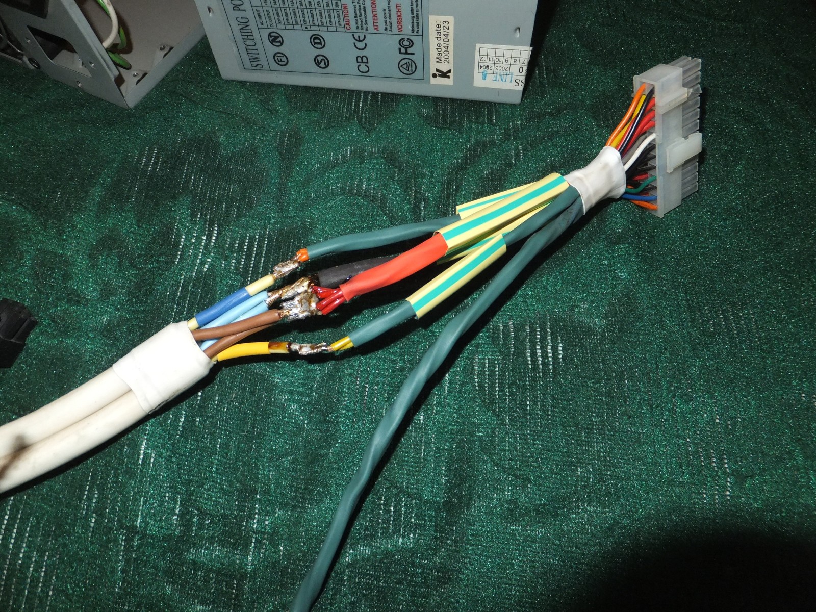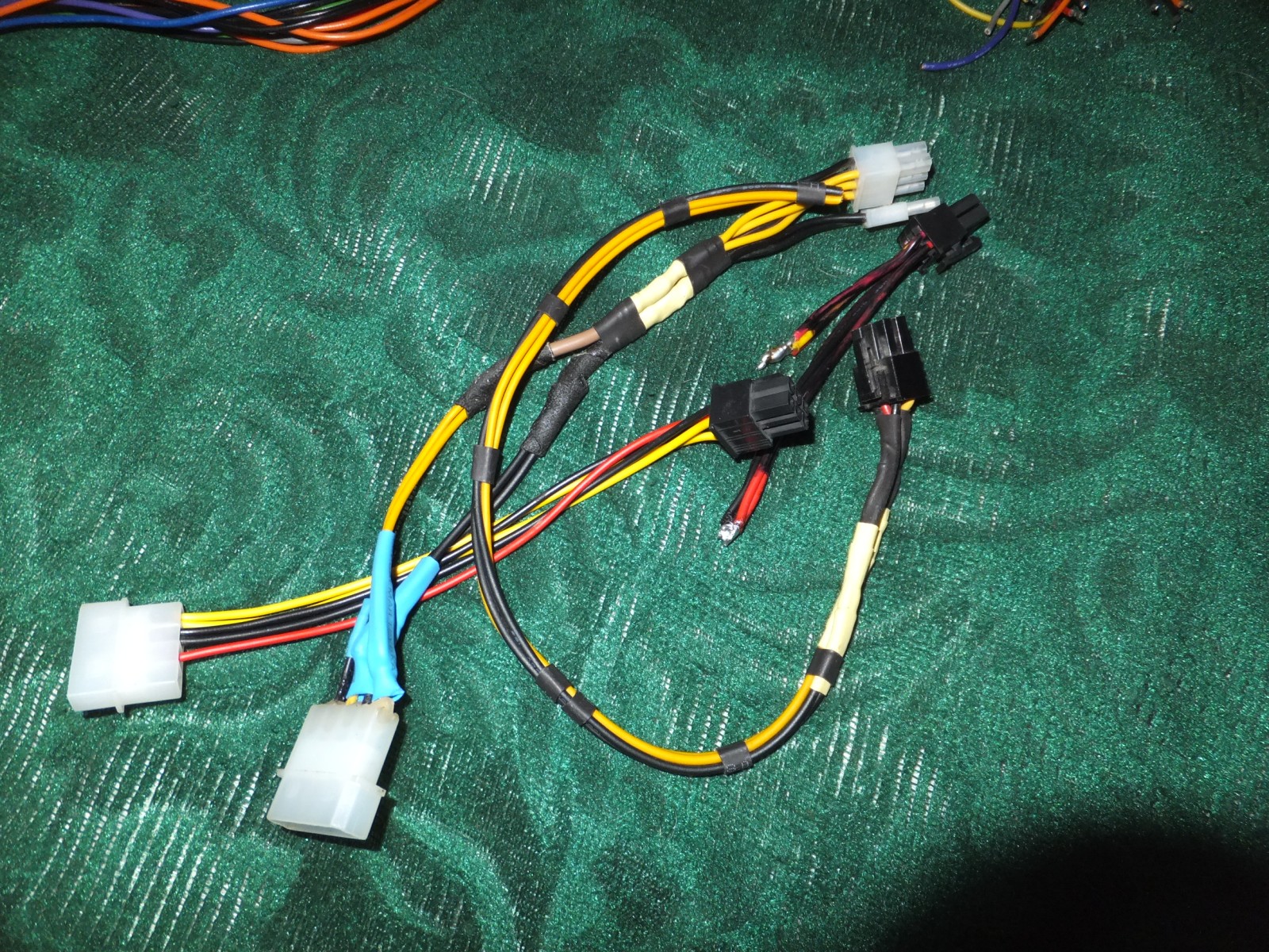 Для питания видеокарты я нашел старые отростки от моего основного Chieftec GPS700-A8, 6 квадратные желтые отрезки я не стал удалять и просто спаял с новыми проводами, главное не забывать делать пометки на концах проводов если сами провода без цветовой маркировки.