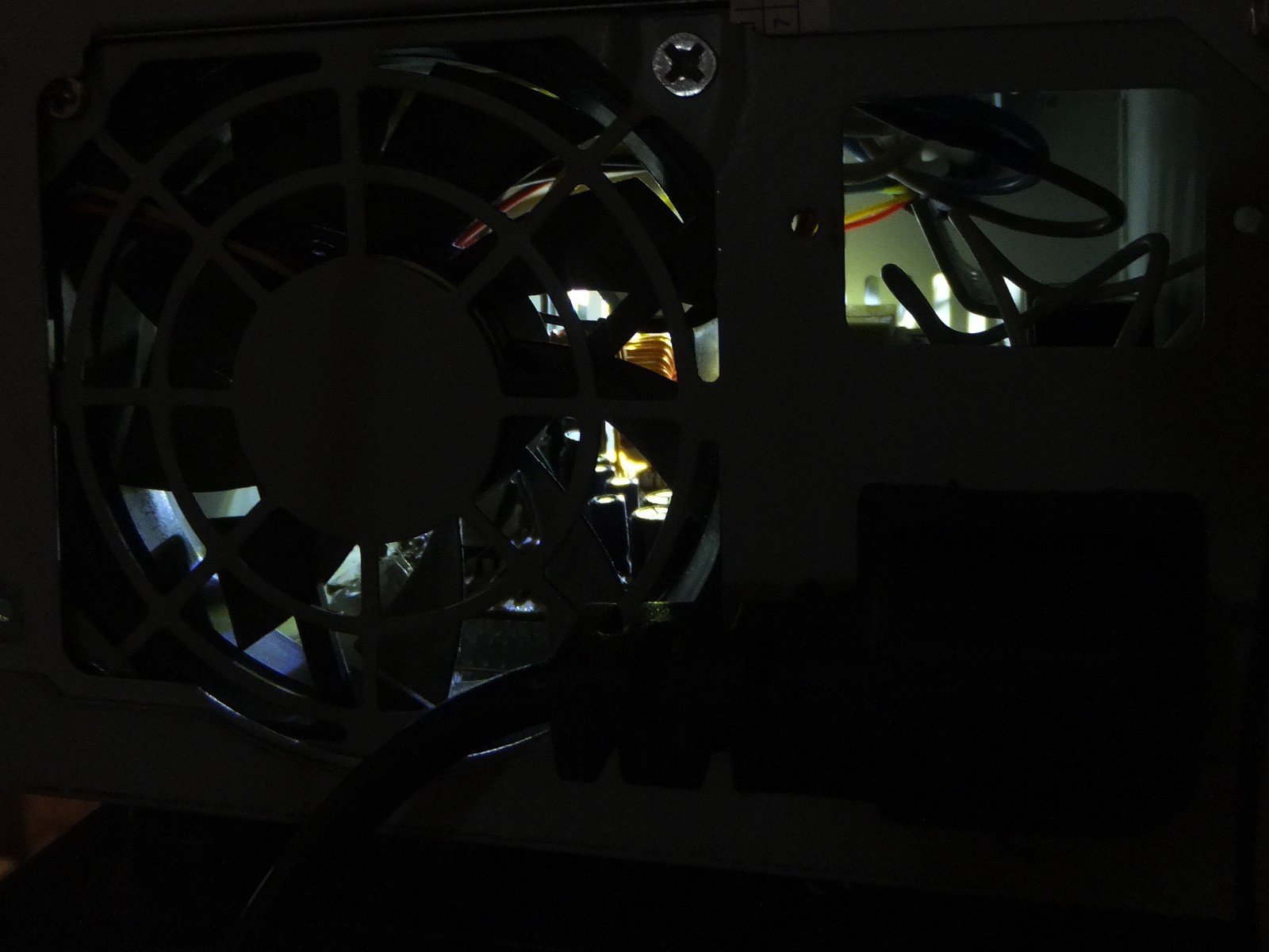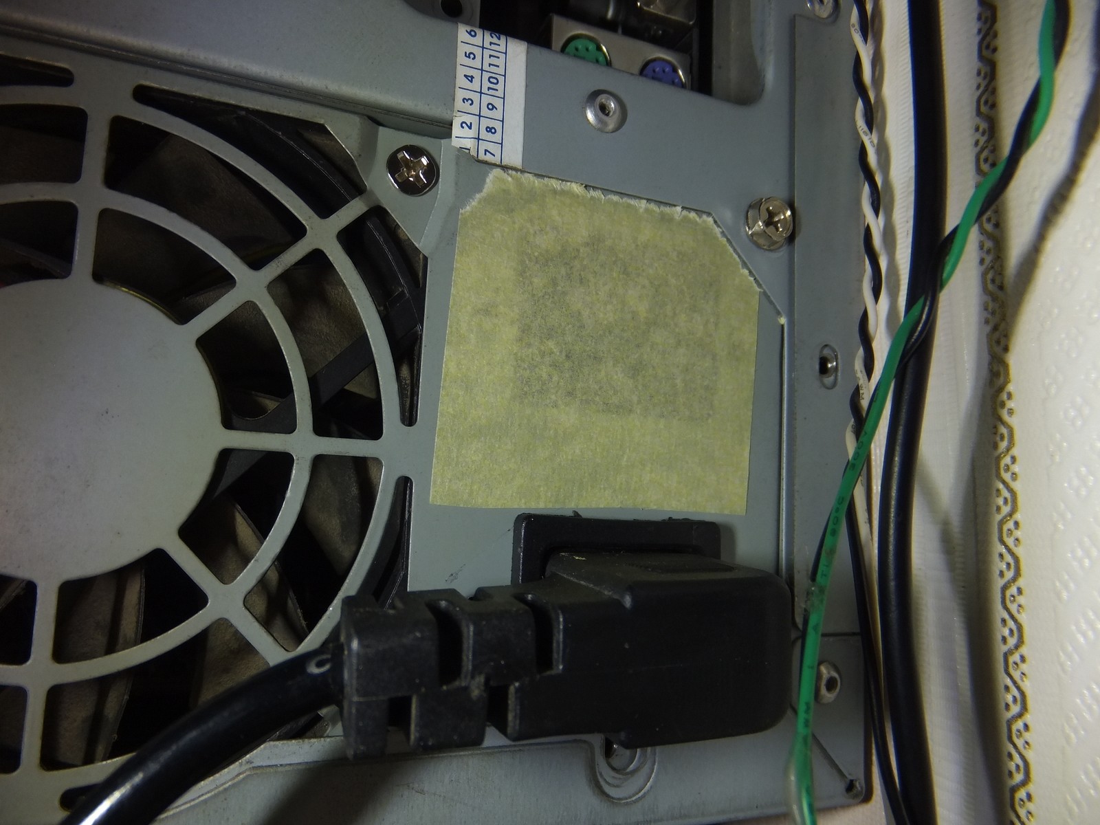 Воздух из блока питания вытягивался едва теплый, но сделать точные замеры довольно проблематично, а еще нужно закрыть отверстие на всякий случай, малярная лента неплохо справилась с этой задачей.