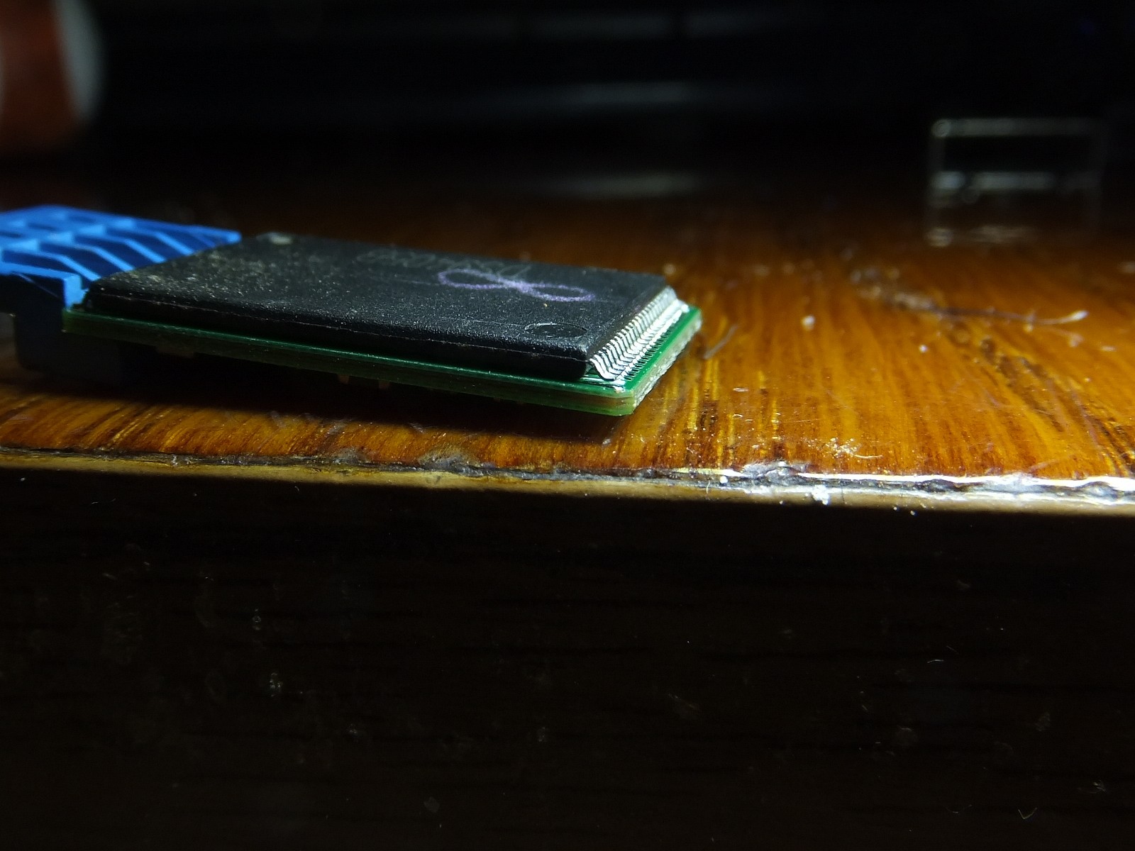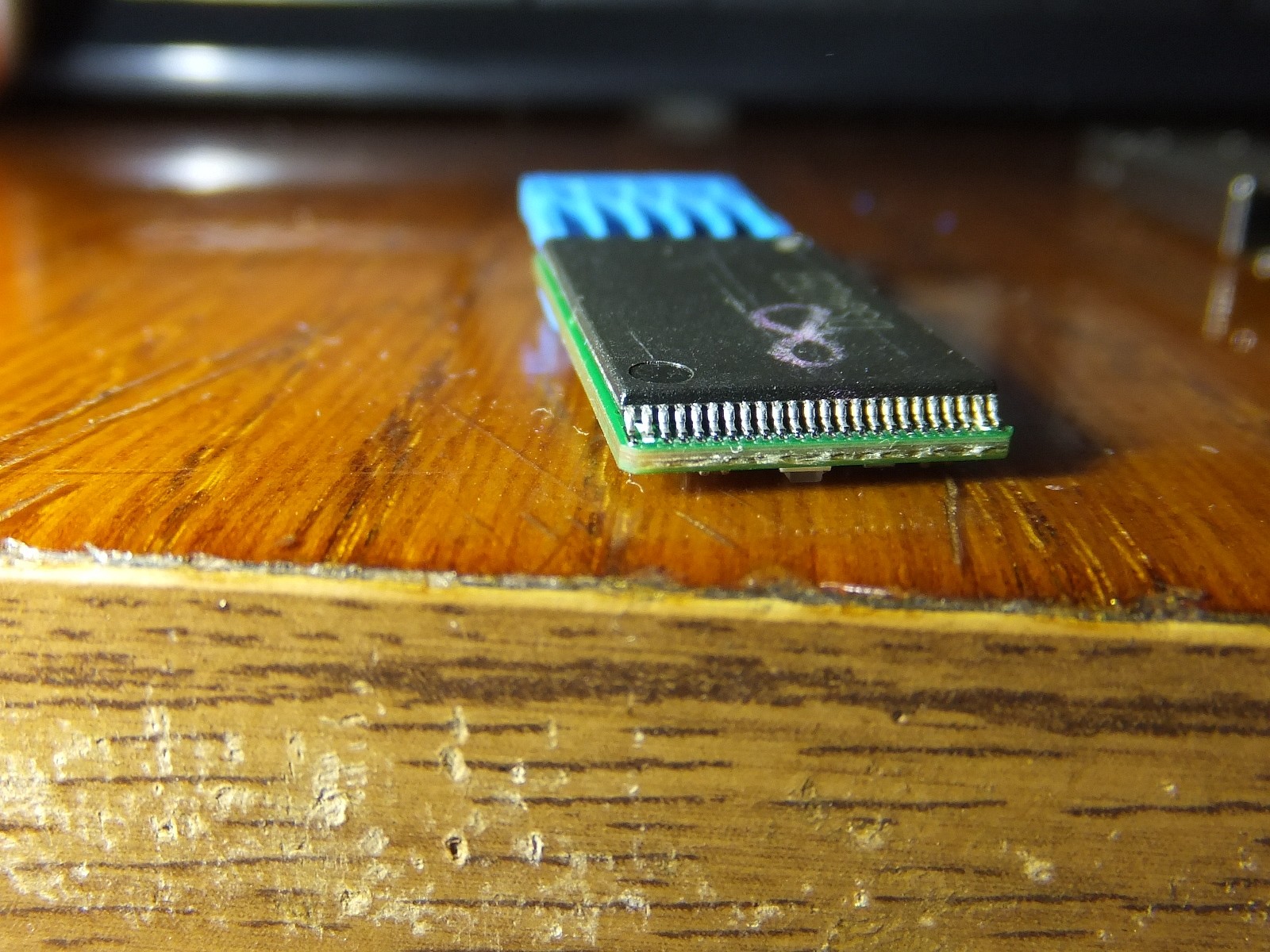 На камеру плохо видно, но у микросхемы памяти не пропаяна одна ножка, а пайка контроллера имеет очень низкое качество, на глаз конечно же видно многократно лучше, но я старался показать в макросъемке...
