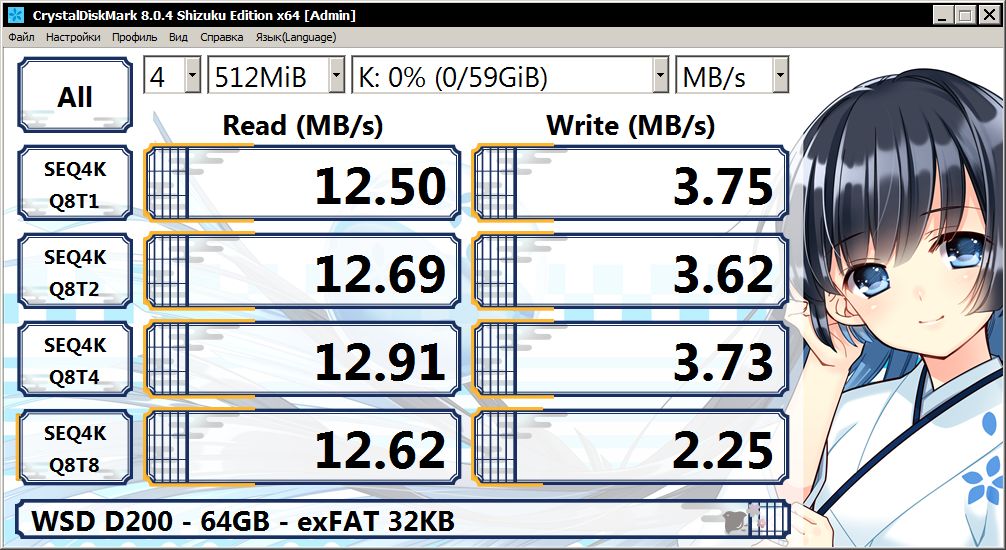 Ради эксперимента я отформатировал накопитель на 64 ГБ в файловую систему exFAT при размере кластера 4 КБ, и получил закономерное снижение скорости как записи, так и чтения, с накопителем на 16 ГБ я не заметил существенных изменений при уменьшении размера кластера.