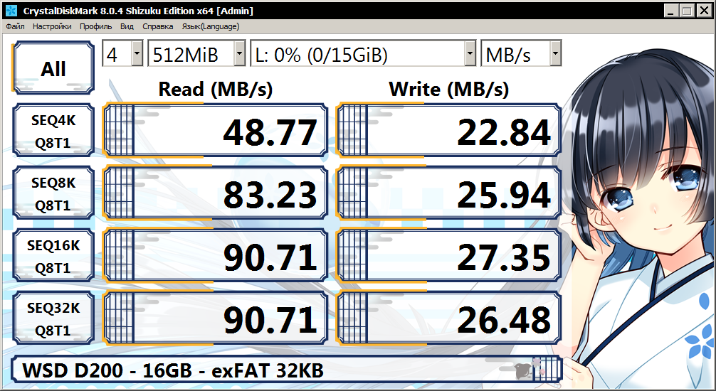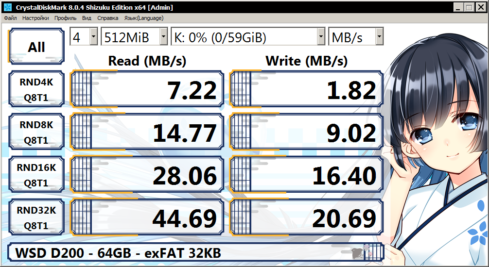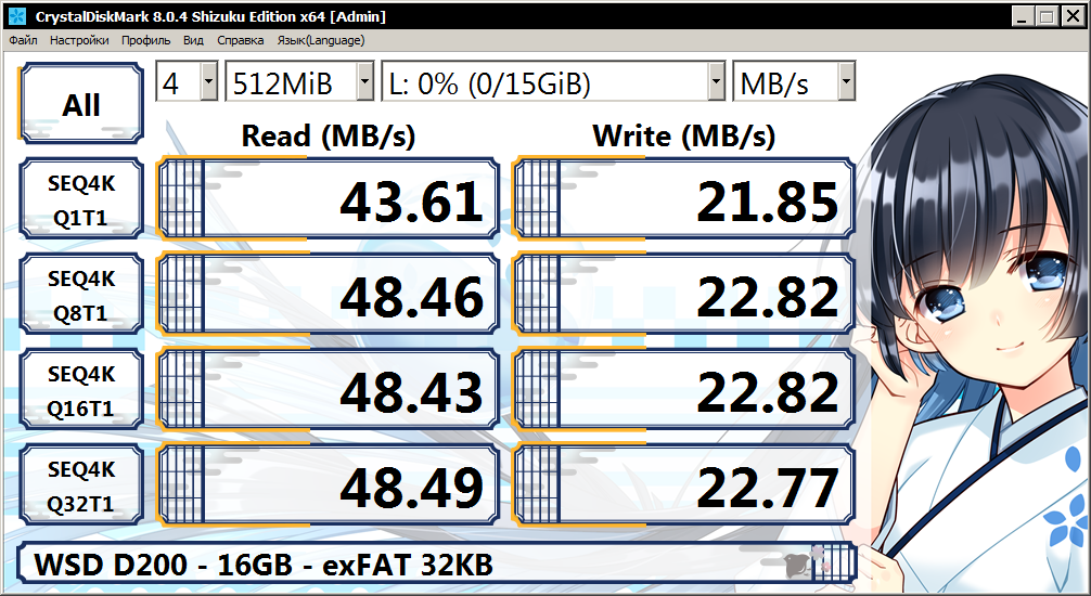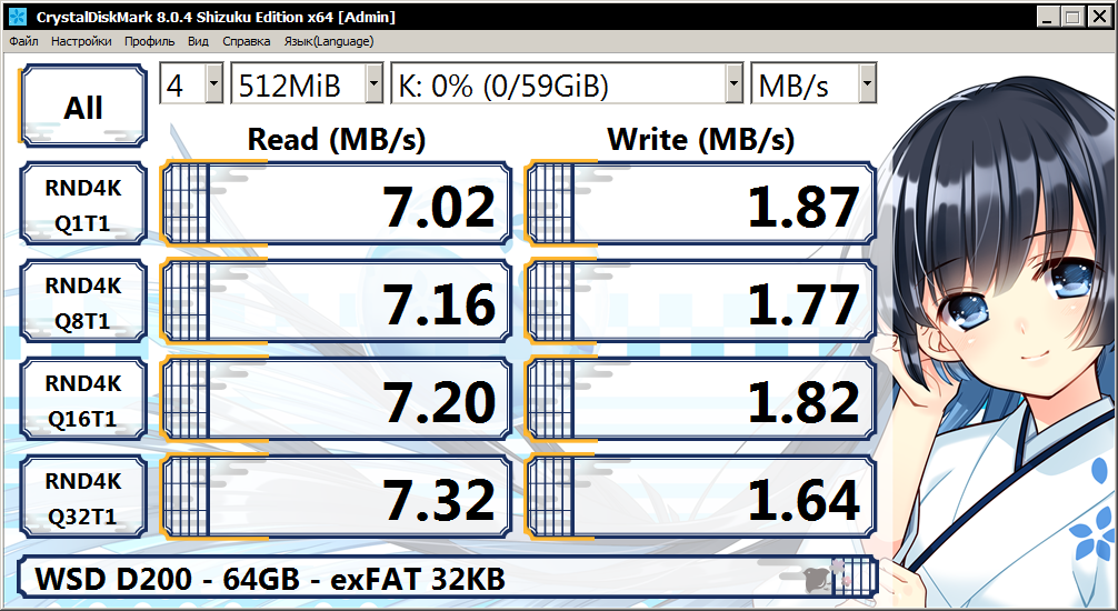 Обращаю внимание, хоть накопитель объёмом 16 ГБ и получил результаты на уровне 0.2 MB/s в режиме RND4K (CrystalDiskMark), реальная же скорость записи мелких файлов вышла на уровне почти в 1 MB/s, а все потому что драйвер файловой системы по возможности старается писать данные в линейном режиме на накопители.