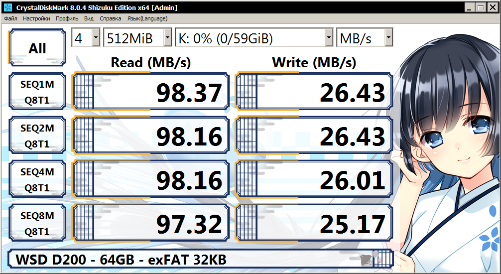 У меня на фоне во время теста был запущен Chrome и Steam, во время теста 16 ГБ накопителя я спокойно пользовался браузером и это не отражалось никак на графике скорости, но во время теста 64 ГБ накопителя мне пришлось вообще оставить мышку в покое и свернуть все окна, чтобы получить более-менее "ровный" график, даже обновление страницы в браузере создавало серьезные просадки...