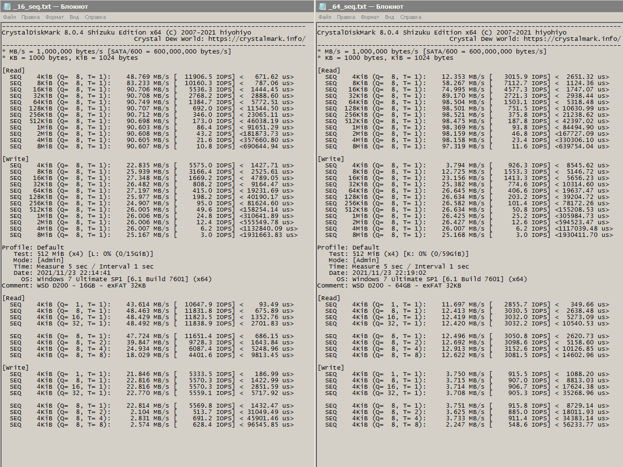 Внимание! Результаты могут зависеть от файловой системы накопителя! Чтобы объективно сравнить я отформатировал их в файловую систему exFAT с размером кластера 32 КБ.