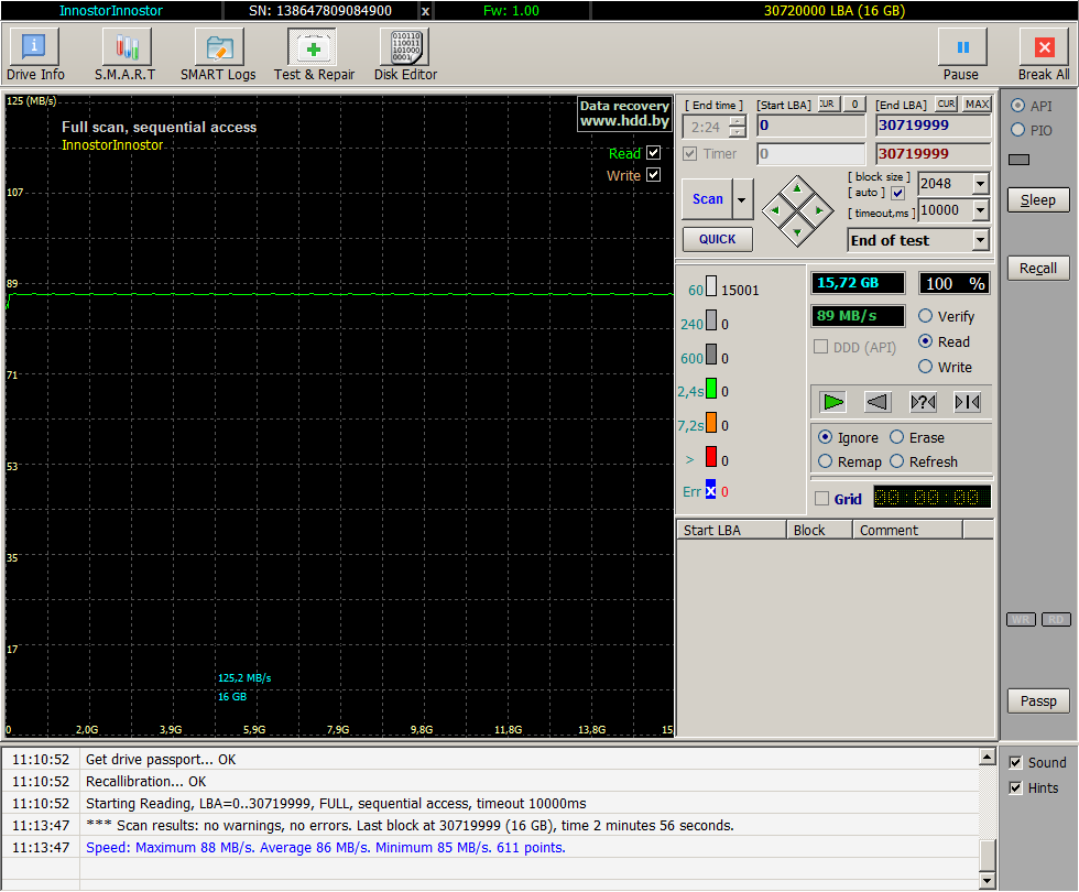 Данный тест проверяет ёмкость накопителя, если хитрый производитель решил использовать дешевую 4 ГБ микросхему для флешки на 16 ГБ, данный тест это выявит, жаль такого софта нет для выявления обмана производителей фотокамер...