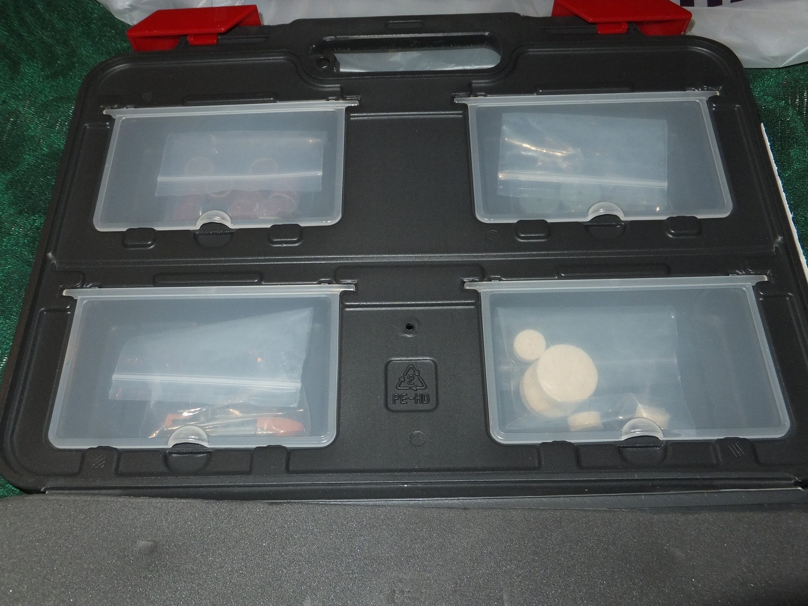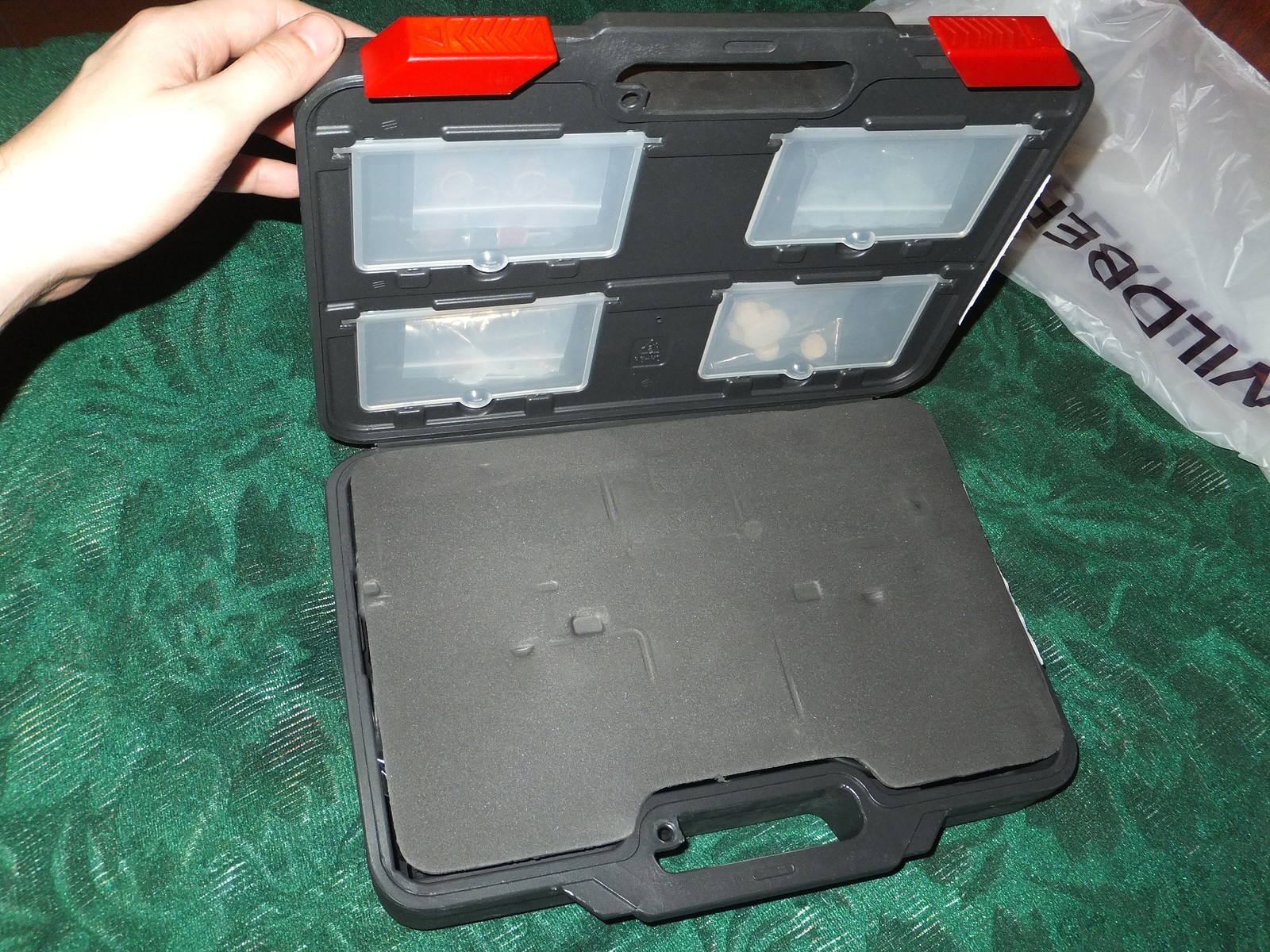 В кейсе есть 4 удобных отсека для оснастки, а сама базовая комплектация сложена в пакетики.