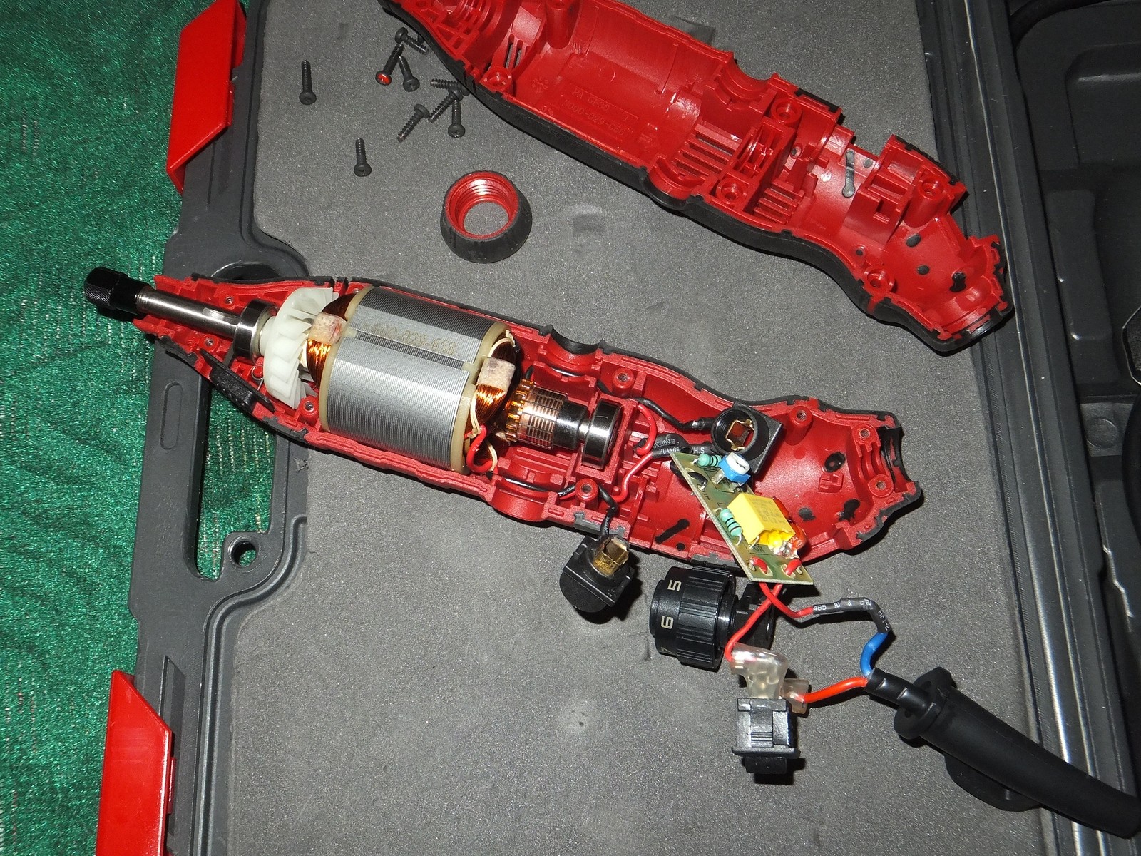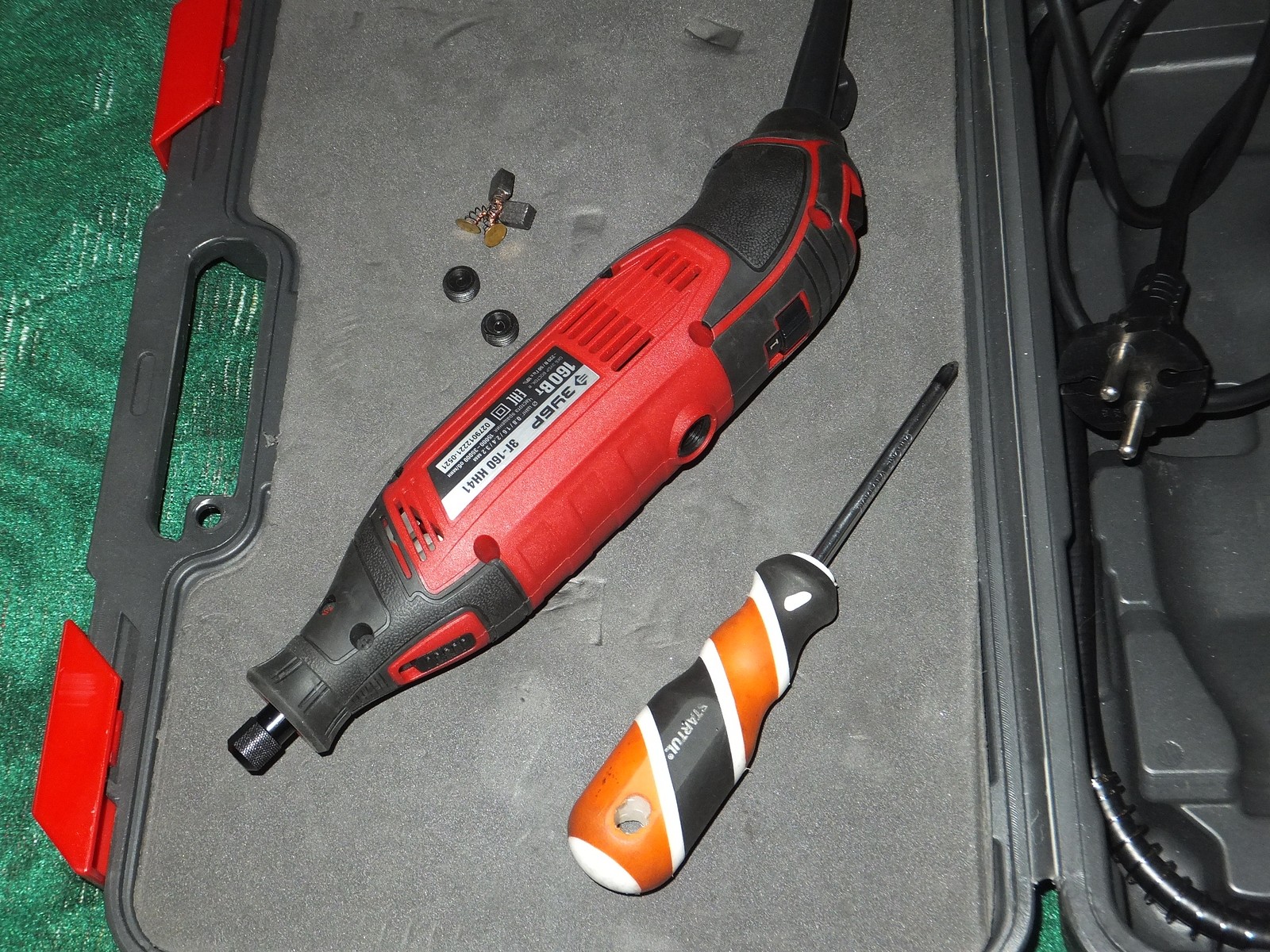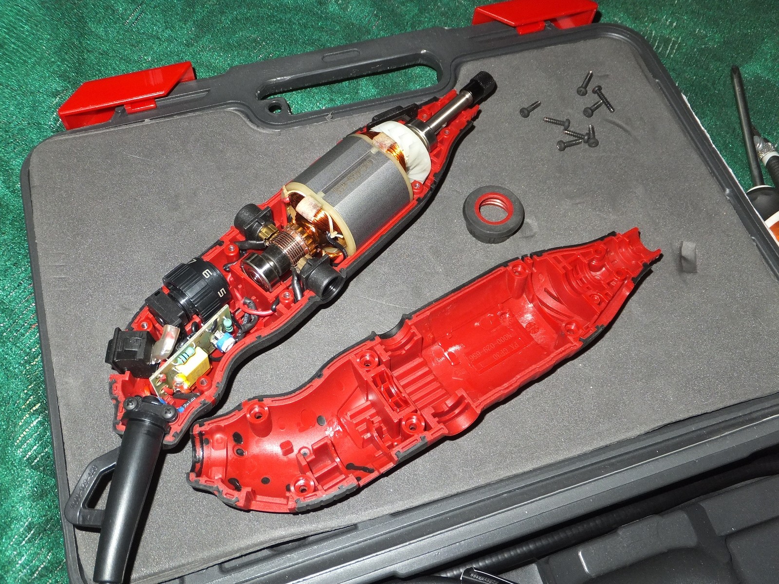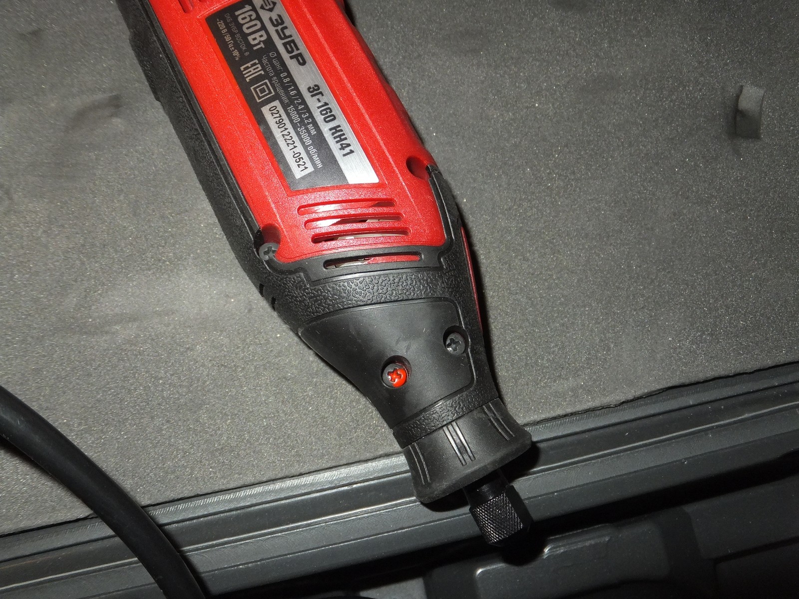 Есть винты для доступа к щеткам, сам корпус хорошо держится в руке, никаких козявок присущих дешевому литью и закупоренных отверстий, хотя этот гравер из бюджетного сегмента.