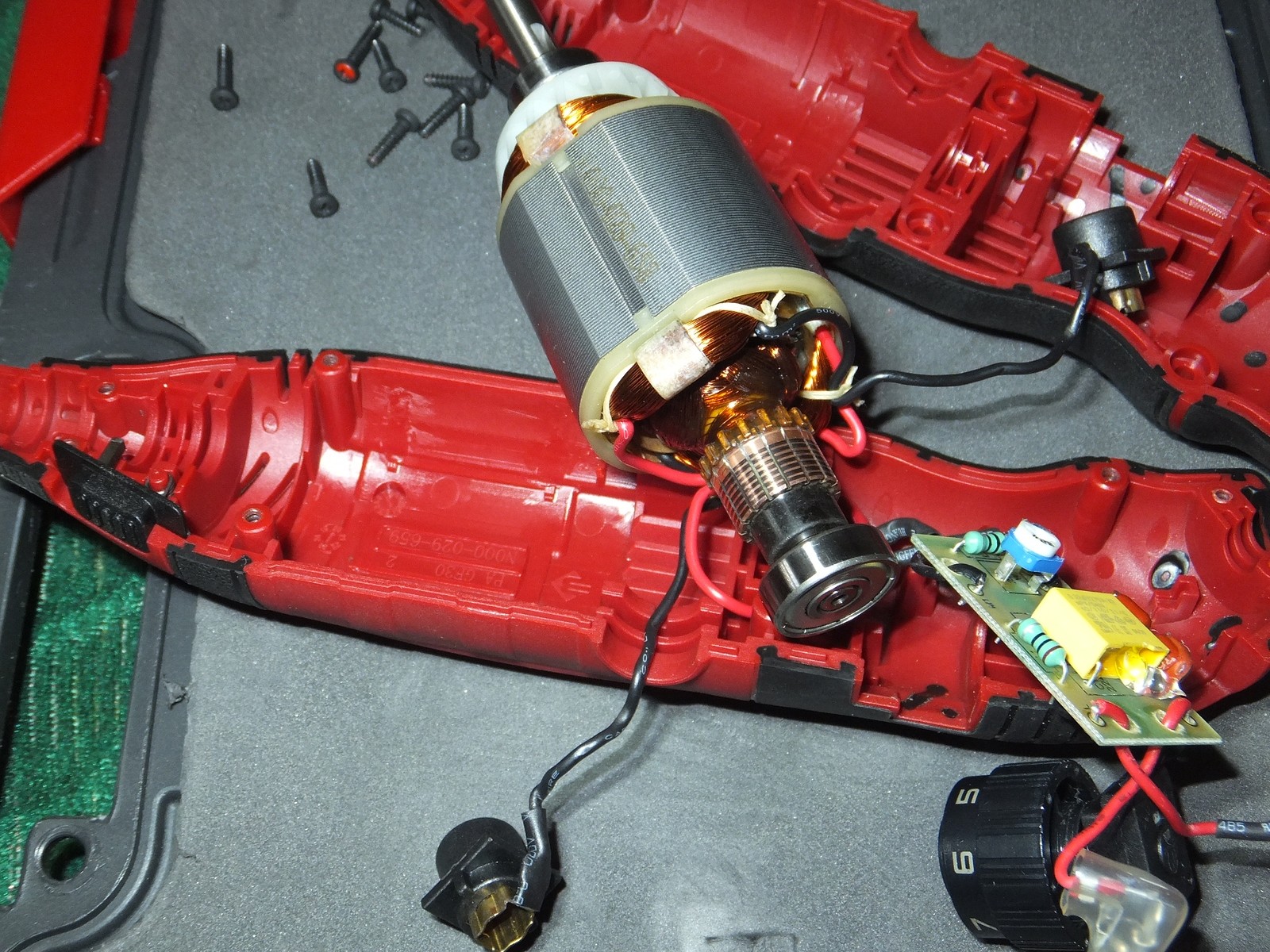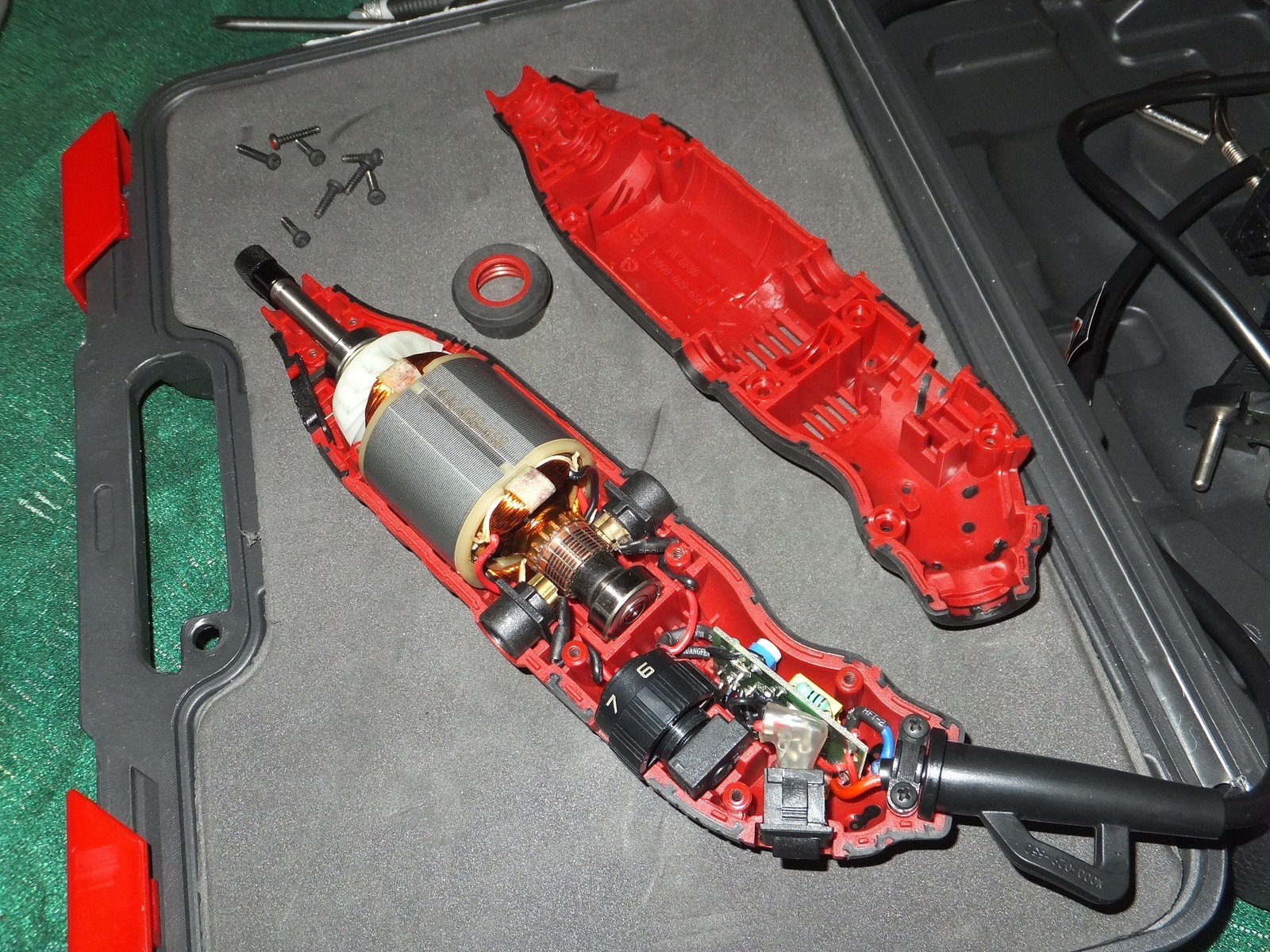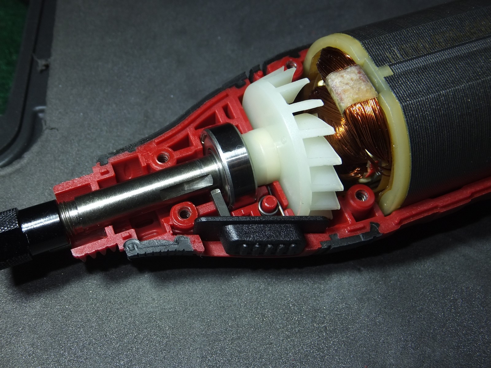 Есть винты для доступа к щеткам, сам корпус хорошо держится в руке, никаких козявок присущих дешевому литью и закупоренных отверстий, хотя этот гравер из бюджетного сегмента.