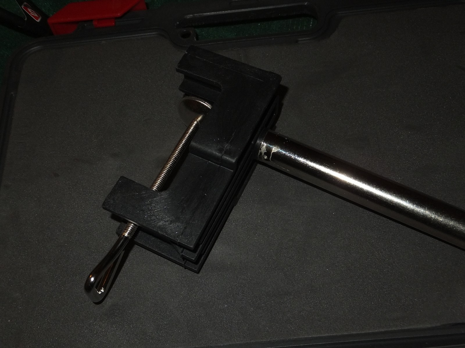 Струбцина позволяет закрепить телескопический штатив для гравера в двух направлениях, выглядит неплохо, однако струбцина скользит по старому лакированному столу, никаких прокладок нет, но и при этом не оставляет царапин.