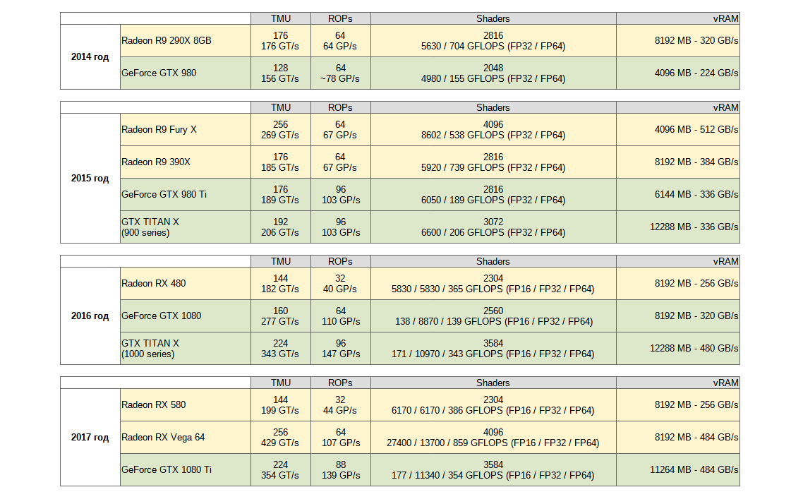 Очередной прыжок для обеих компаний, вышли R9 290X и GTX 780 Ti, но следующий год оказался застойным, из интересного вышли R9 290X 8GB и GTX 980.