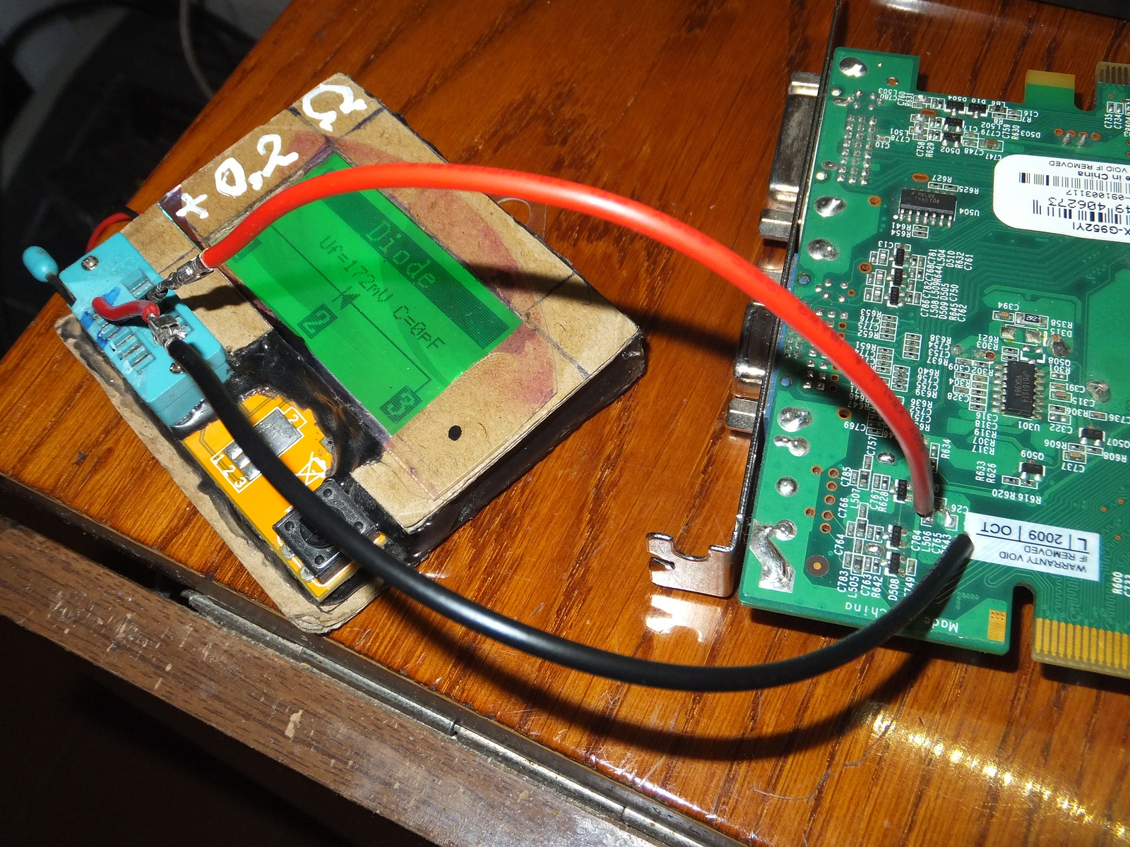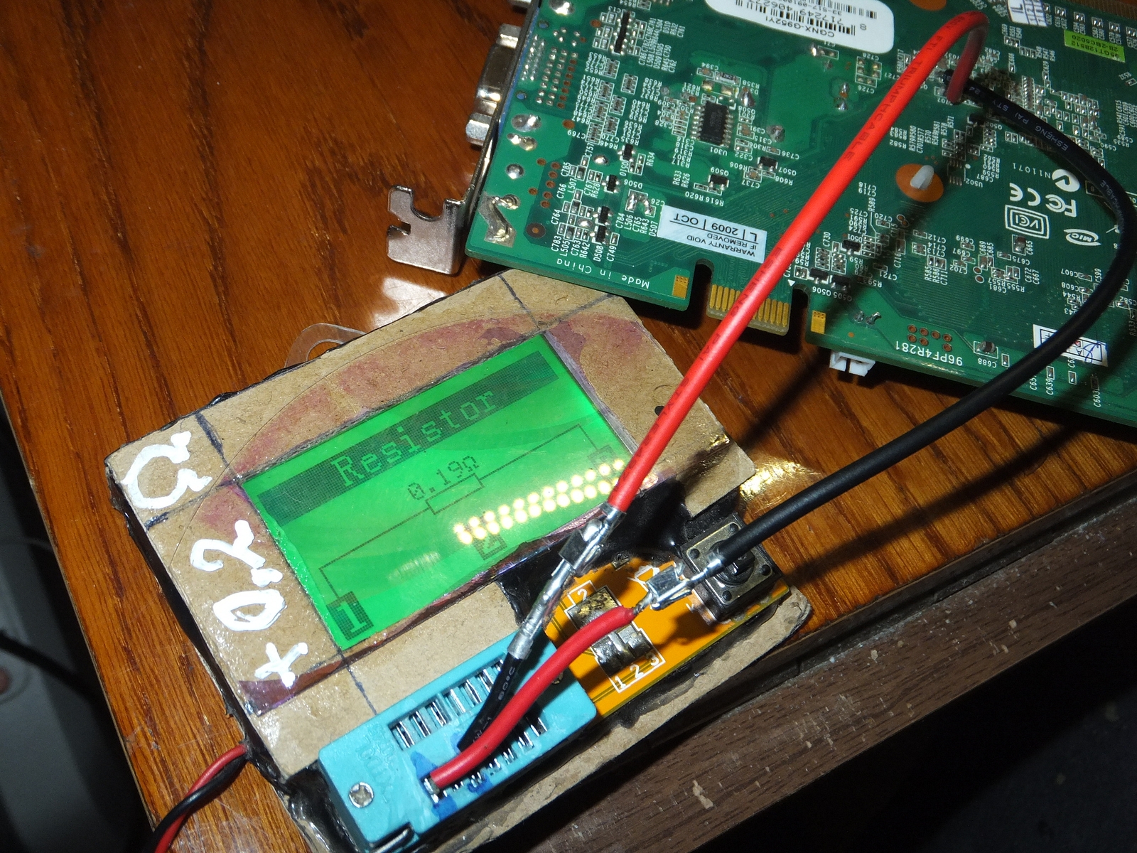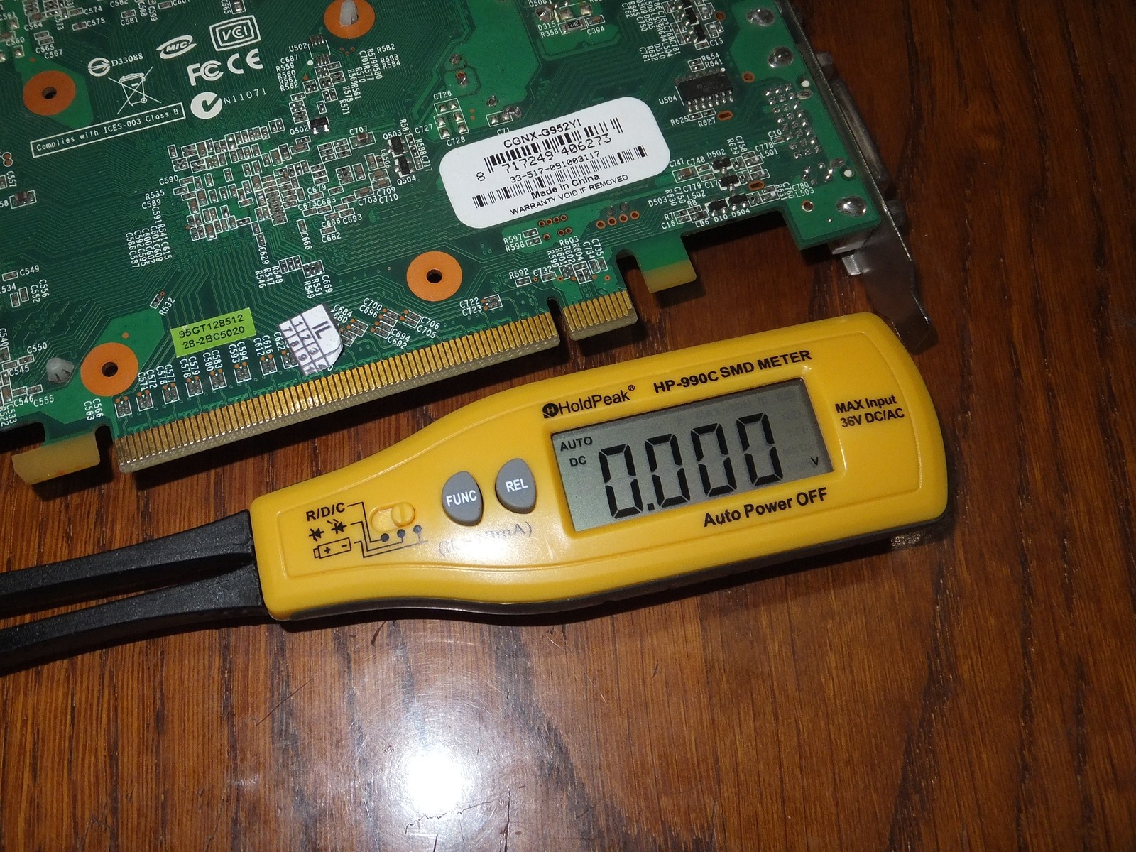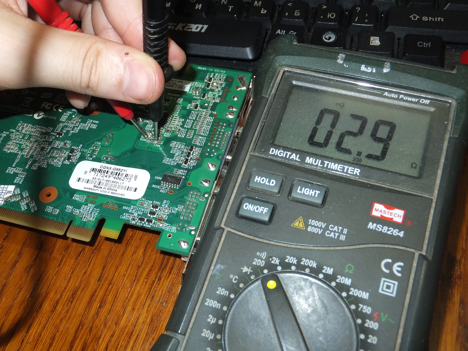 В качестве экземпляра для опытов я достал нерабочую nVidia GeForce 9500 GT, с первым попавшимся резистором тестер справился, хотя по идее должно быть 2.2 Ом, но учитывая что резистор не выпаивался из нерабочей видеокарты...