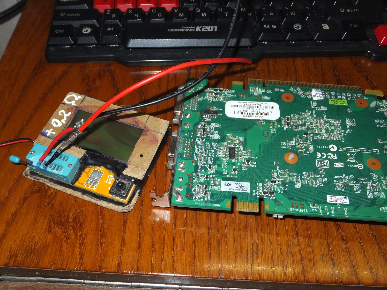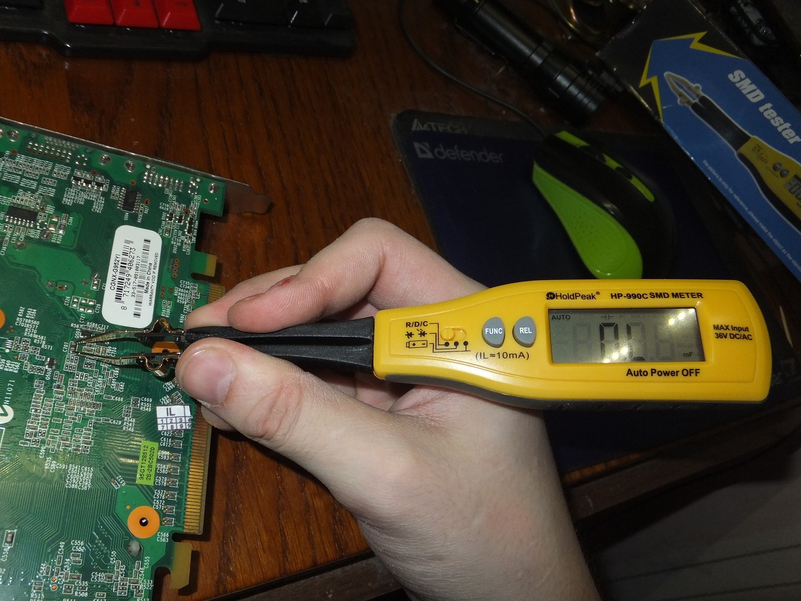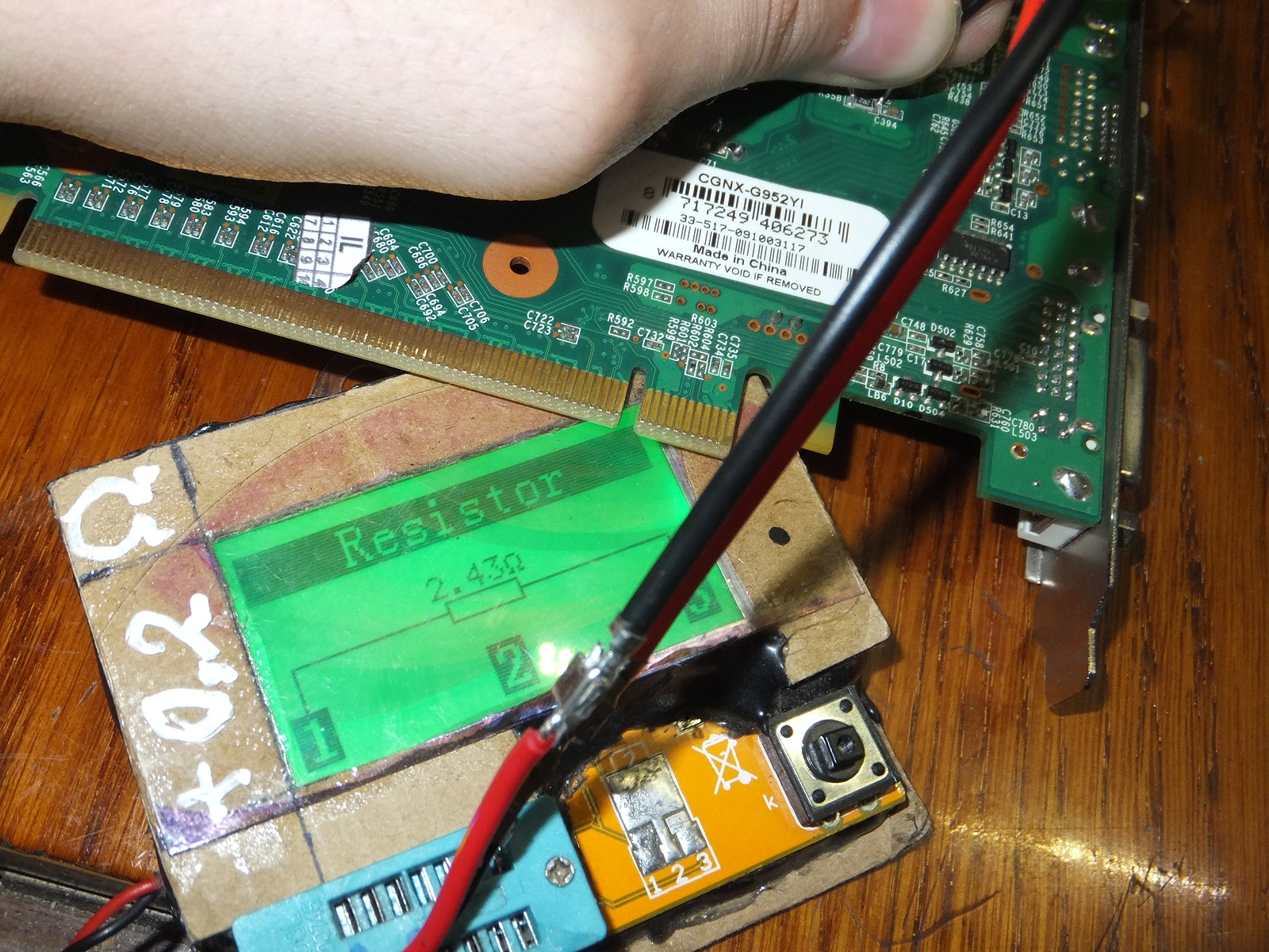 В качестве экземпляра для опытов я достал нерабочую nVidia GeForce 9500 GT, с первым попавшимся резистором тестер справился, хотя по идее должно быть 2.2 Ом, но учитывая что резистор не выпаивался из нерабочей видеокарты...
