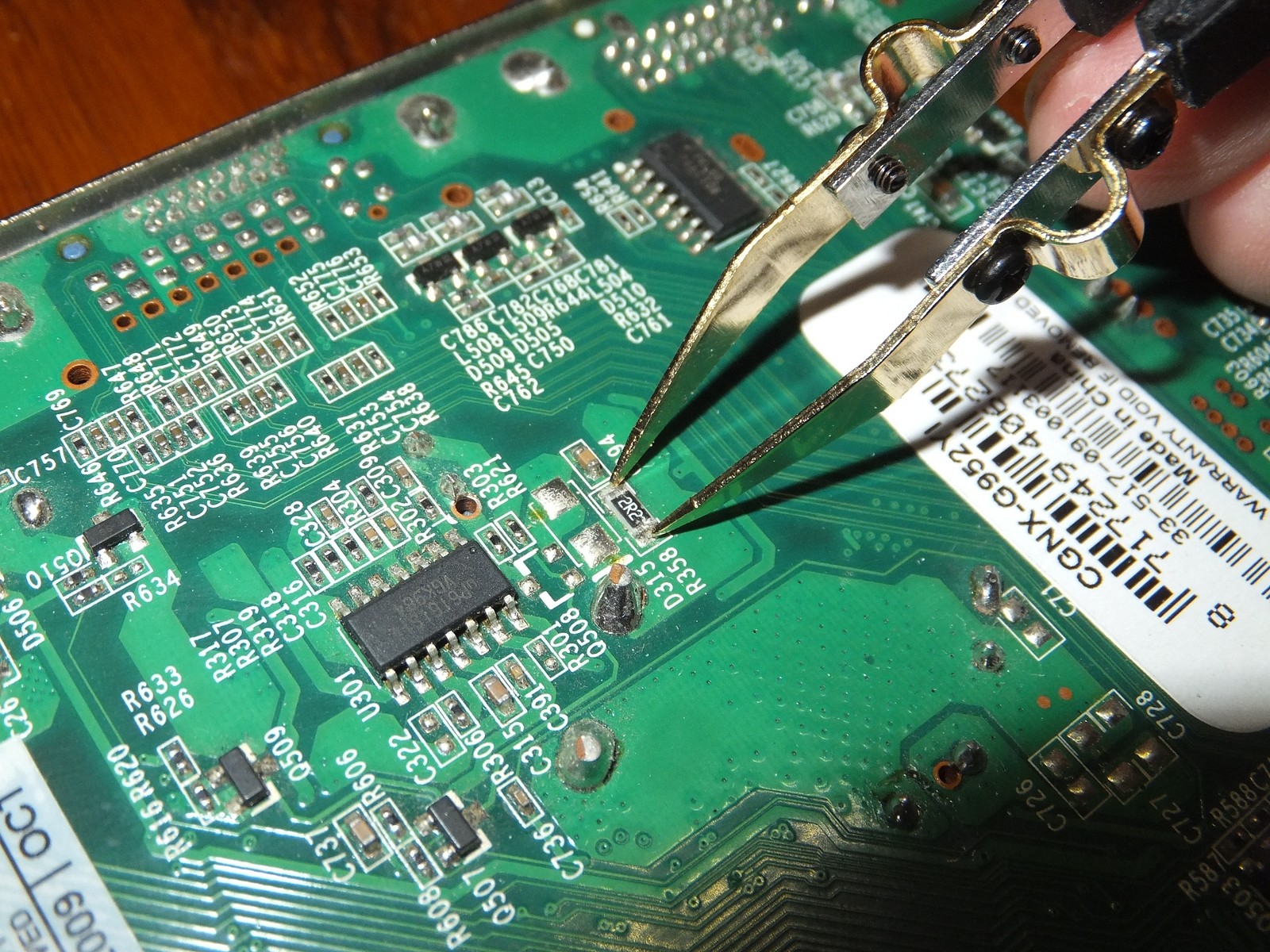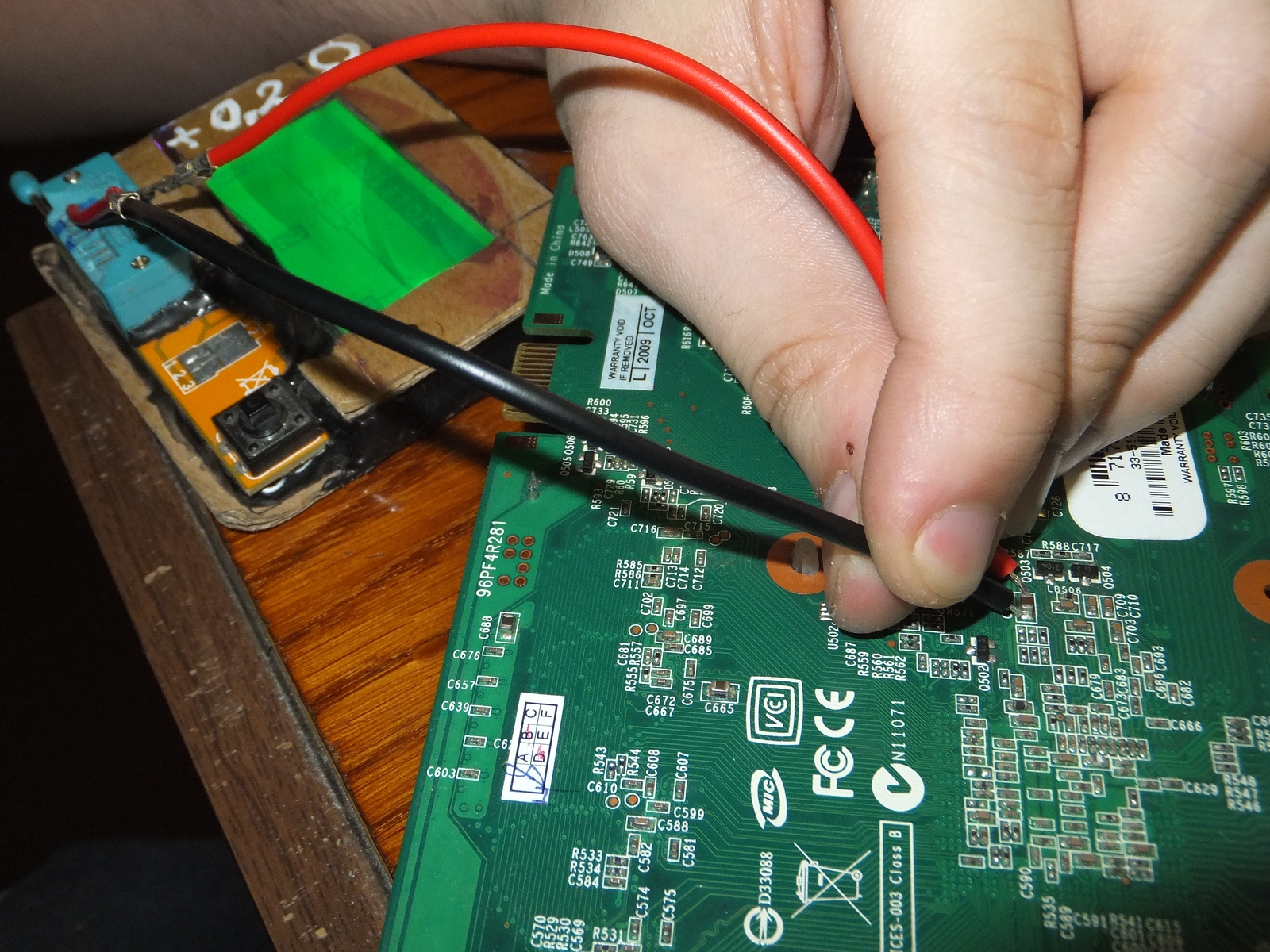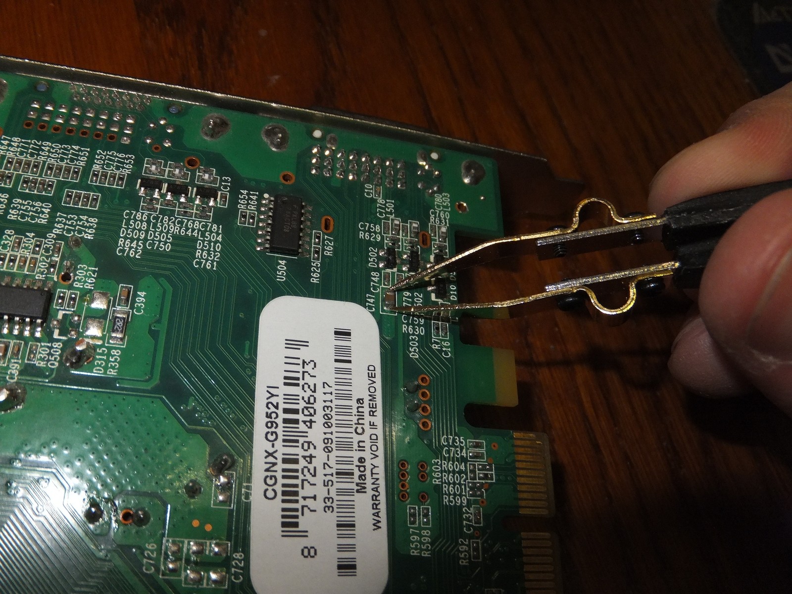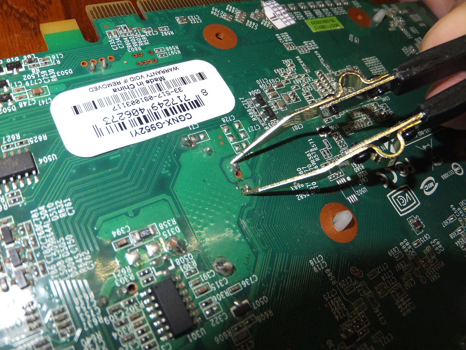 В качестве экземпляра для опытов я достал нерабочую nVidia GeForce 9500 GT, с первым попавшимся резистором тестер справился, хотя по идее должно быть 2.2 Ом, но учитывая что резистор не выпаивался из нерабочей видеокарты...