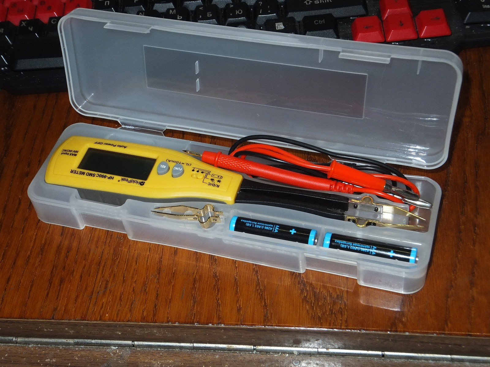 Комплект состоит из SMD тестера, есть два стандартных щупа, две запасные иглы пинцета позолоченные, батареек в комплекте нет из-за правил грузоперевозок, но в кейсе есть место для двух батареек формата AAA.