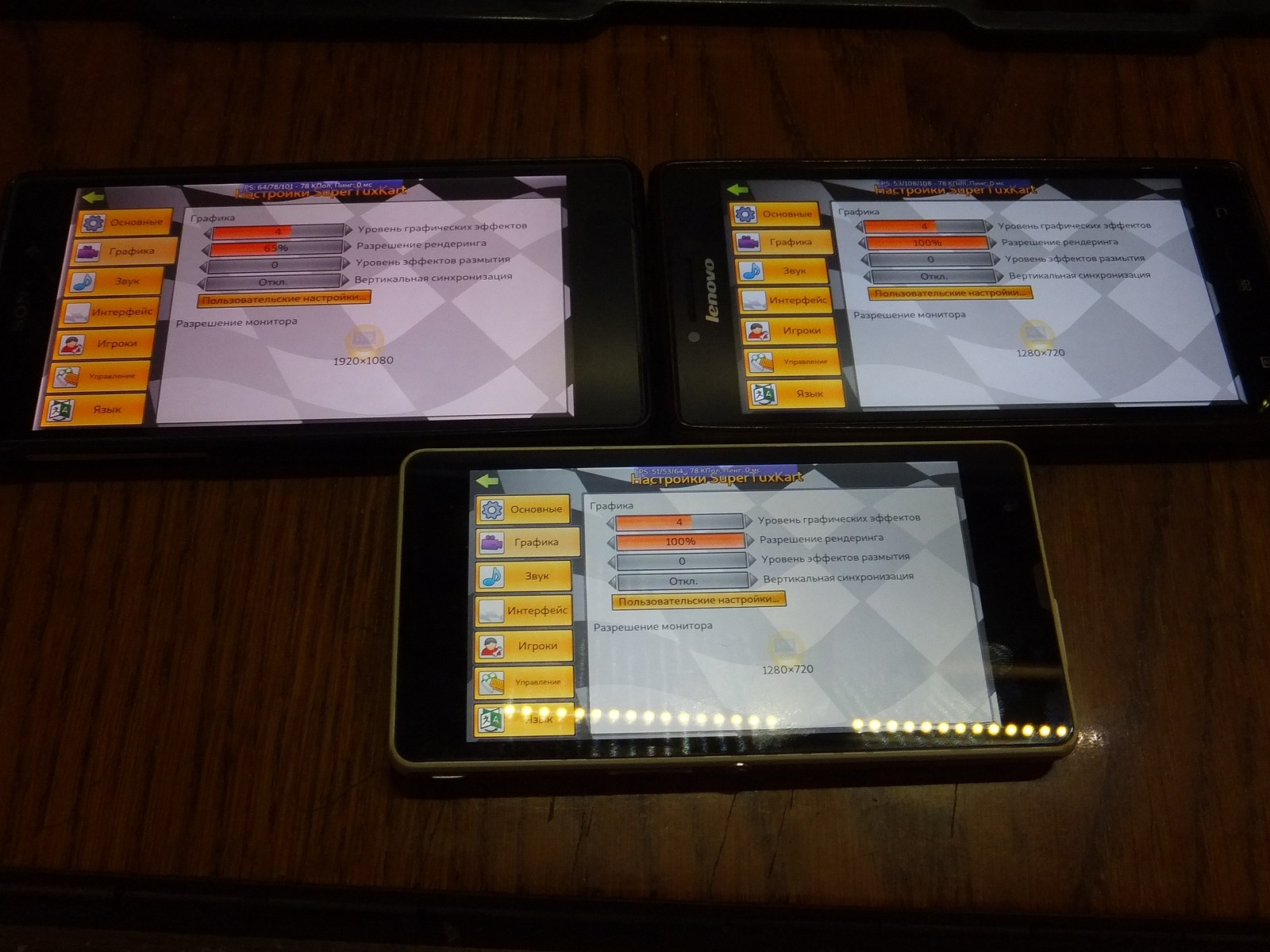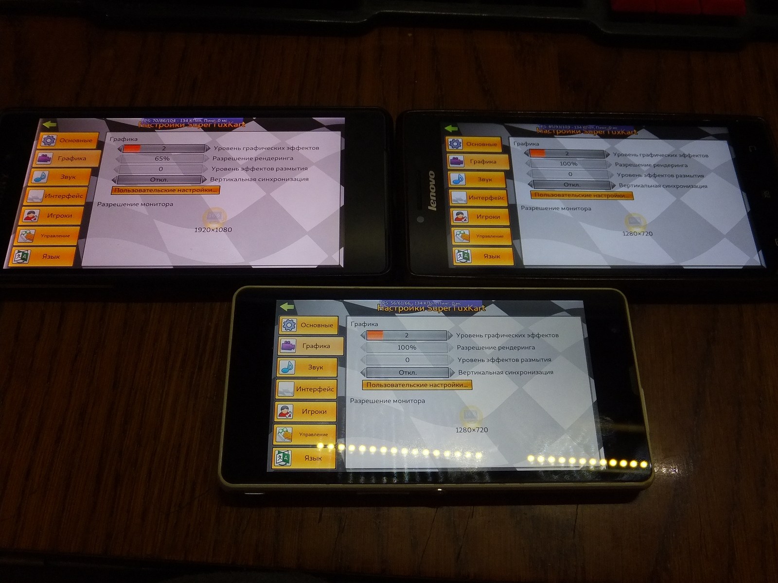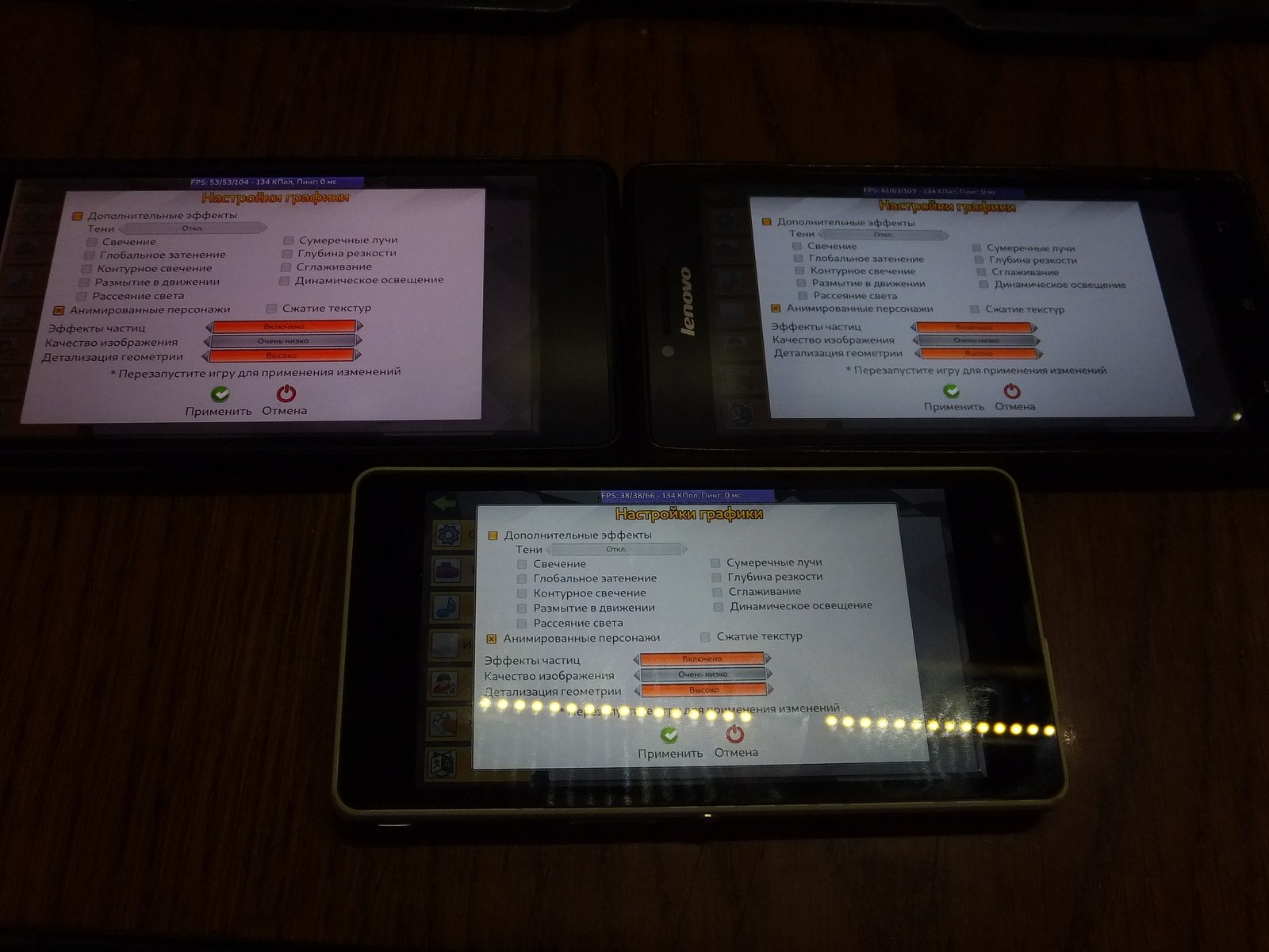 Так как у Lenovo P70-A и Sony C5503 разрешение экрана 1280x720 я установил 100% разрешение (921 600 пикселей), а для Sony Z2 установил 65% (1248x702 - 876 096 пикселей) ибо разрешение экрана 1920x1080, при этом я следил чтобы визуально детализация оказалась на одинаковом уровне и графические процессоры выполняли примерно одинаковый объем работы над графикой в игре.
