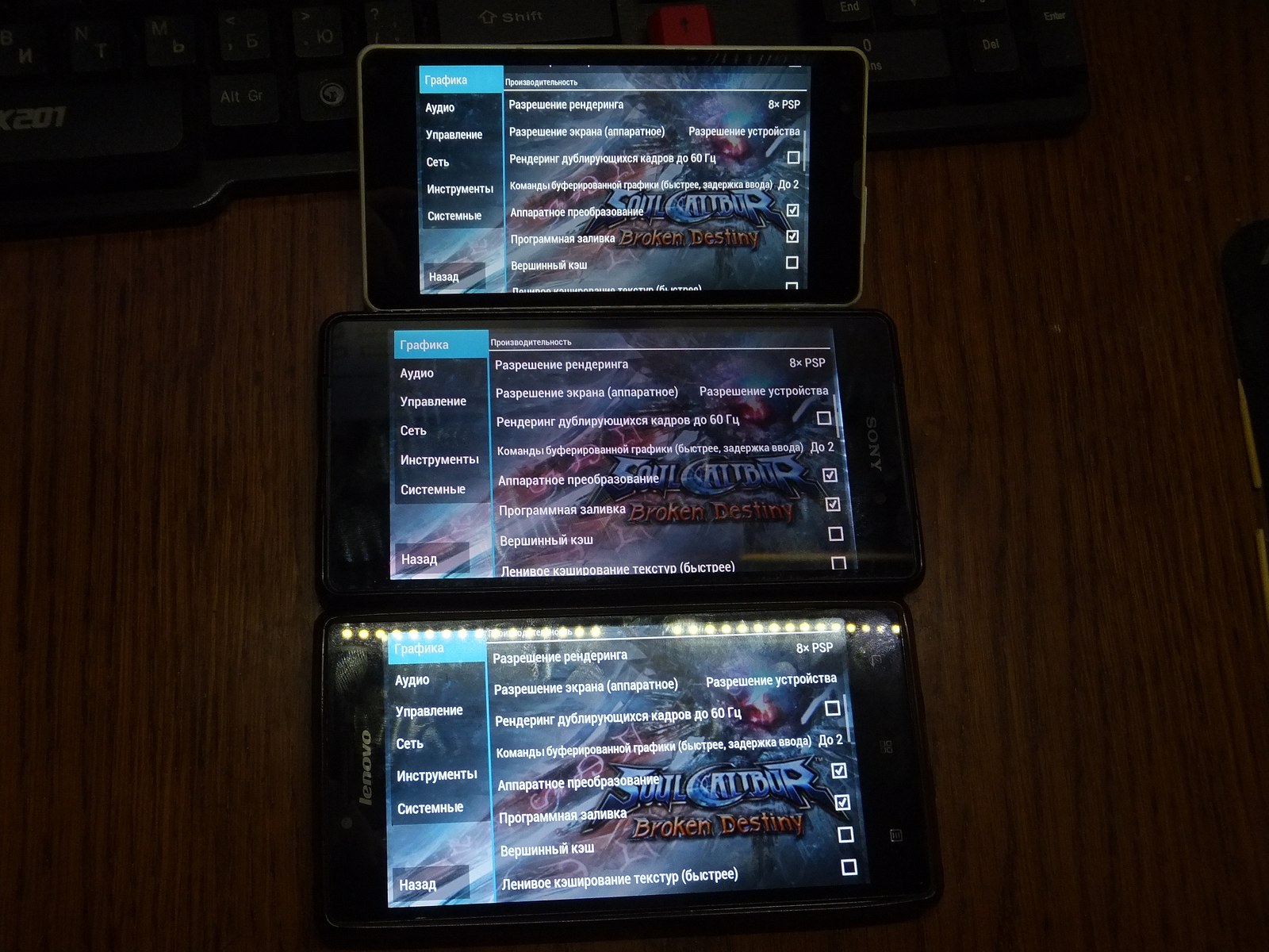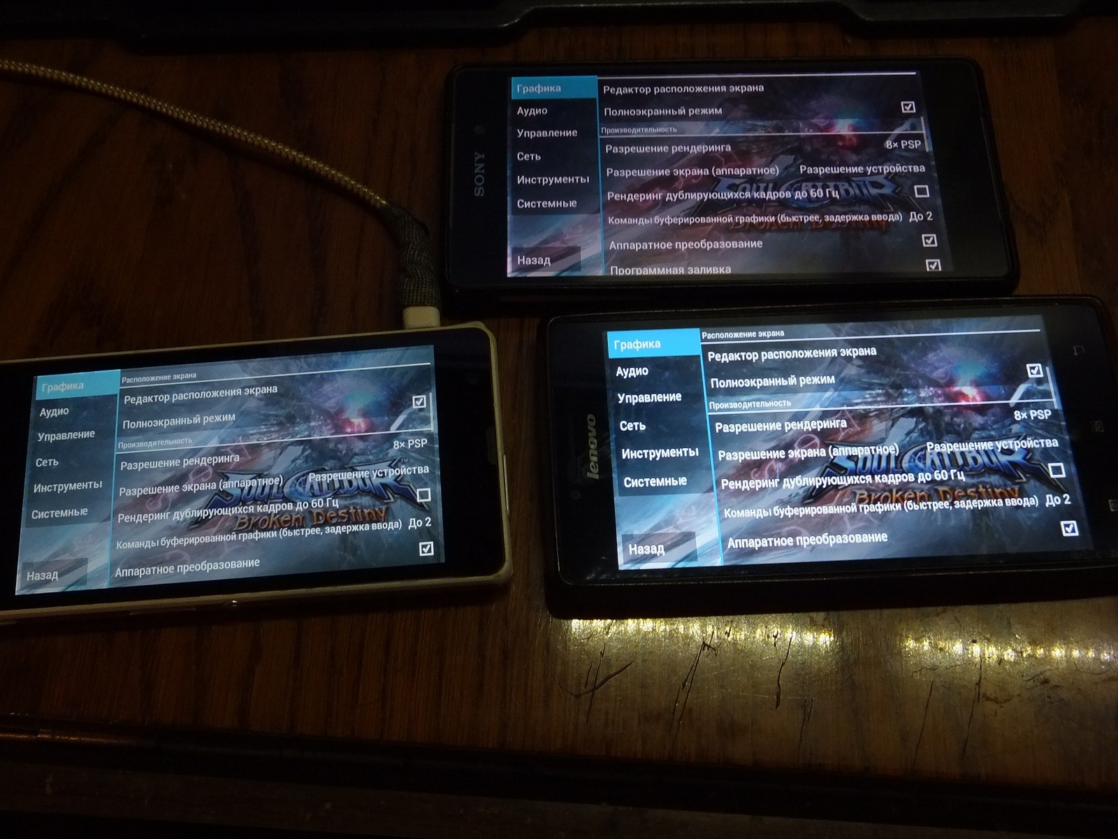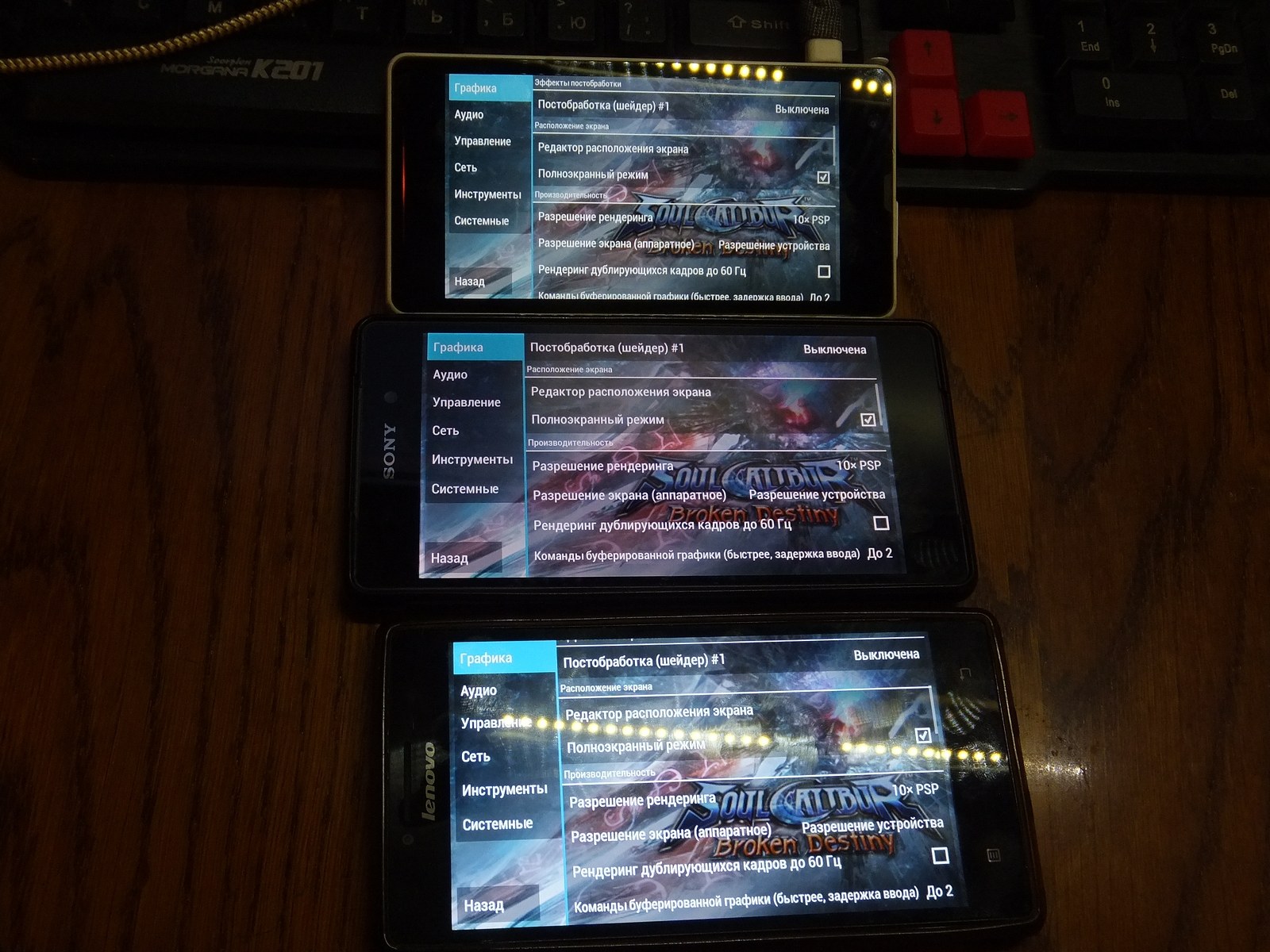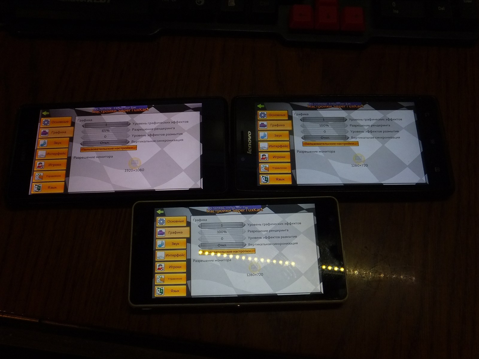 Так как у Lenovo P70-A и Sony C5503 разрешение экрана 1280x720 я установил 100% разрешение (921 600 пикселей), а для Sony Z2 установил 65% (1248x702 - 876 096 пикселей) ибо разрешение экрана 1920x1080, при этом я следил чтобы визуально детализация оказалась на одинаковом уровне и графические процессоры выполняли примерно одинаковый объем работы над графикой в игре.