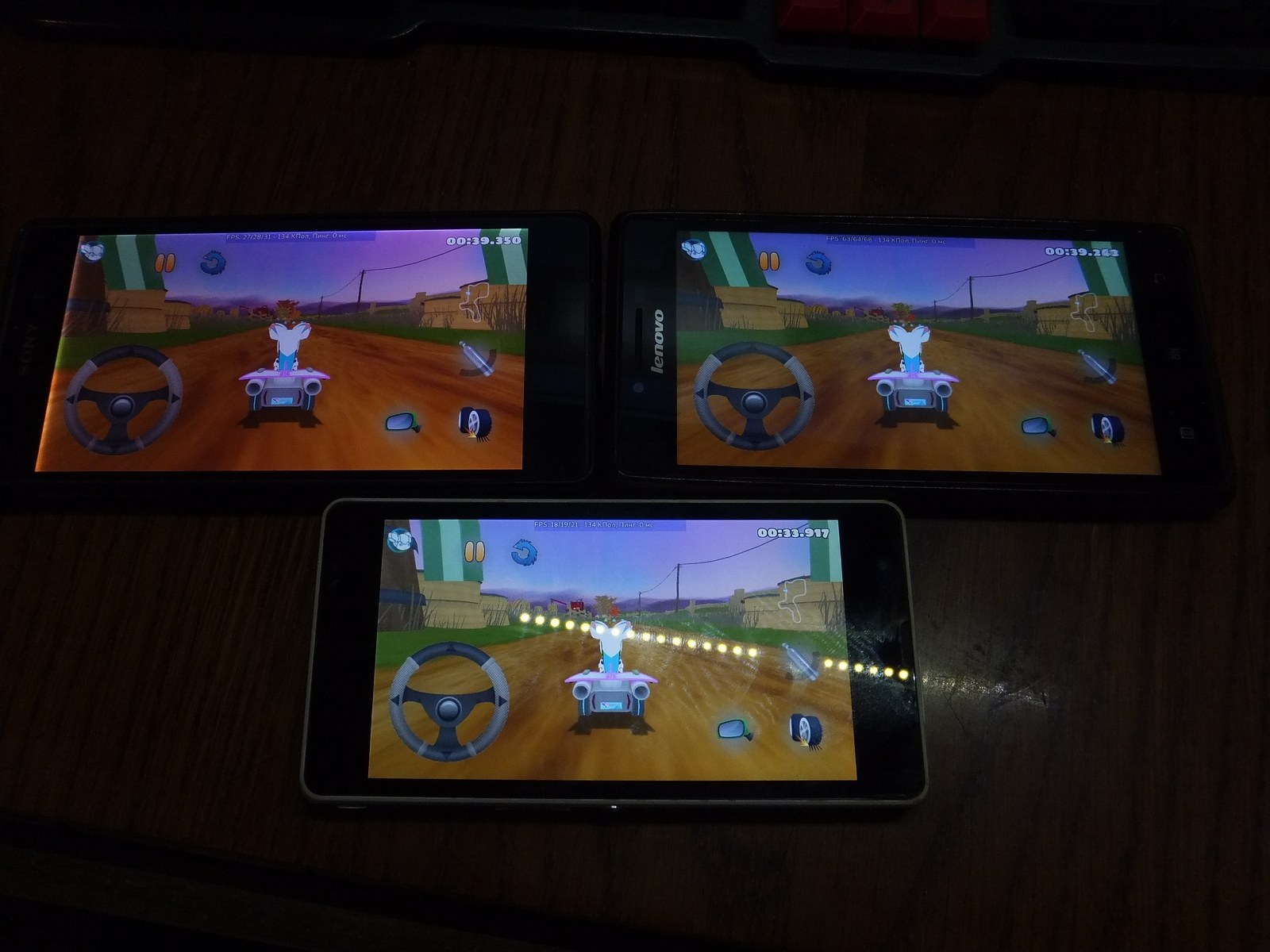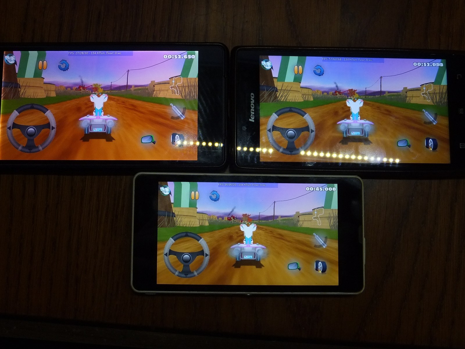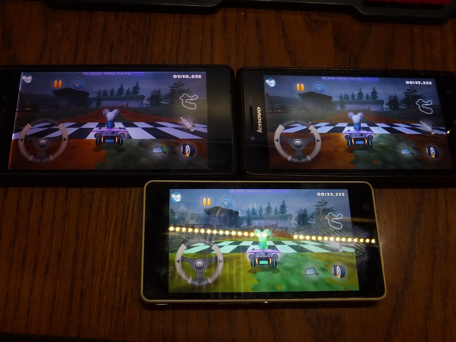 Ожидаемо FPS значительно снизился по сравнению с главным меню, причем я не заметил падения производительности со временем ни у одного из смартфонов.