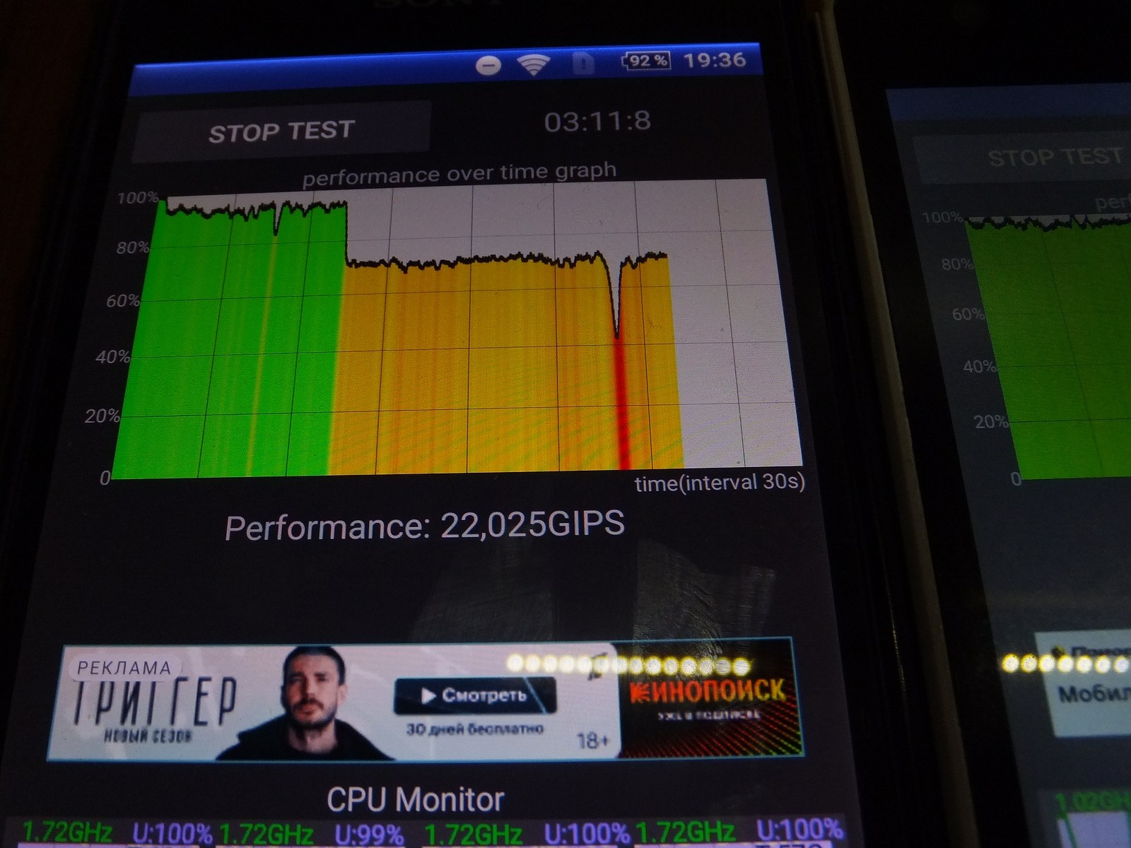 На 4 минуте наконец начал проявлять нестабильность и MT6752, но общая производительность сильно не пострадала.