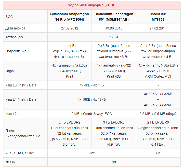 Но даже слабые места в плане FPU нивелируются высокой частотой у SNP-801, тем временем APQ8064 хоть и более производительный в плане FPU чем MT6752, но ему нехватает все той же частоты.
