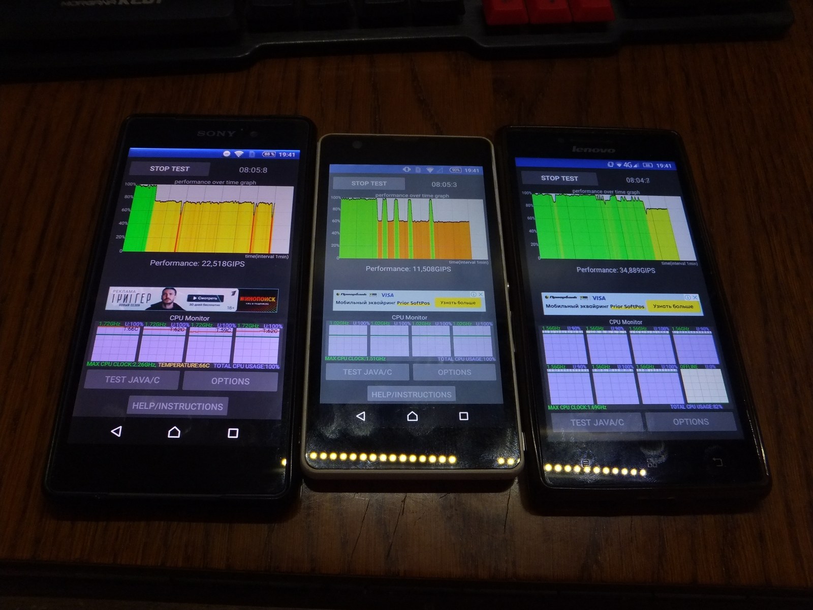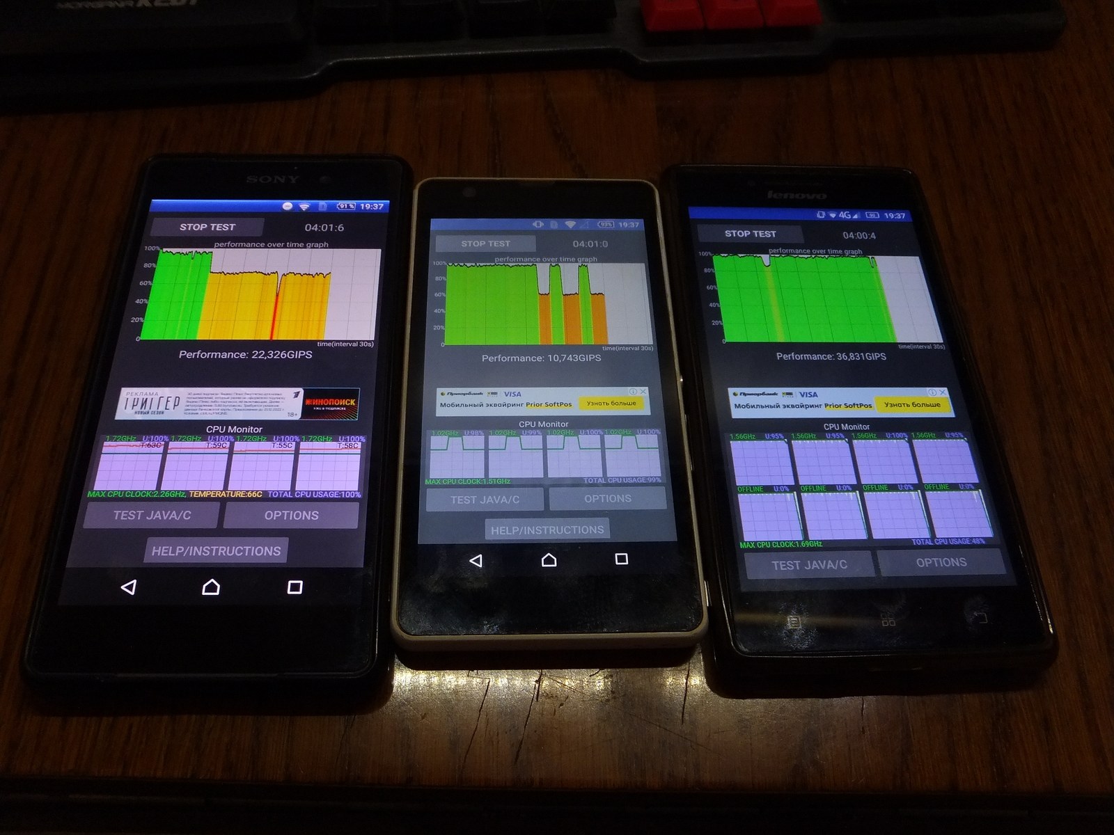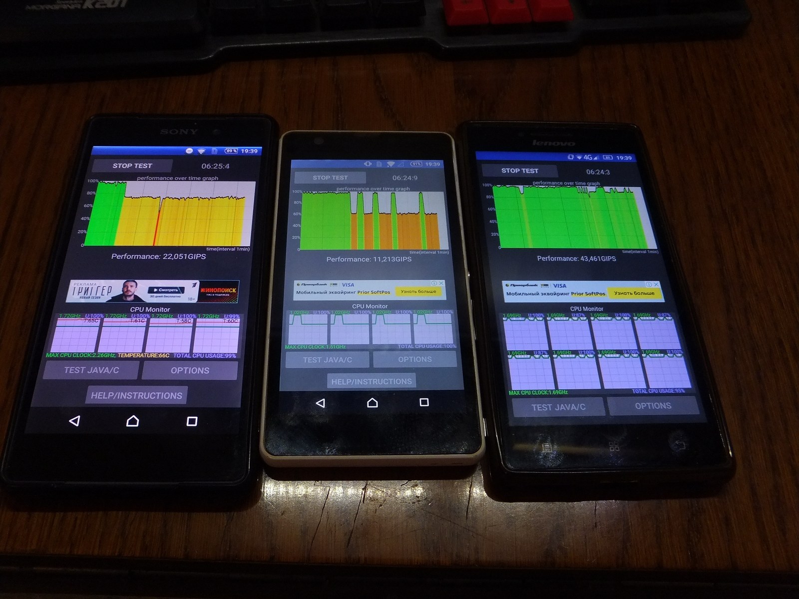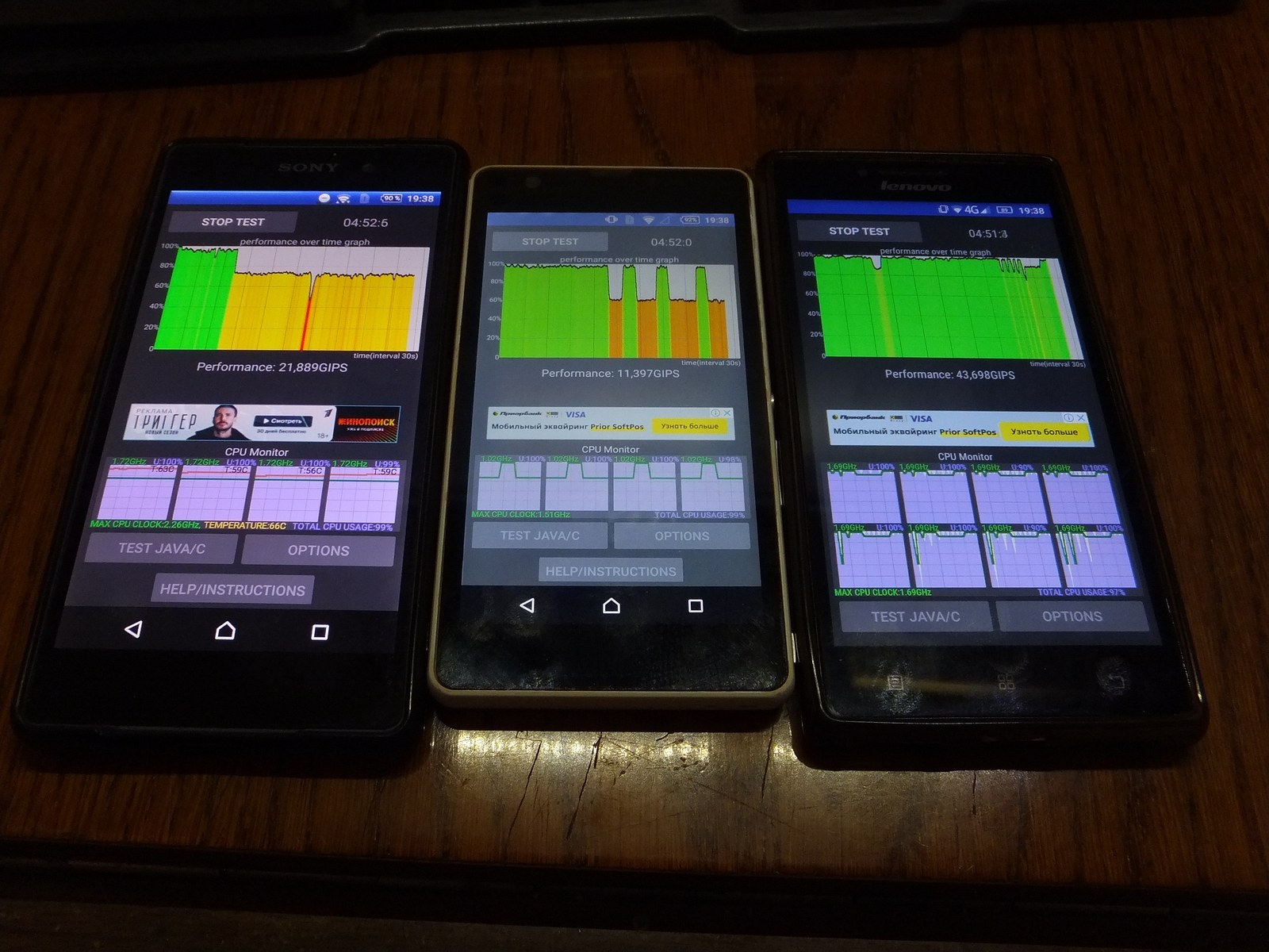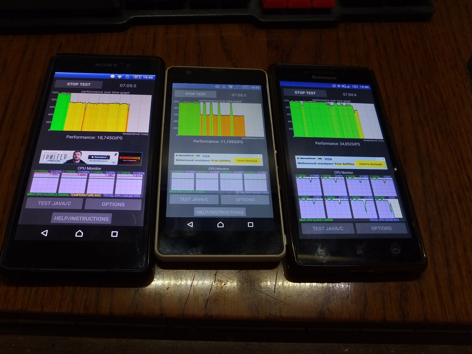 Теперь CPU Throttling Test 1.3.4, все смартфоны холодные на момент начала теста, Sony Z2 и Lenovo P70-A в чехле, Sony C5503 без чехла, но между двумя старшими смартфонами.