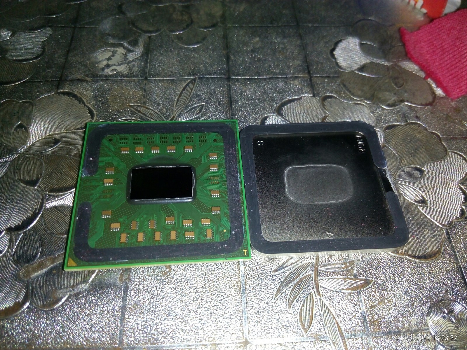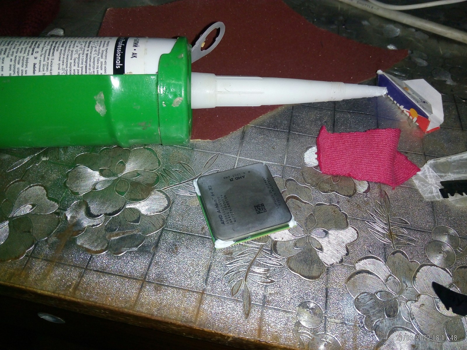 Немного стер компаунд чтобы крышка плотнее прилегала к кристаллу и по углам зафиксировал силиконовым герметиком, в таком состоянии следует сжать процессор, проще всего установить в систему и прижать радиатором.