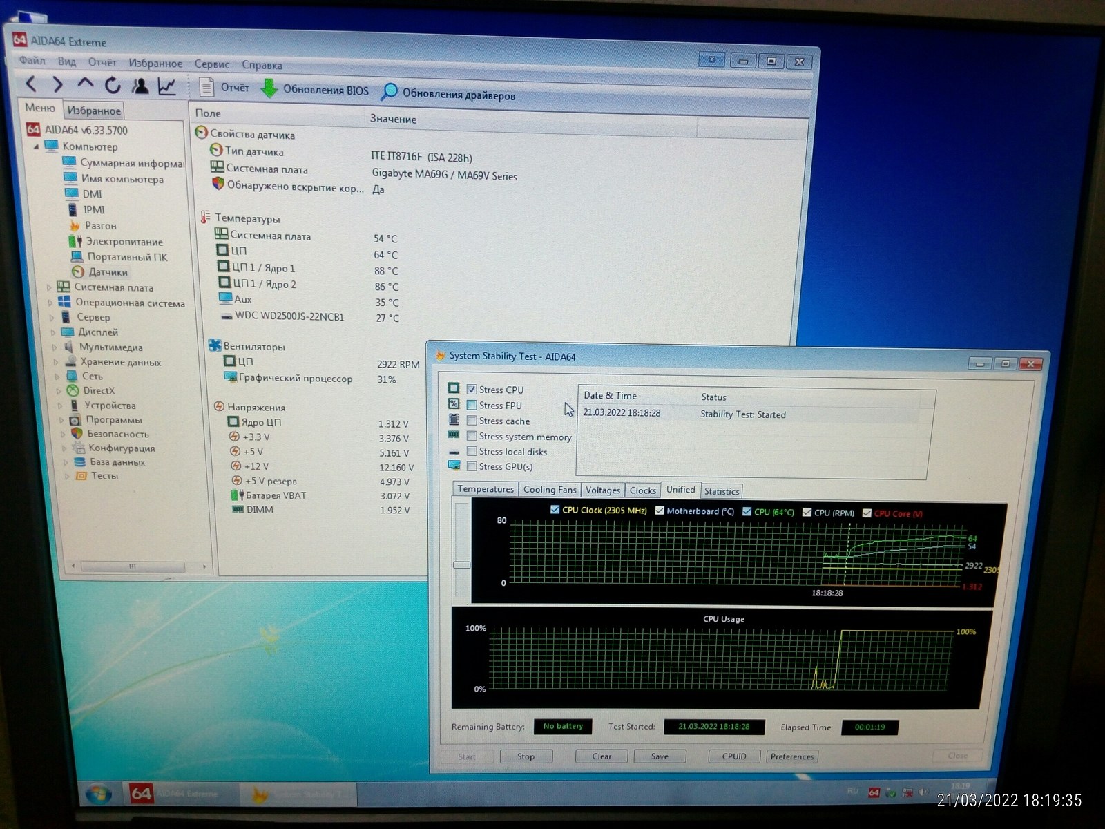 Это был системный блок с системной платой GA-MA69VM-S2, процессором Athlon64 x2 4400+, 1 GB DDR2 800, SATA HDD WD какой-то на 250 GB с пломбой 2009 года, видеокарта GeForce 7300 GT на 256 MB.