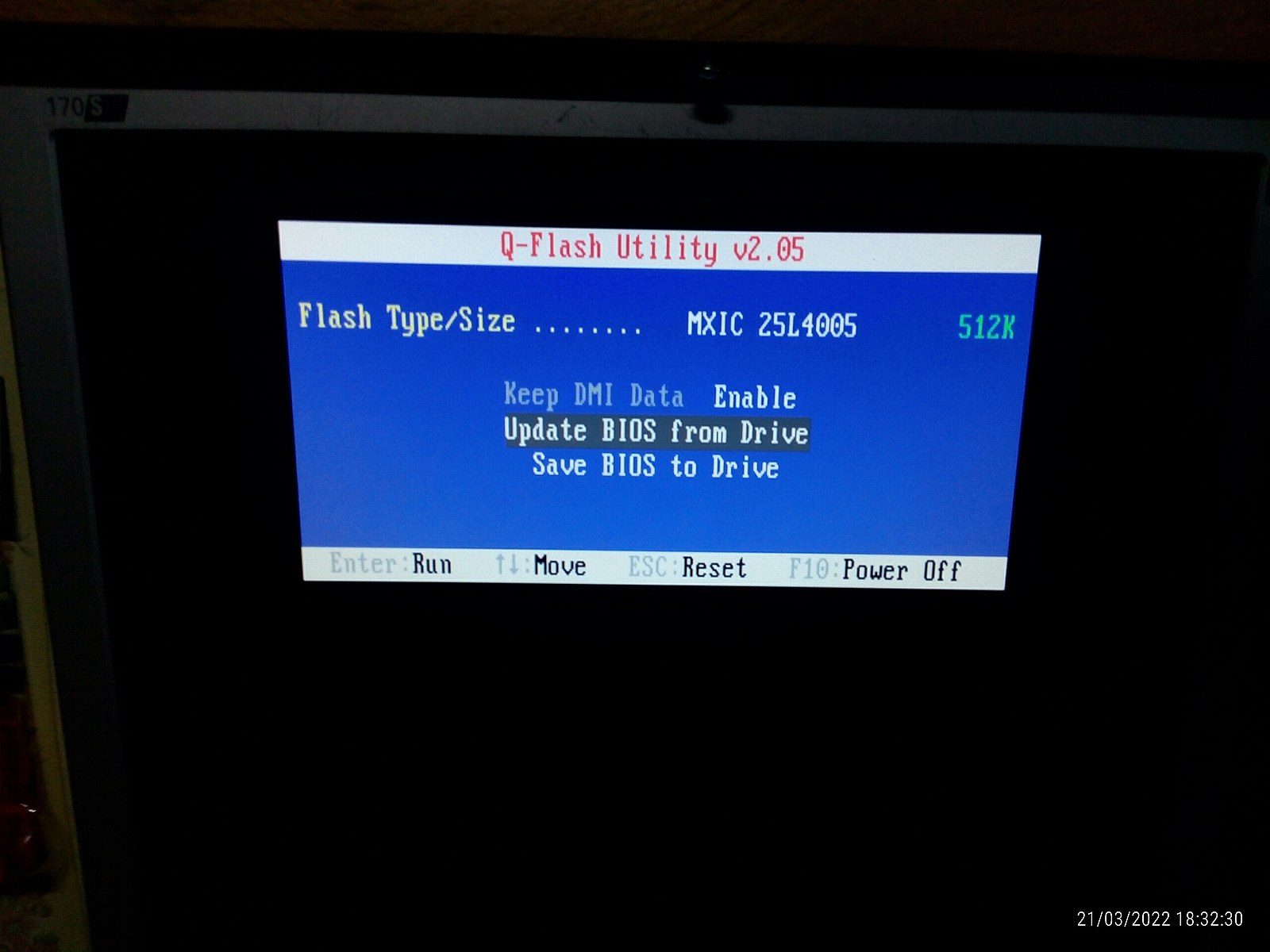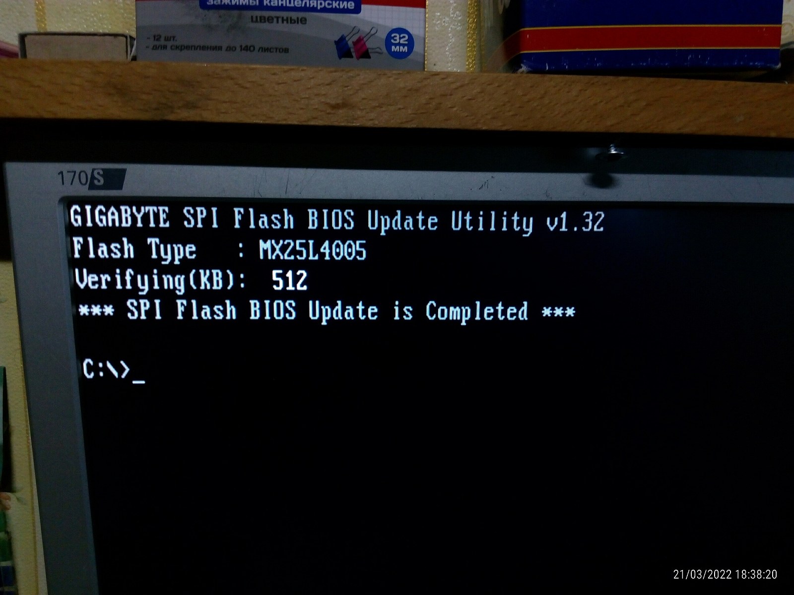 Пришлось записывать DOS на флешку и прошивать утилитой что Gigabyte предоставляет вместе с прошивкой, визуально изменений мало между F7 и F10e прошивками, пропала надпись 64-bit говорящая что ОЗУ работает в один канал.
