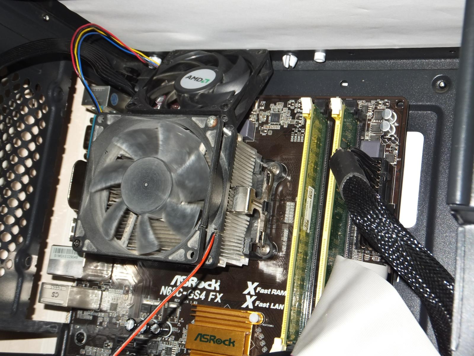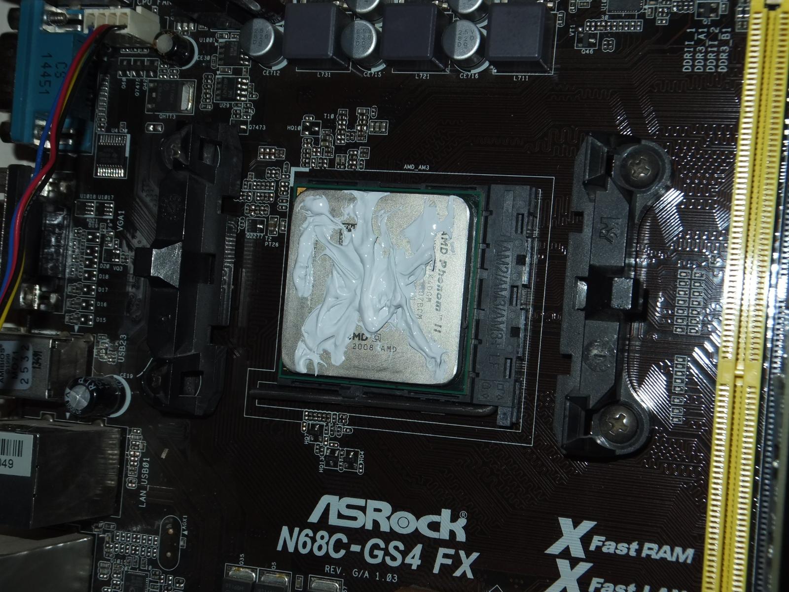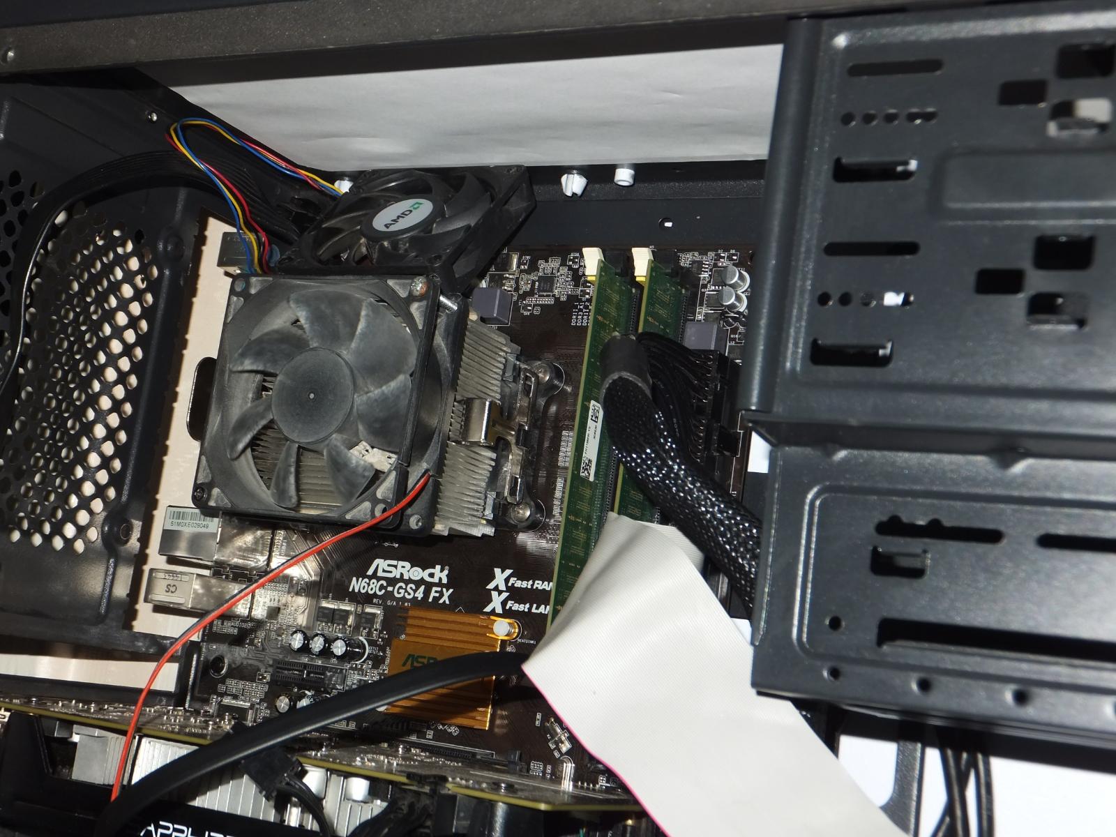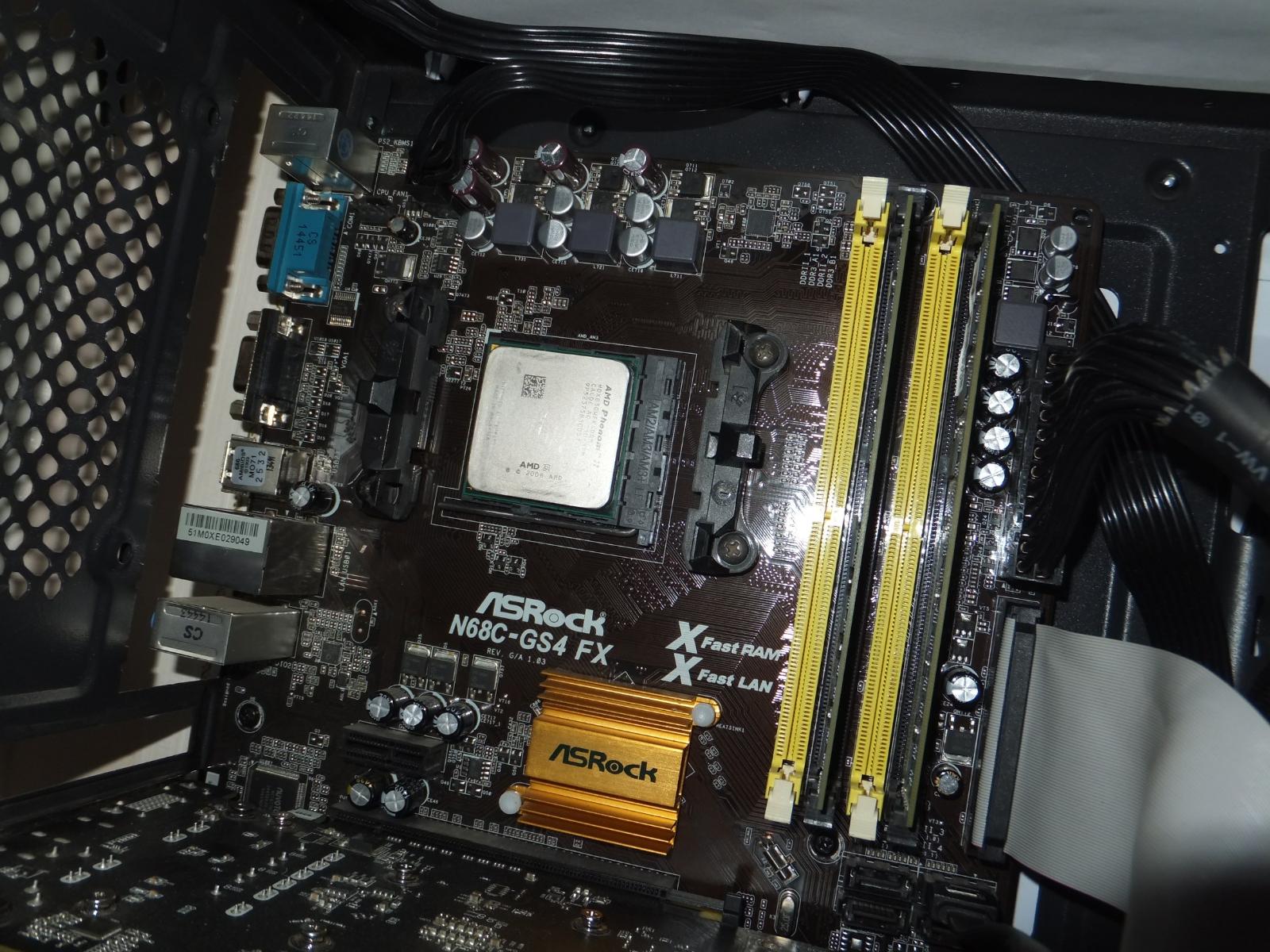 В качестве испытуемого будет старый добрый Phenom II x4 830 в разгоне до 3.3 ГГц по шине, системная плата ASRock N68C-GS4 FX, система в корпусе с открытой боковой крышкой.