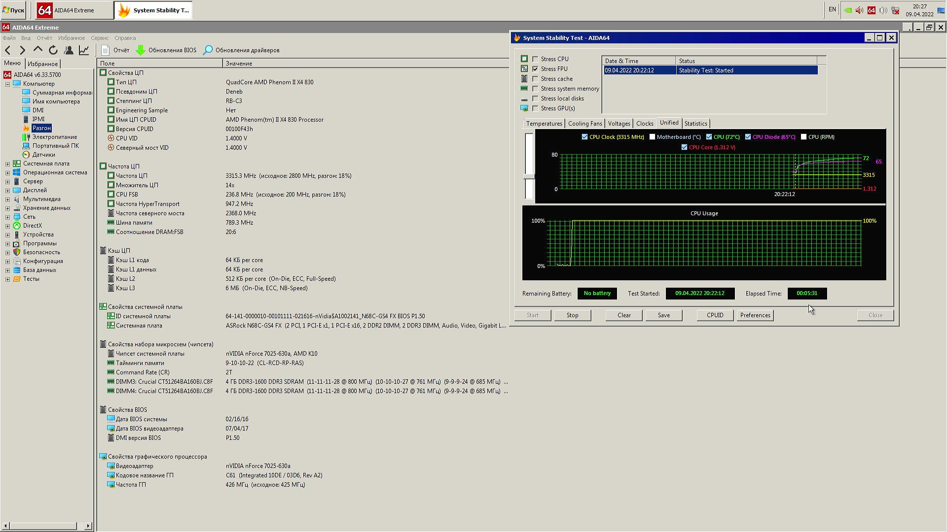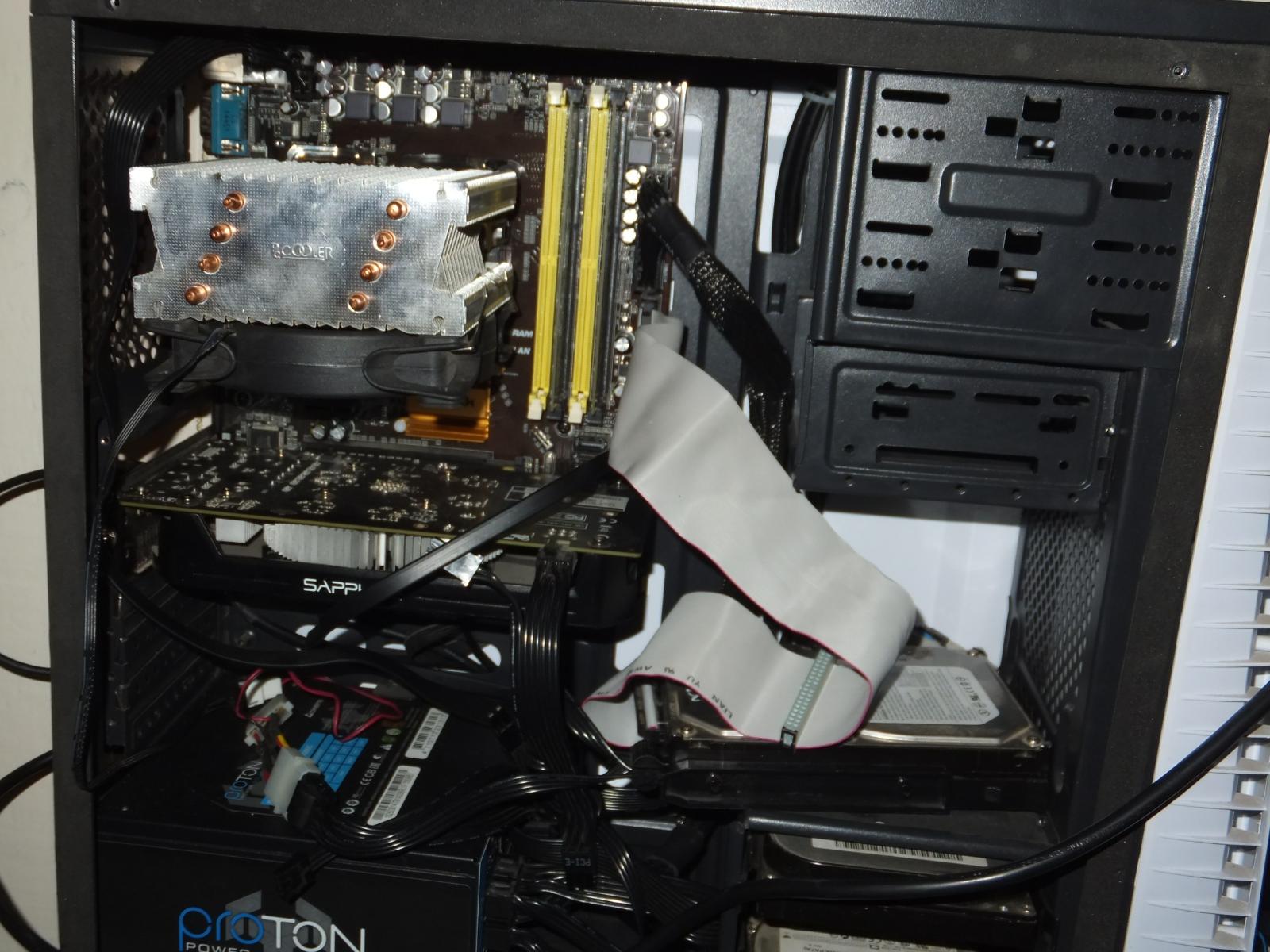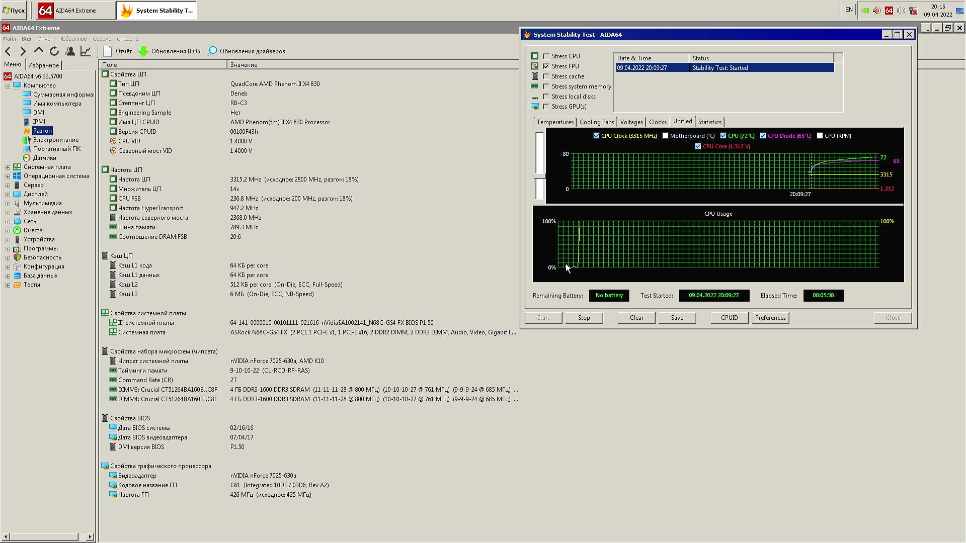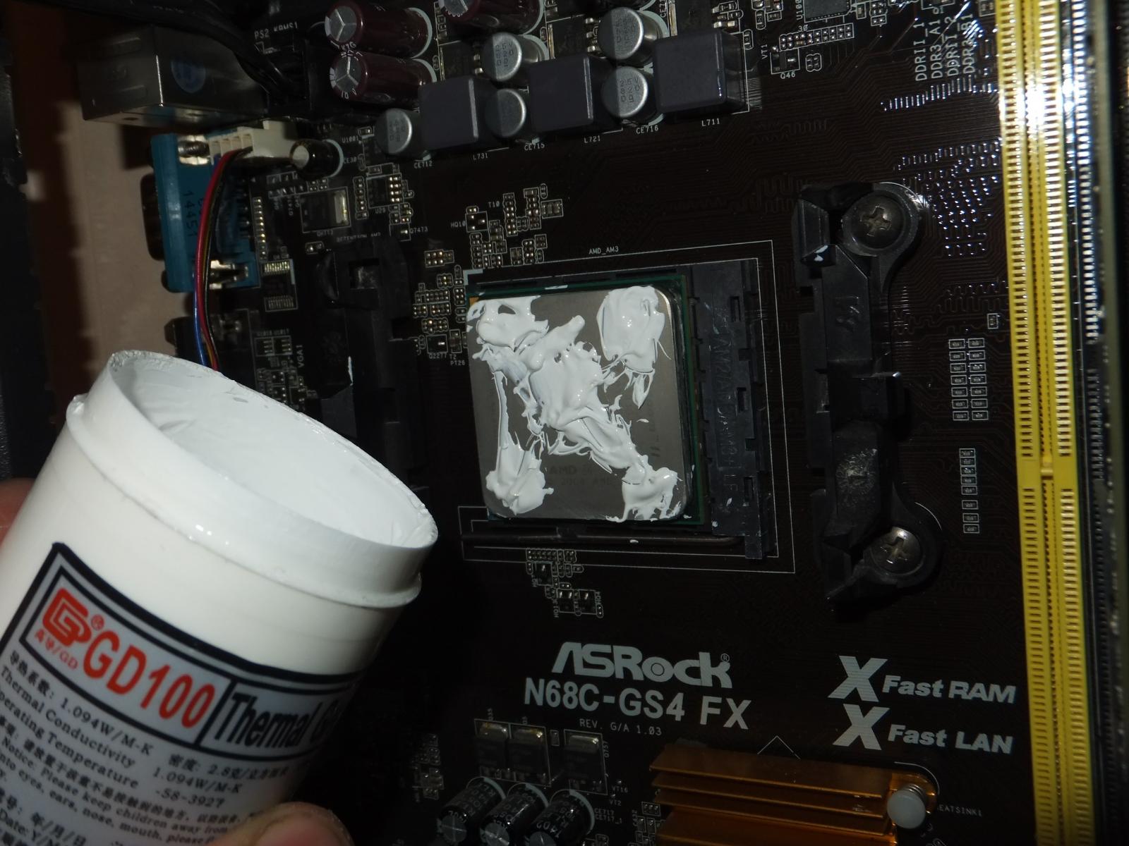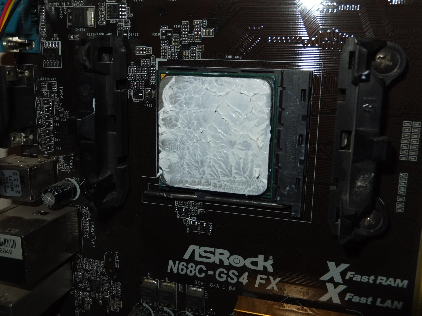 В качестве испытуемого будет старый добрый Phenom II x4 830 в разгоне до 3.3 ГГц по шине, системная плата ASRock N68C-GS4 FX, система в корпусе с открытой боковой крышкой.