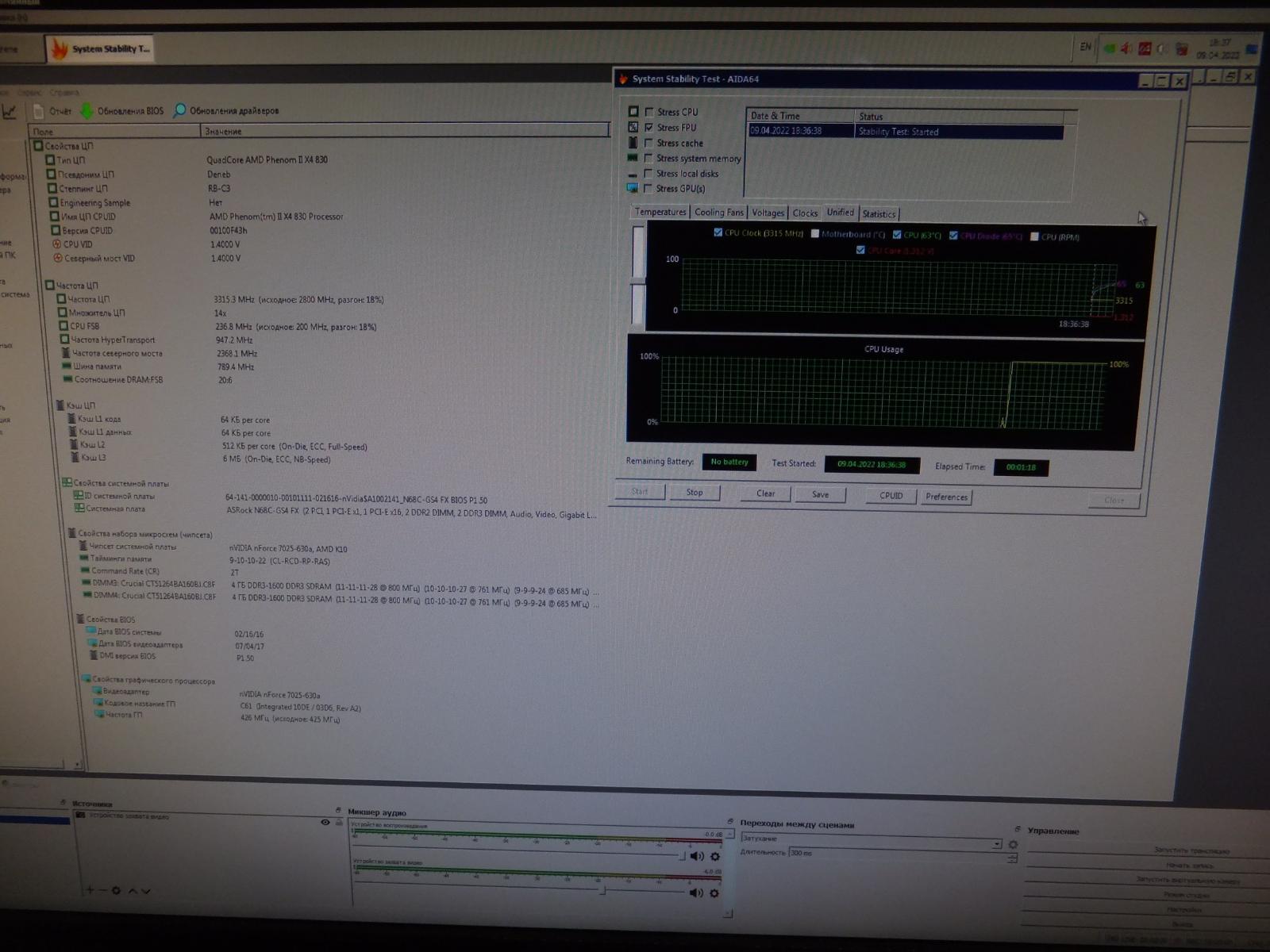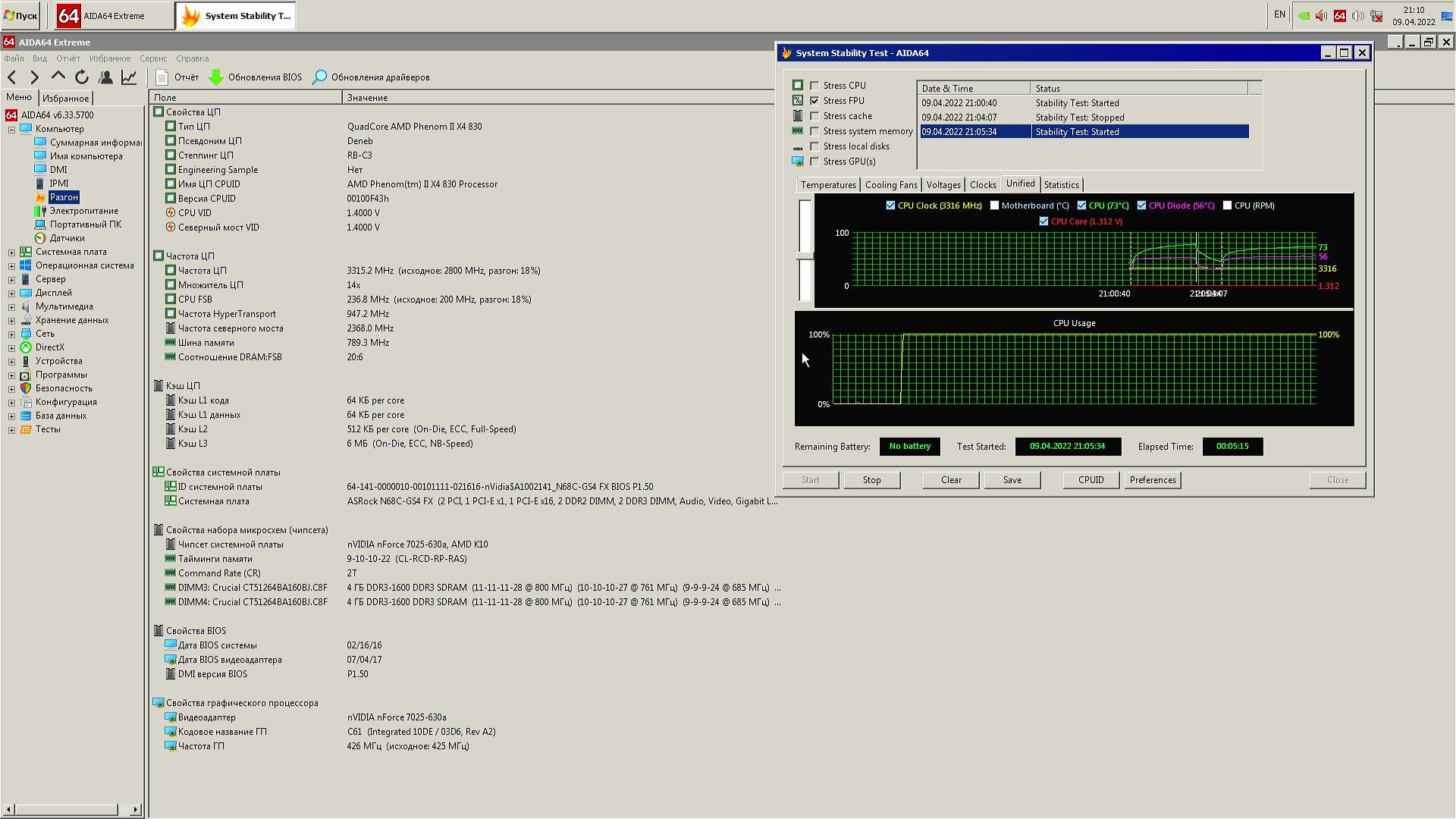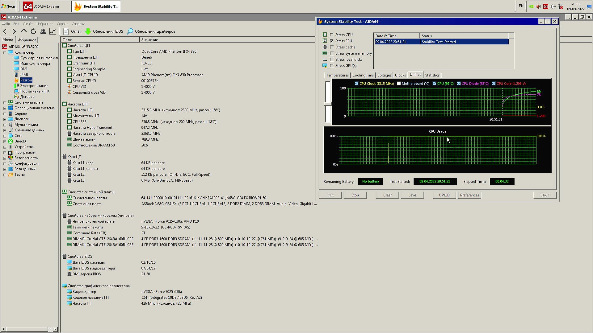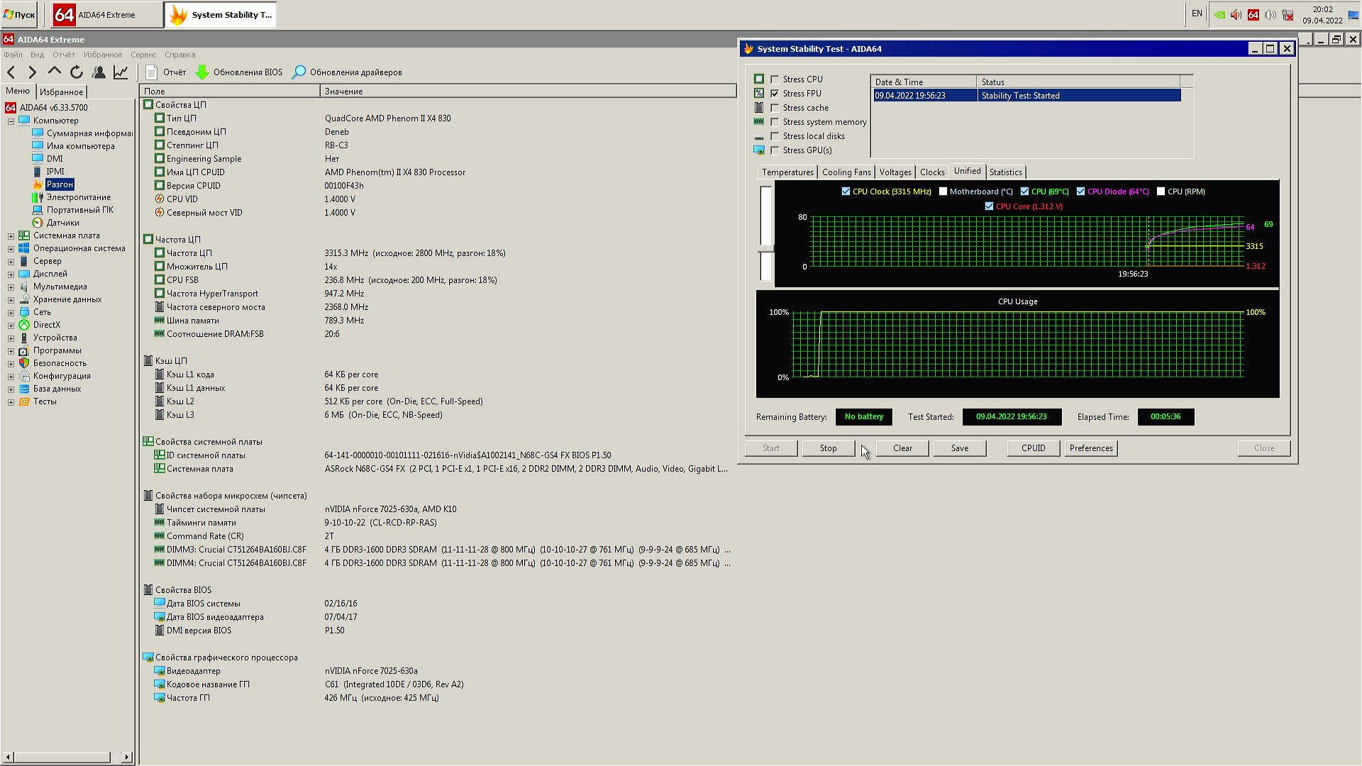 В качестве испытуемого будет старый добрый Phenom II x4 830 в разгоне до 3.3 ГГц по шине, системная плата ASRock N68C-GS4 FX, система в корпусе с открытой боковой крышкой.