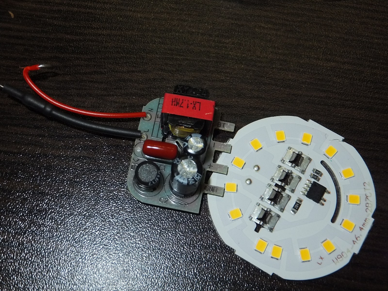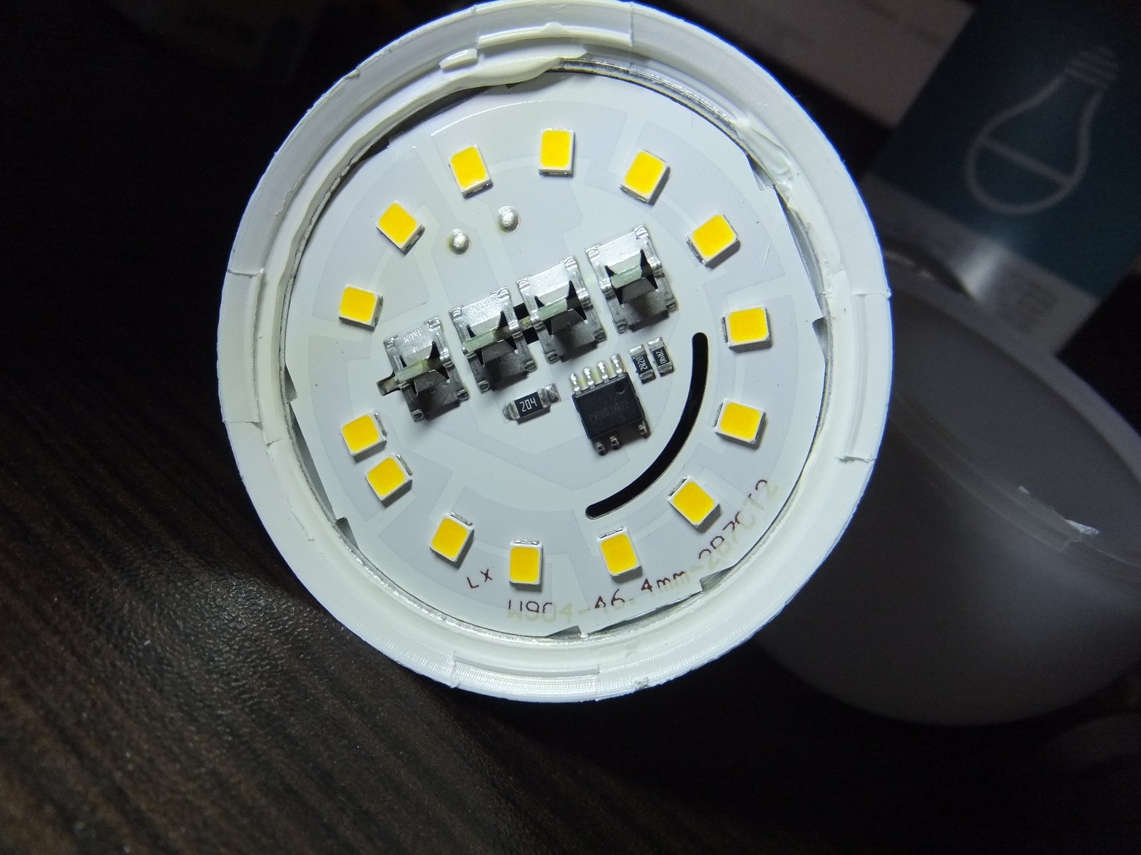 Светодиодный модуль на лицевой стороне имеет микросхему "77BKL0H6KJ", на неё информацию я не нашел, но рядом есть несколько резисторов которыми можно отрегулировать мощность лампы при модификации.