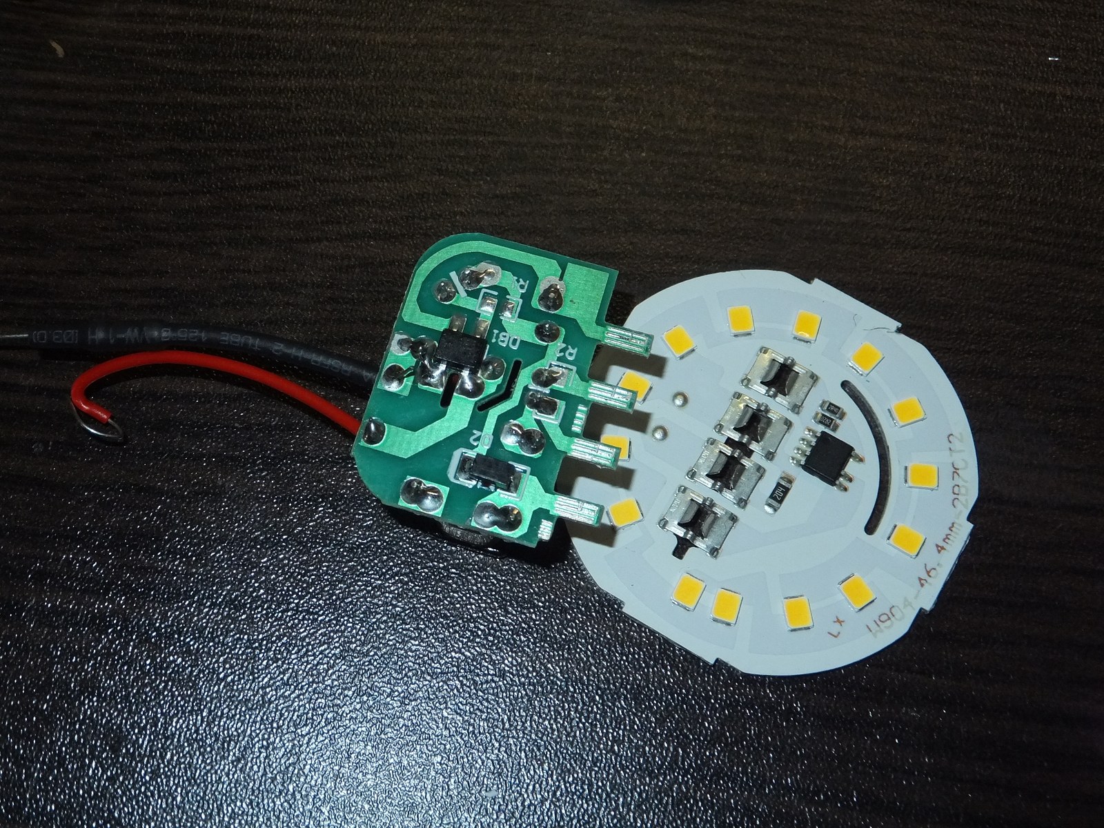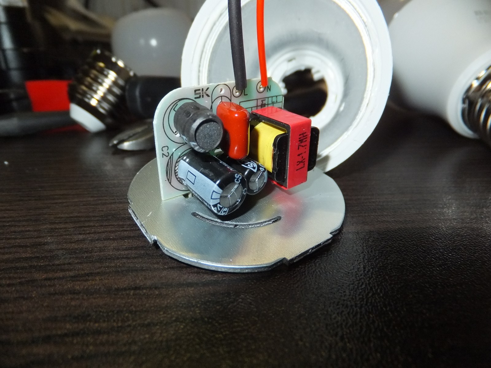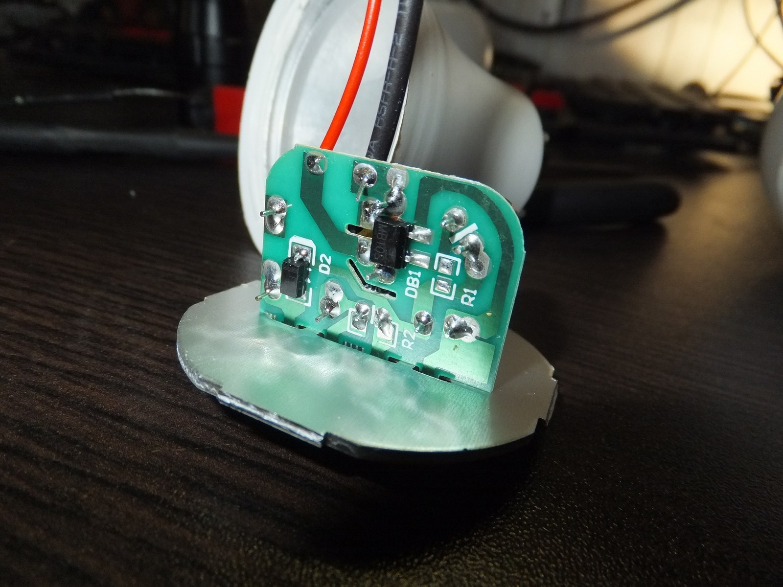 Если разбирать дальше, то придется уже до конца разбирать лампочку, ибо провод выходит из зажима внутри цоколя при поднятии светодиодного модуля.