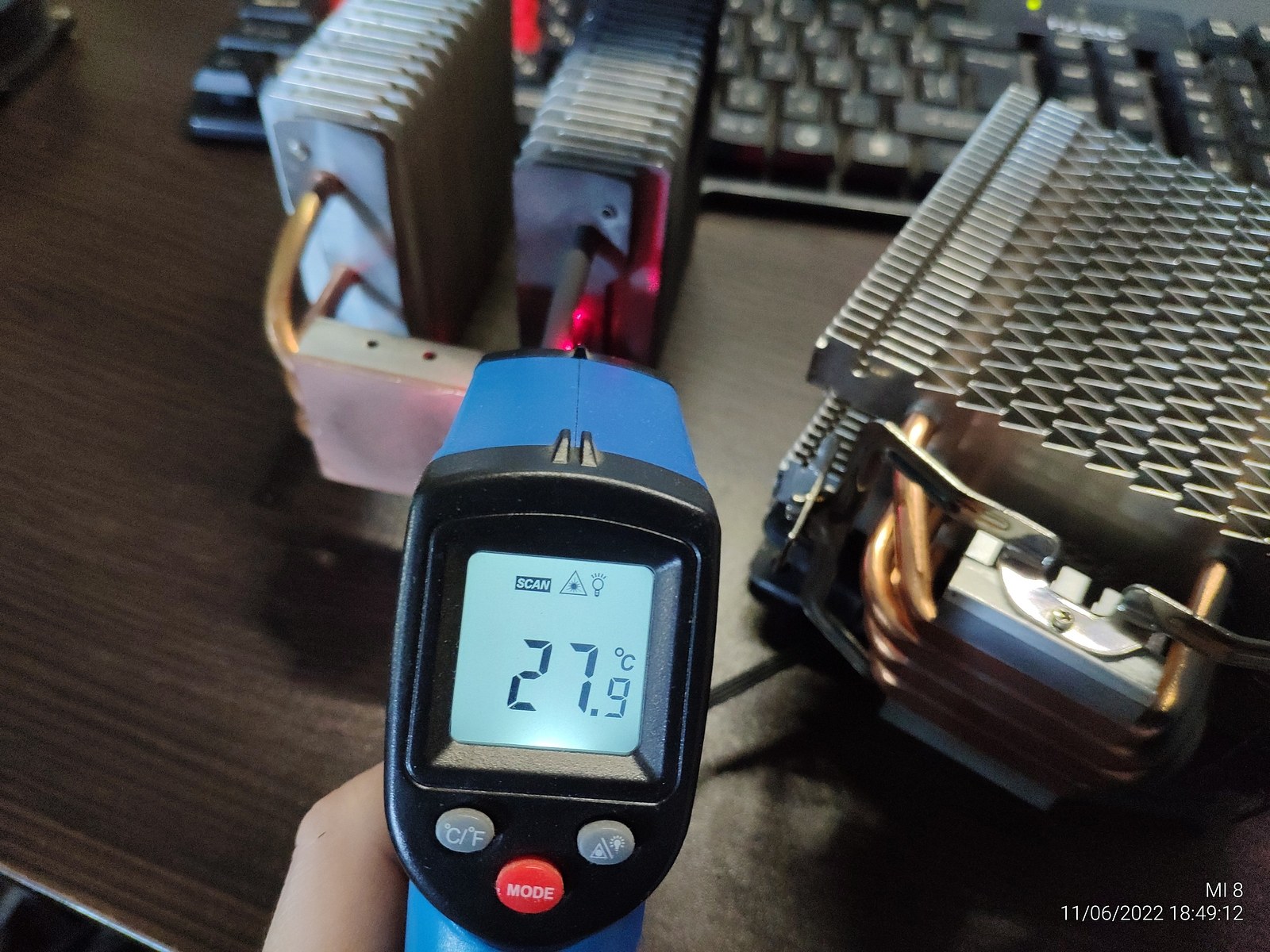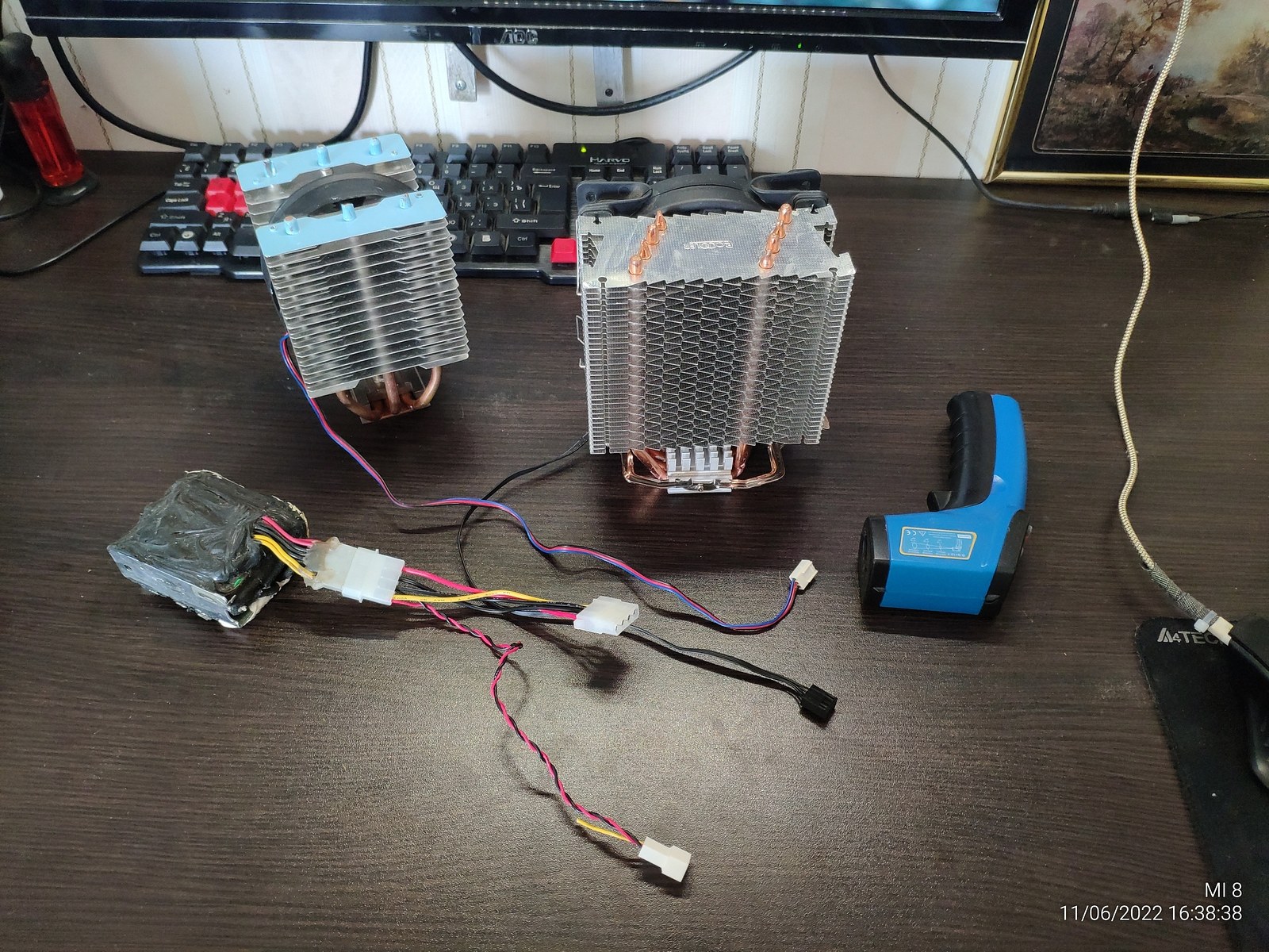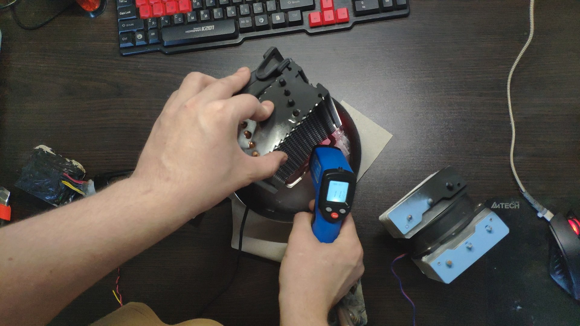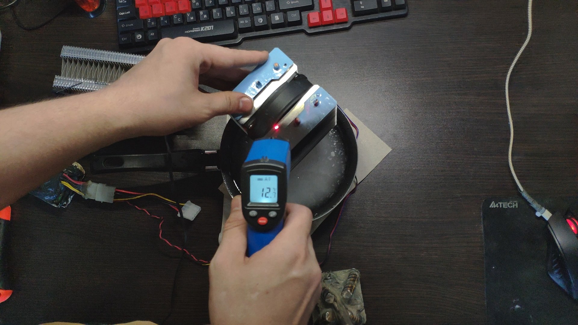 Для испытаний я подготовил две башни, модифицированный Titan TTC-NK34TZ/RF(BX) и PCCooler GI-X4b, в качестве вспомогательного элемента будет аккумулятор на 12в (подключать вентиляторы) и пирометр (измерять температуру).