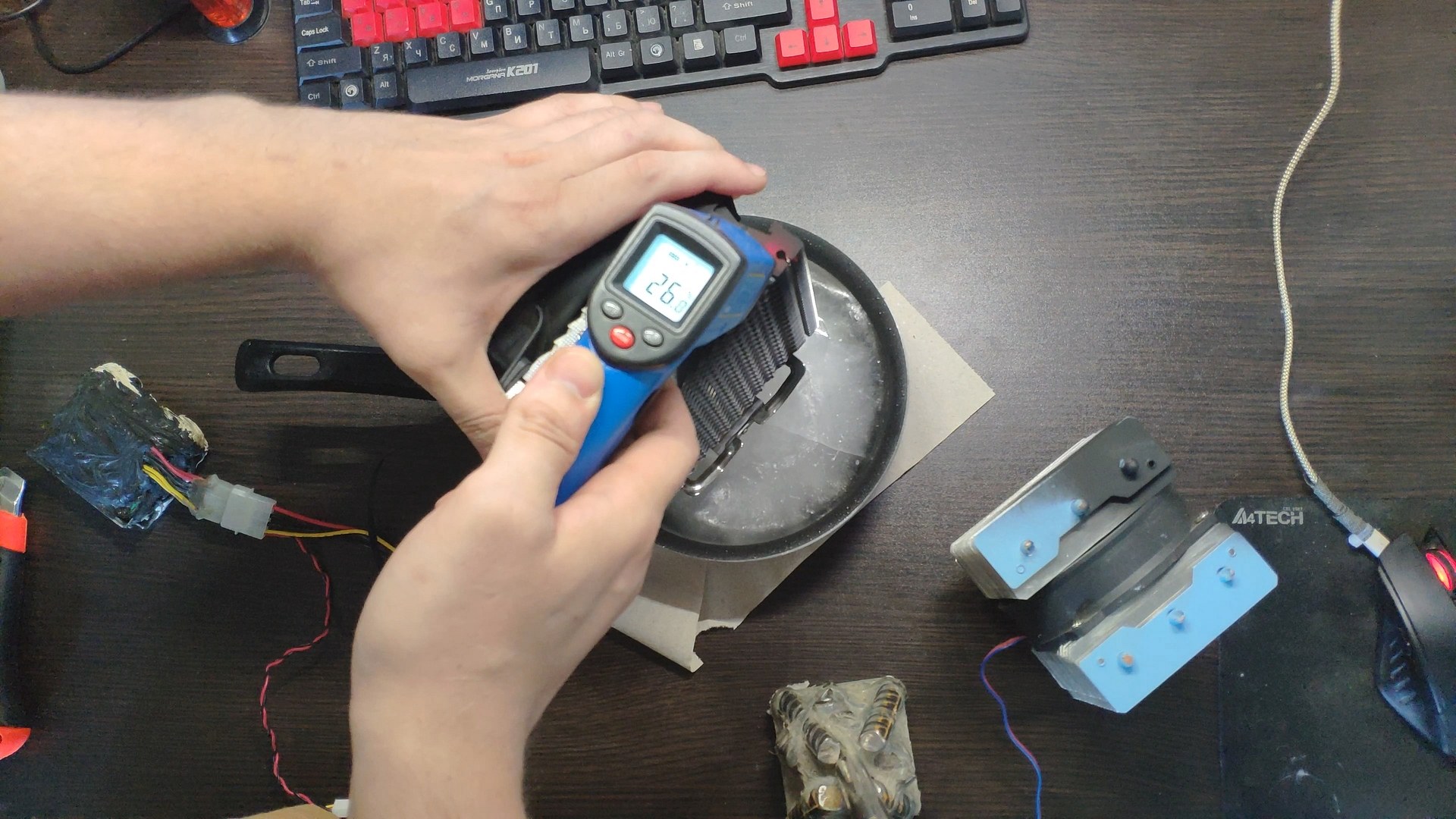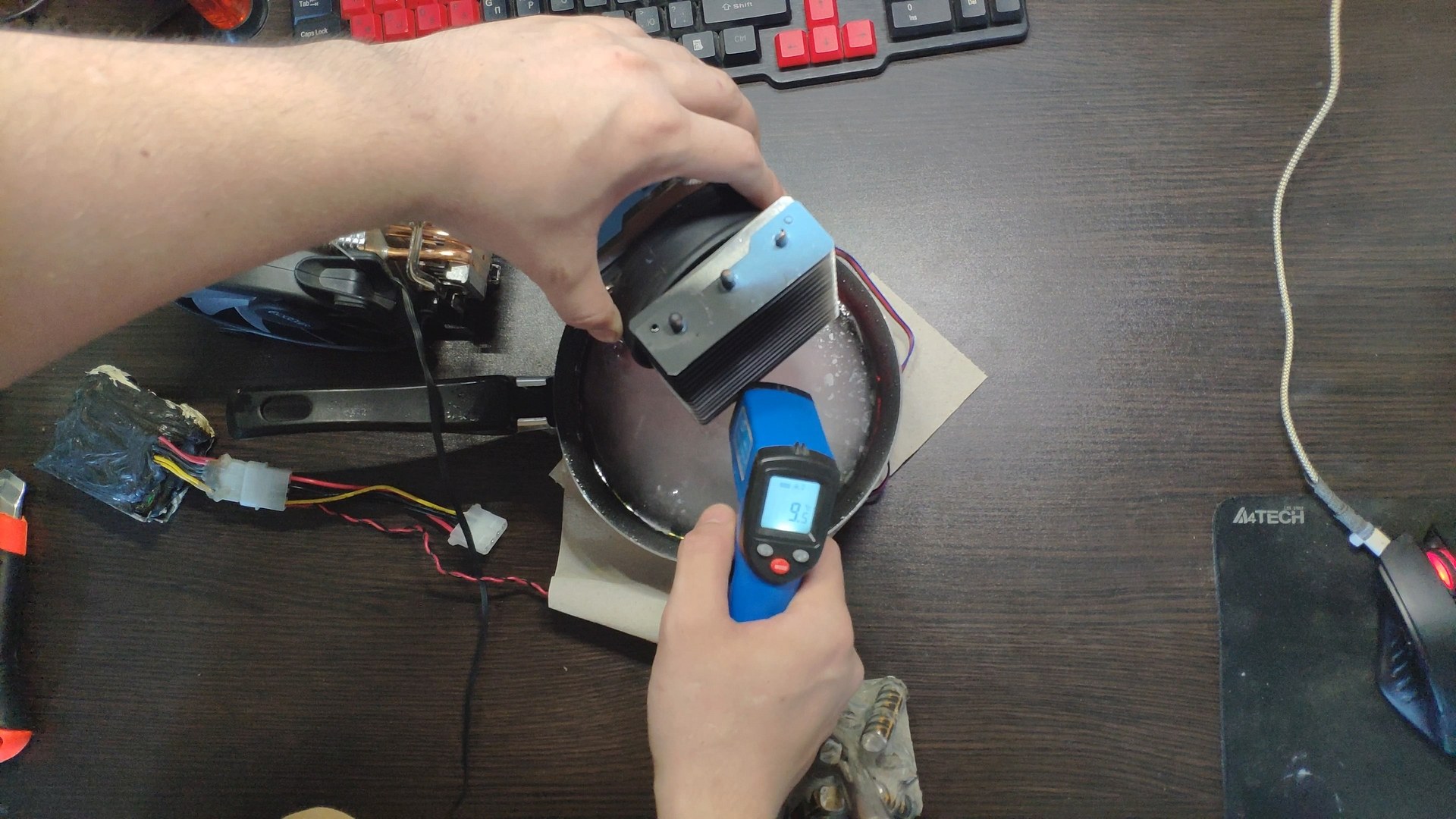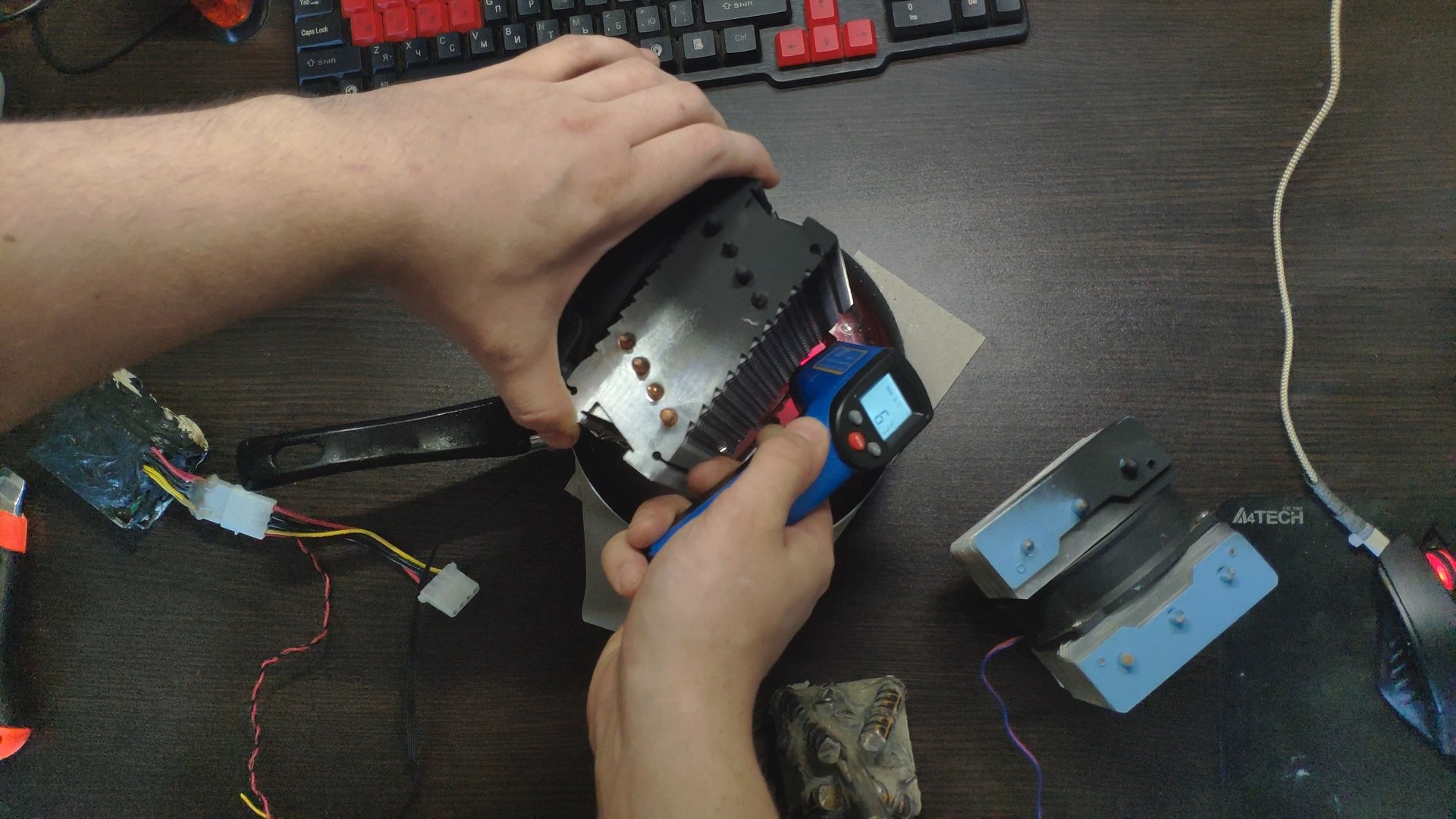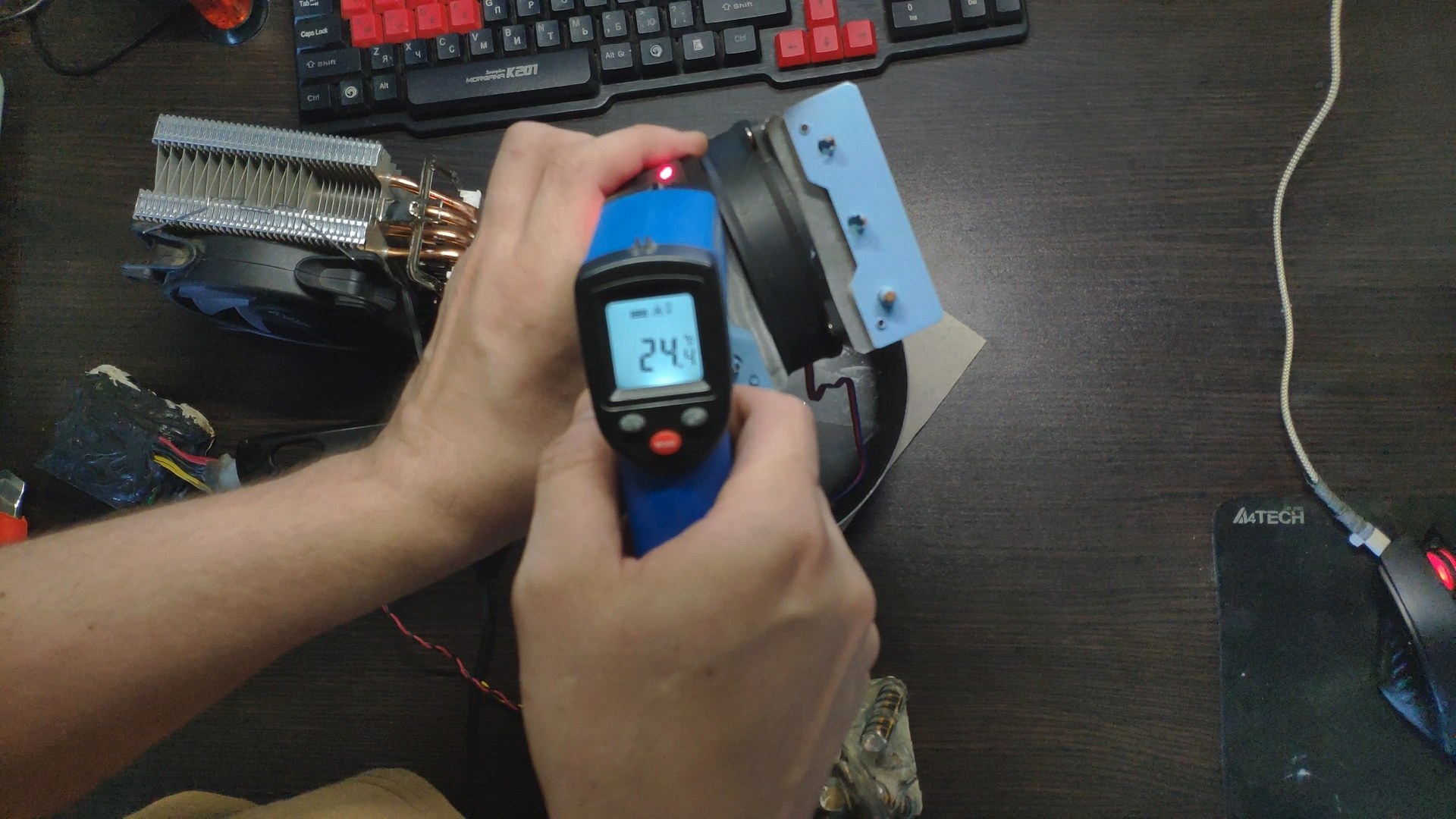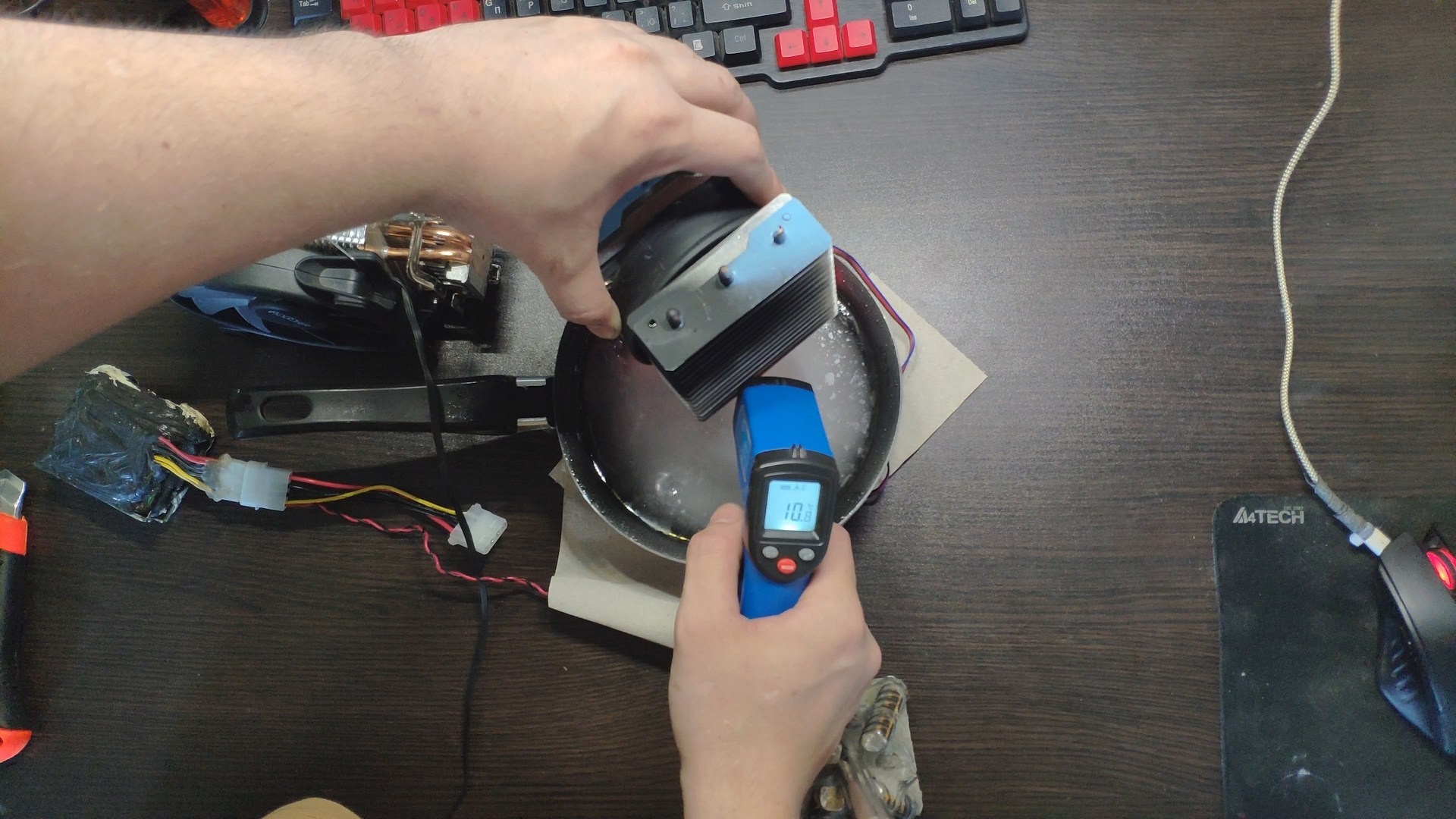 Для испытаний я подготовил две башни, модифицированный Titan TTC-NK34TZ/RF(BX) и PCCooler GI-X4b, в качестве вспомогательного элемента будет аккумулятор на 12в (подключать вентиляторы) и пирометр (измерять температуру).