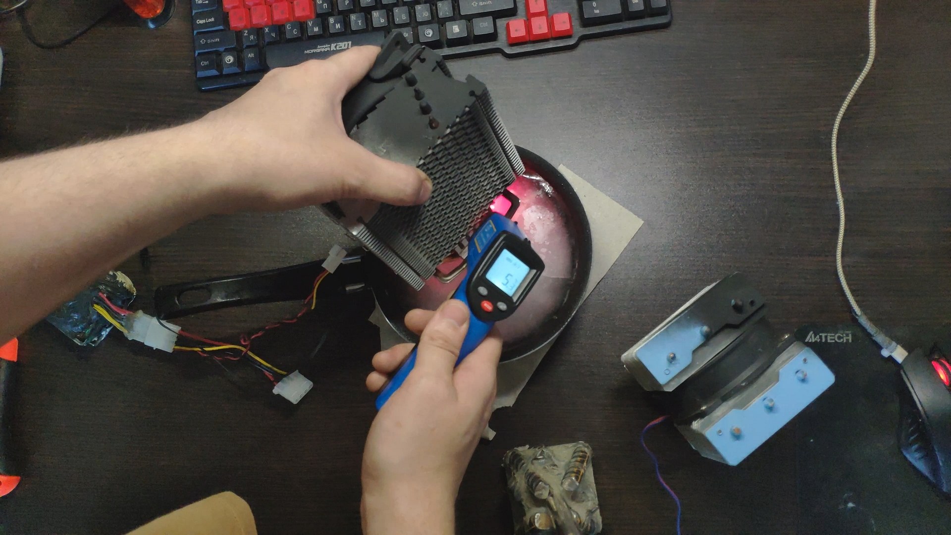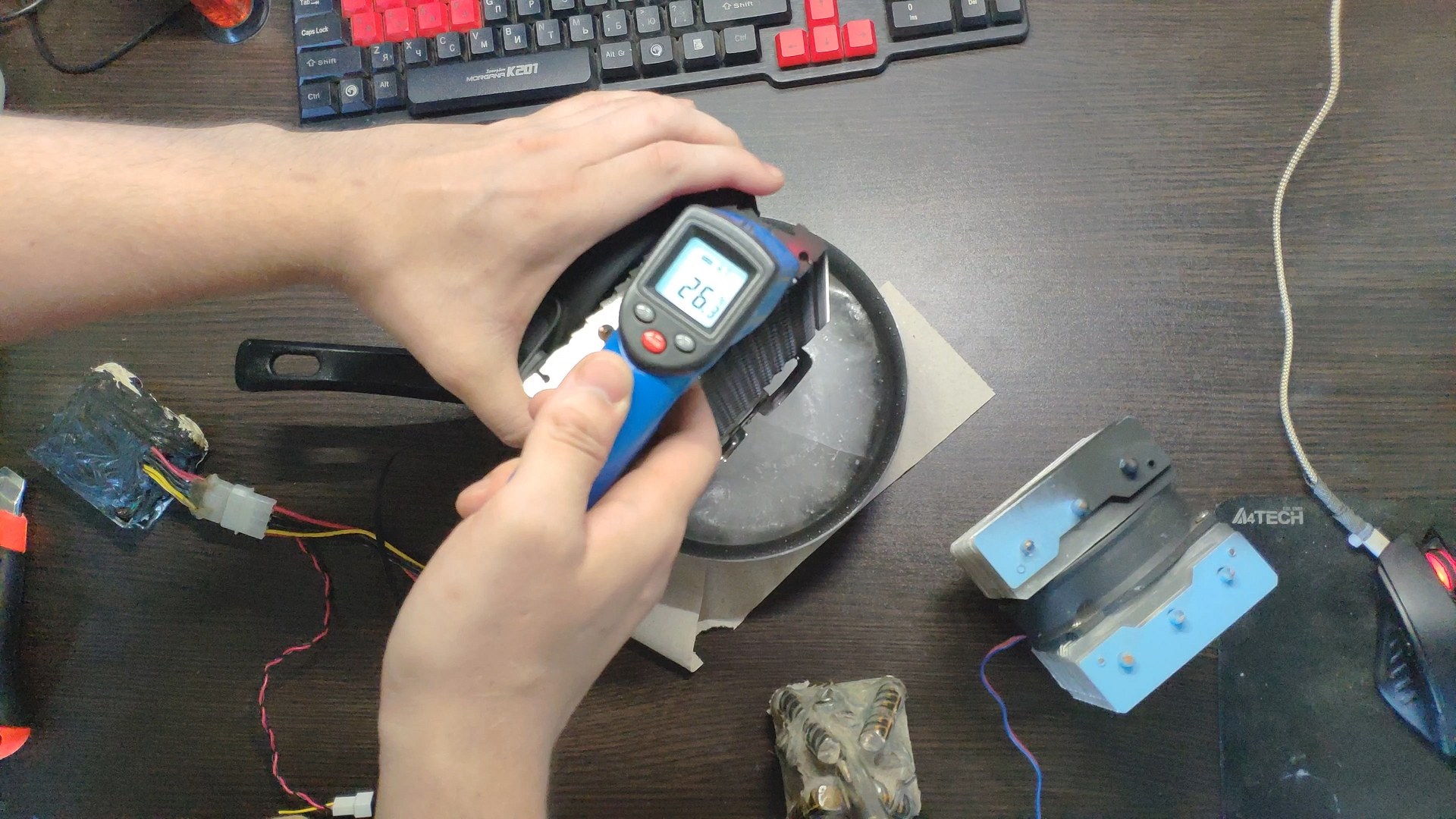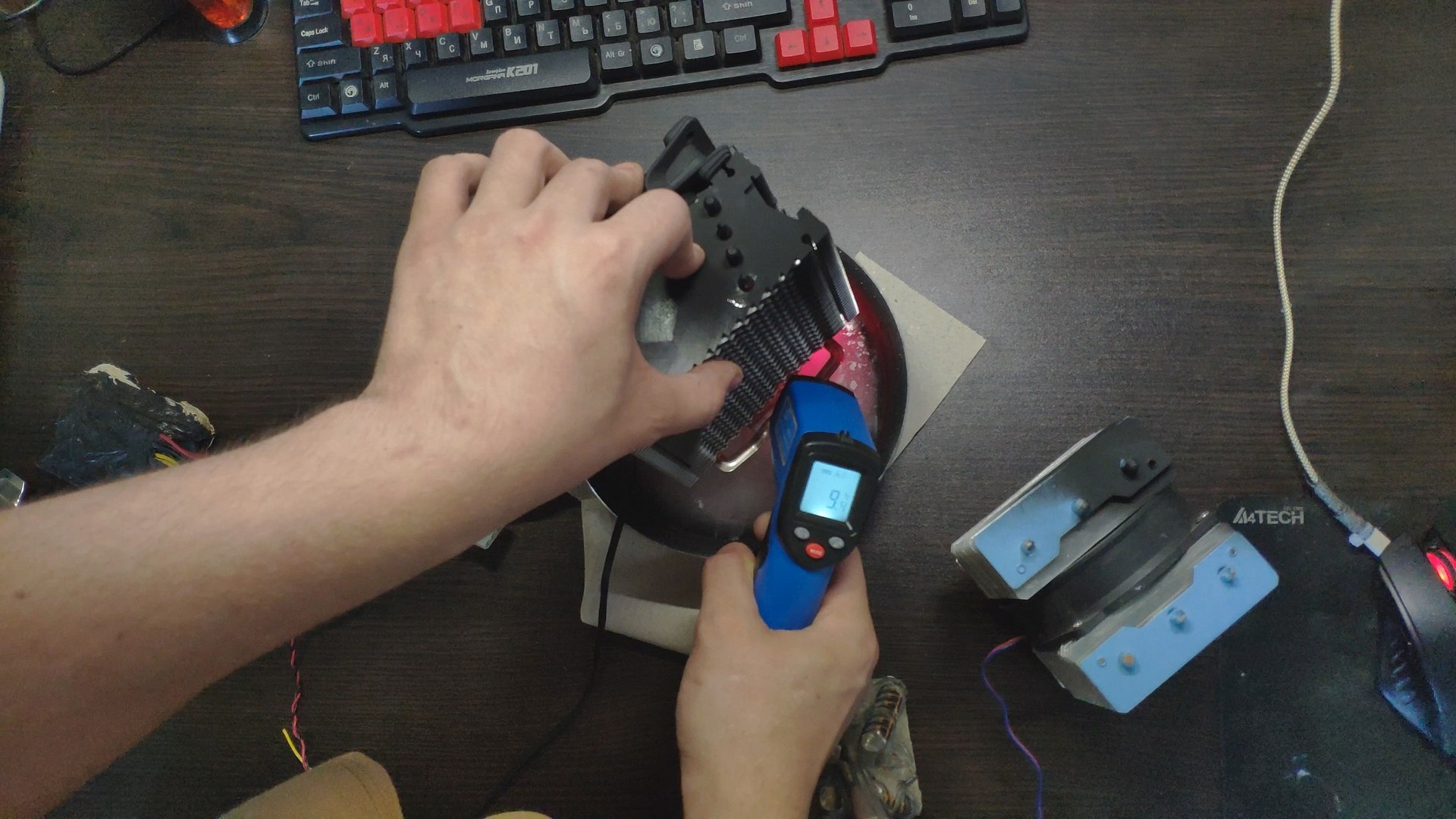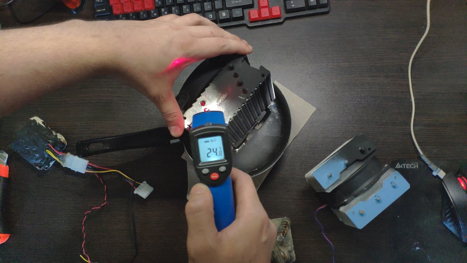 Для испытаний я подготовил две башни, модифицированный Titan TTC-NK34TZ/RF(BX) и PCCooler GI-X4b, в качестве вспомогательного элемента будет аккумулятор на 12в (подключать вентиляторы) и пирометр (измерять температуру).