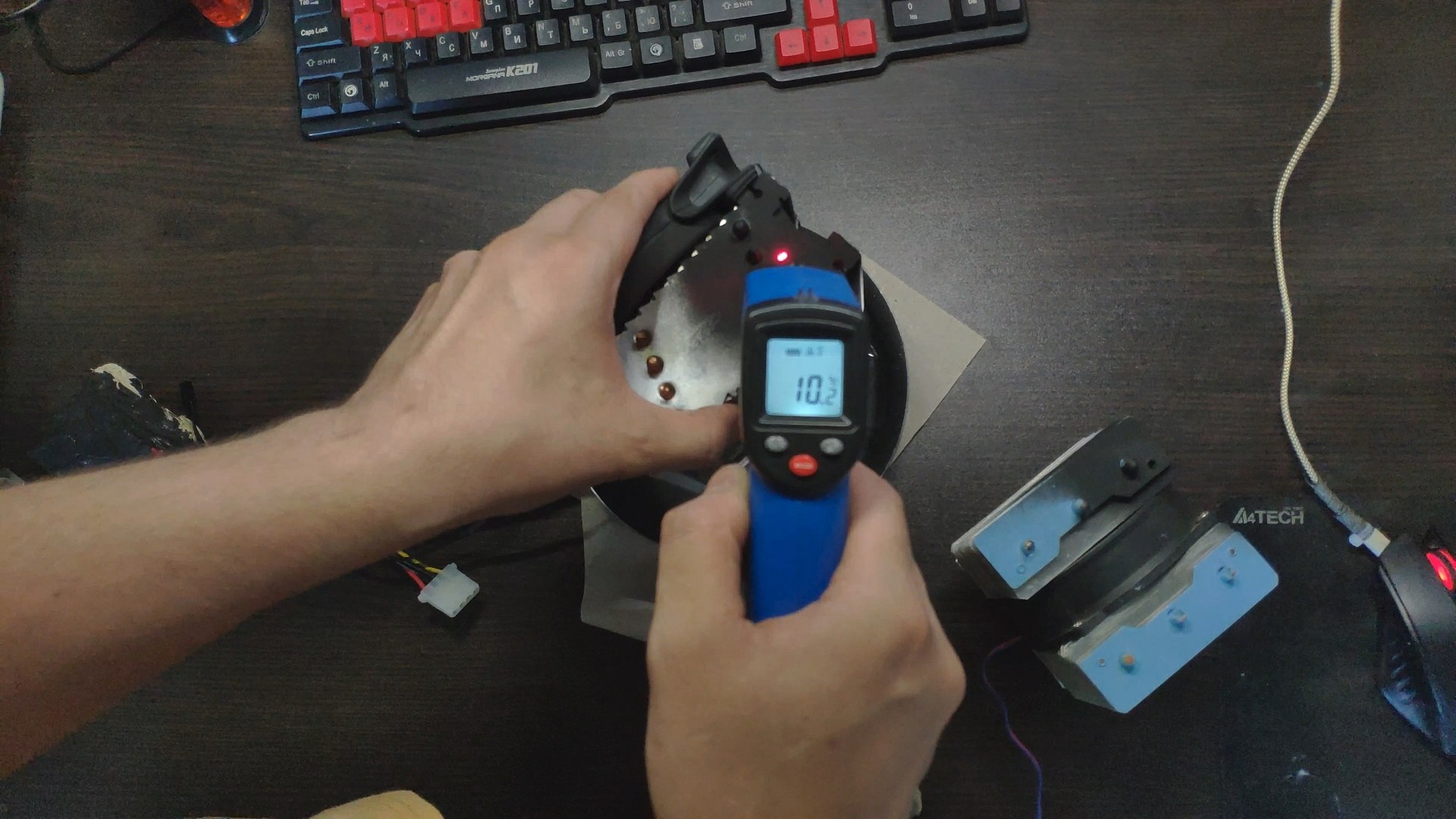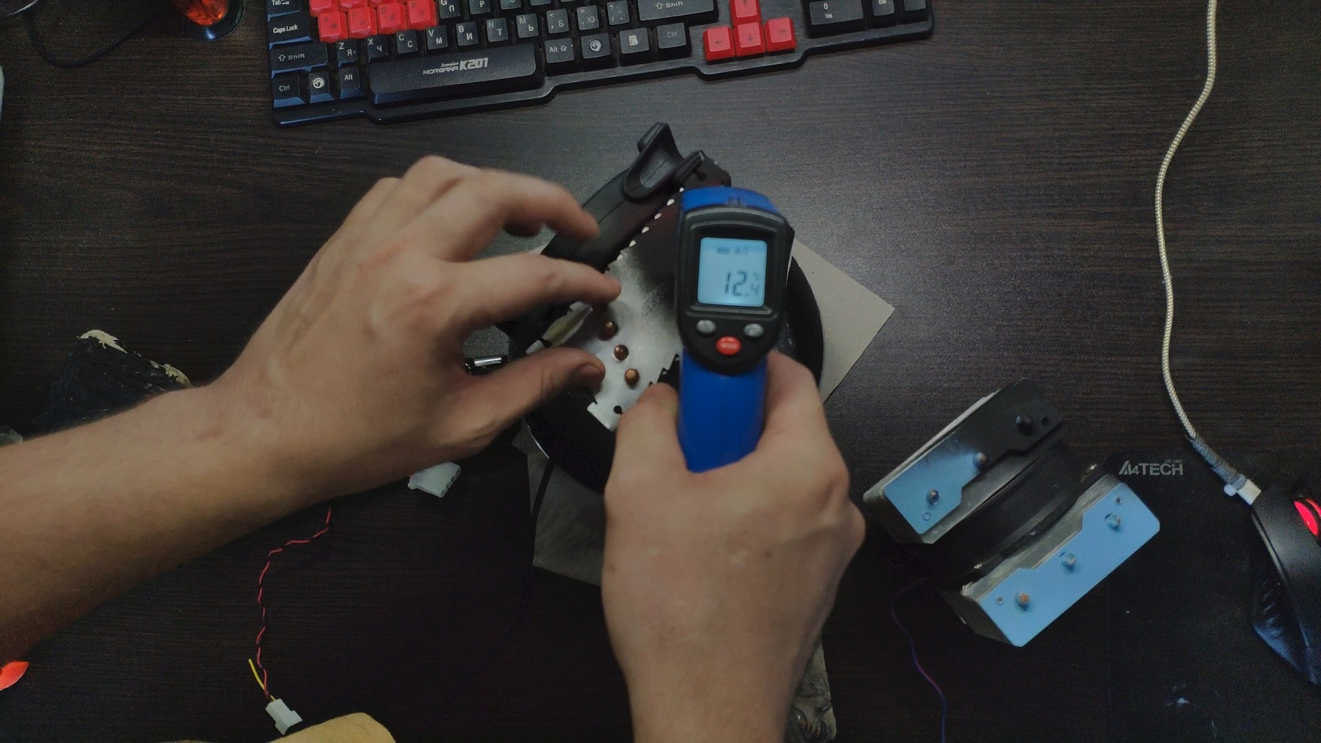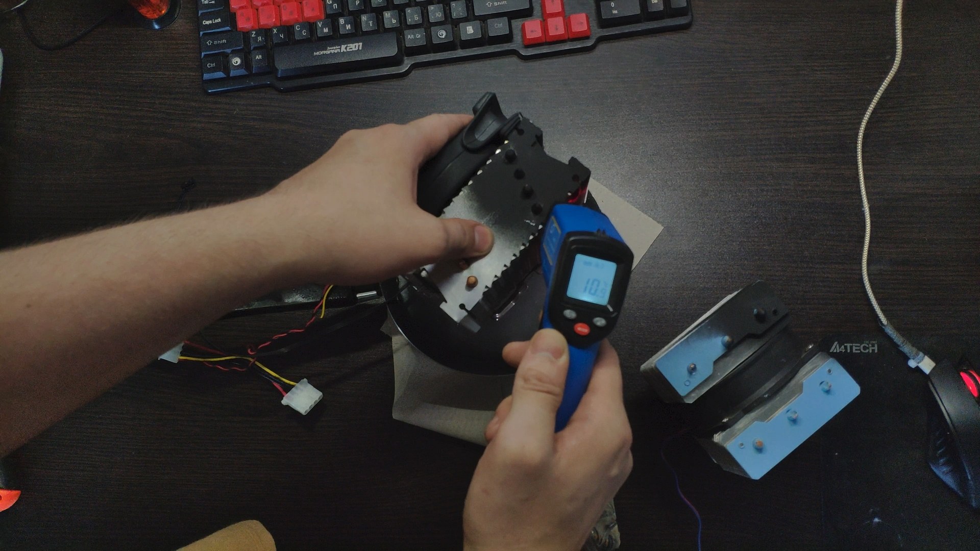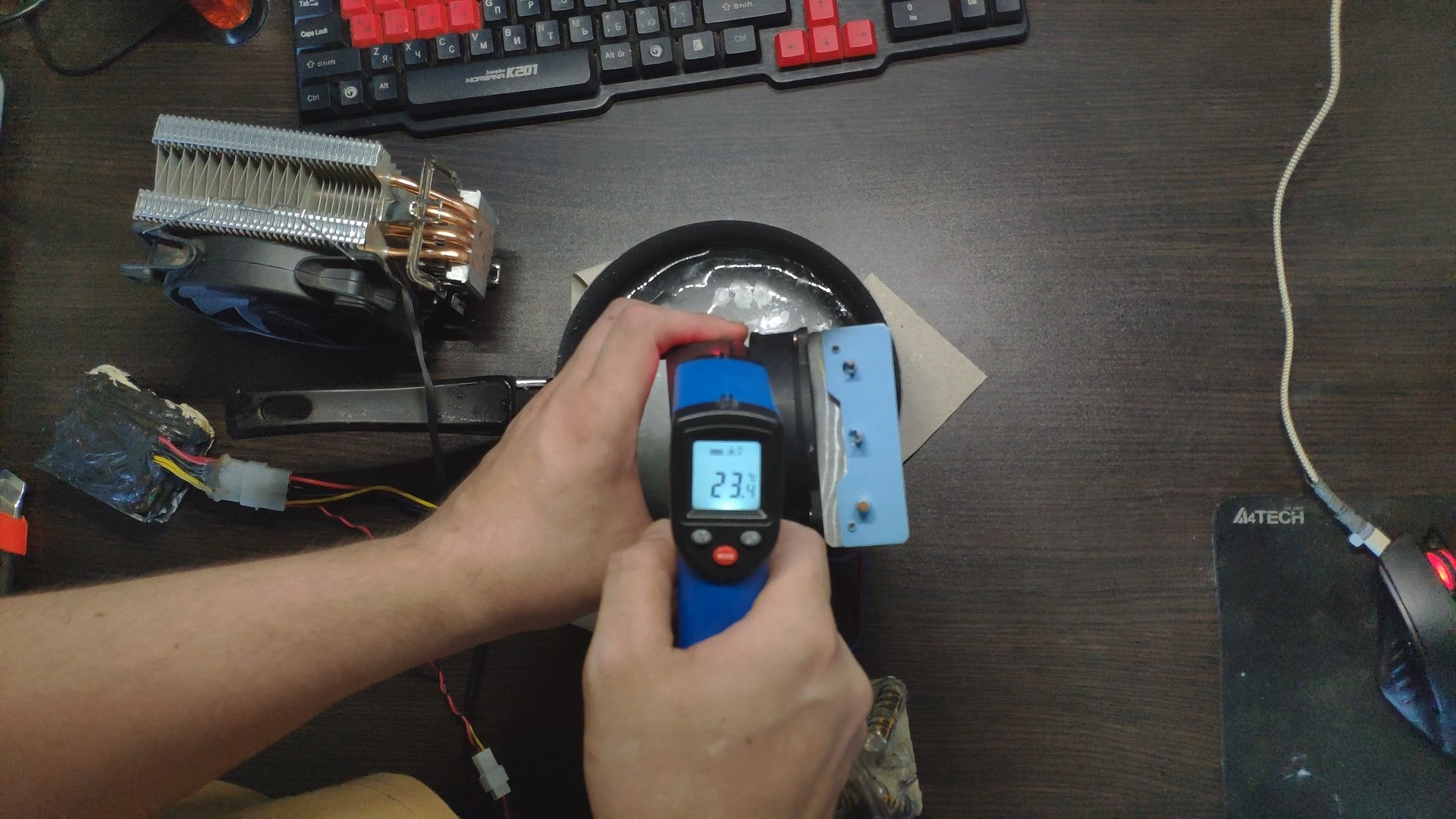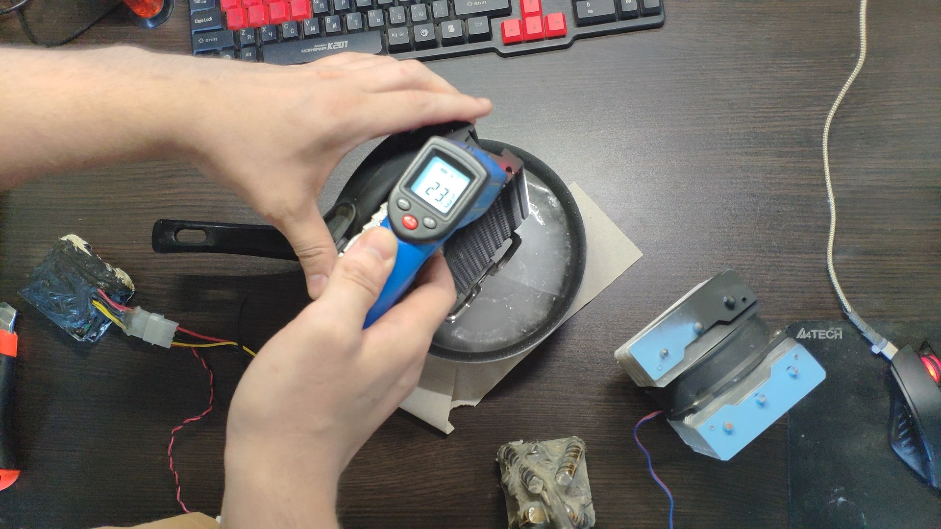 Для испытаний я подготовил две башни, модифицированный Titan TTC-NK34TZ/RF(BX) и PCCooler GI-X4b, в качестве вспомогательного элемента будет аккумулятор на 12в (подключать вентиляторы) и пирометр (измерять температуру).