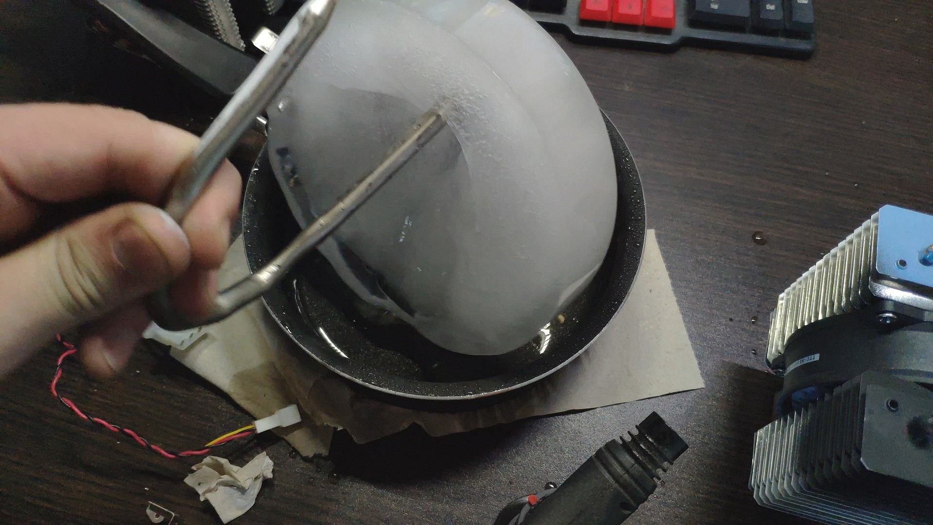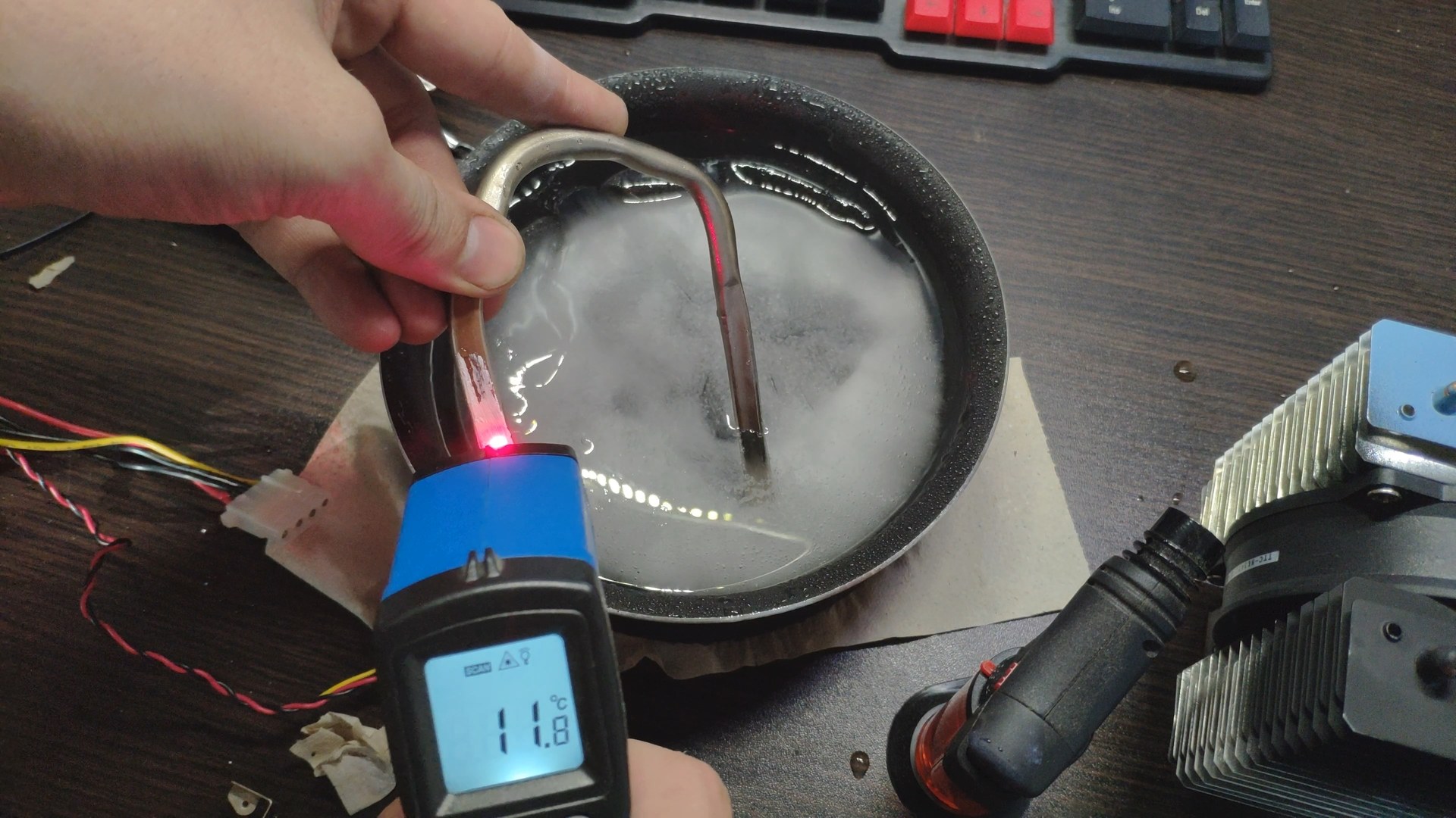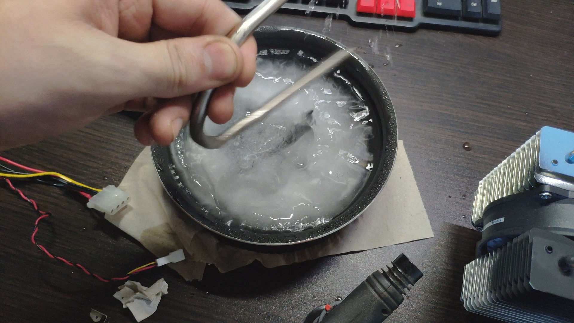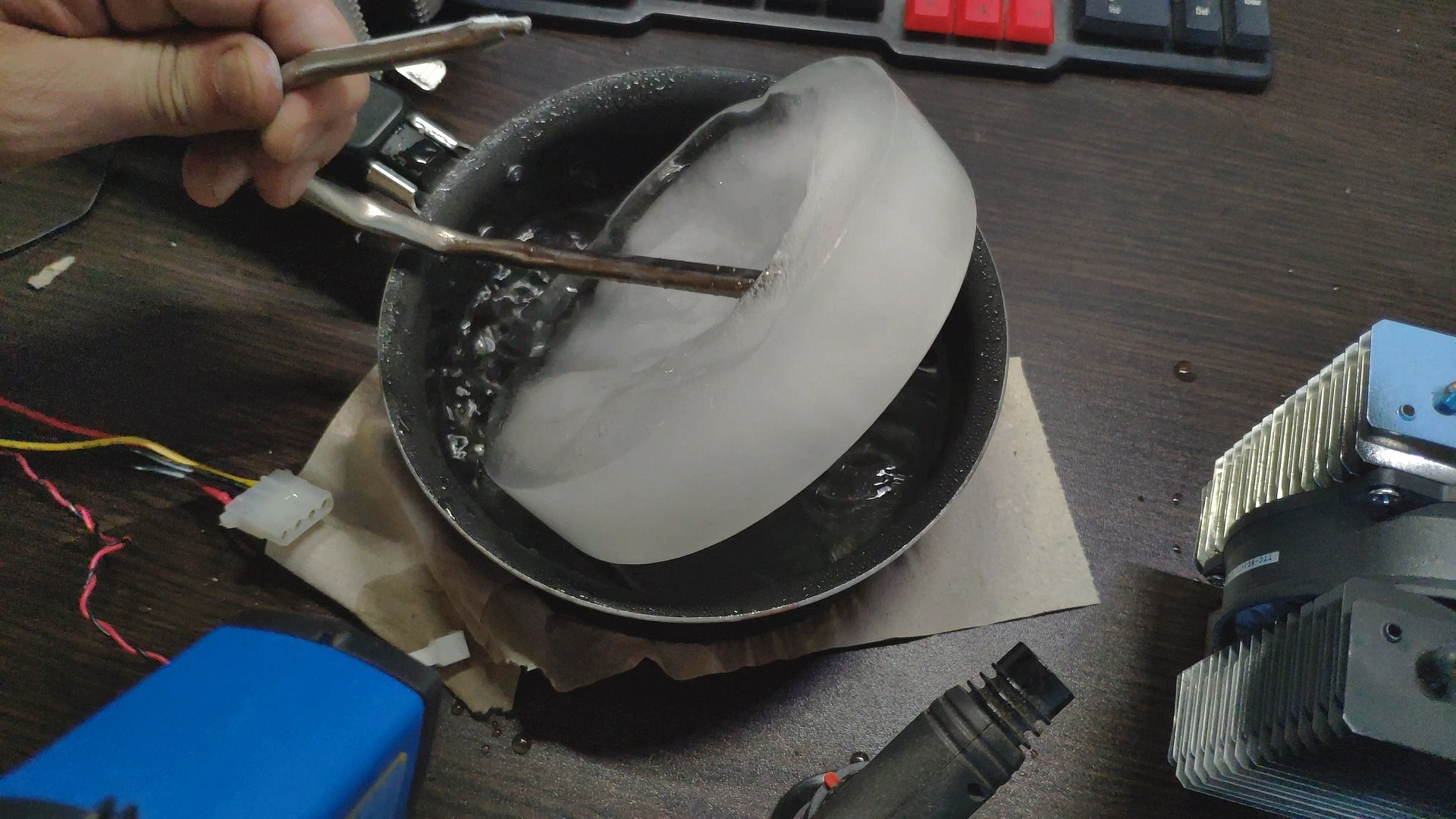 Далее я просто воткнул пятку башни в глыбу льда, и за считанные секунды пошли ручейки воды, а температура поверхности радиатора возле трубок начала стремительно падать.