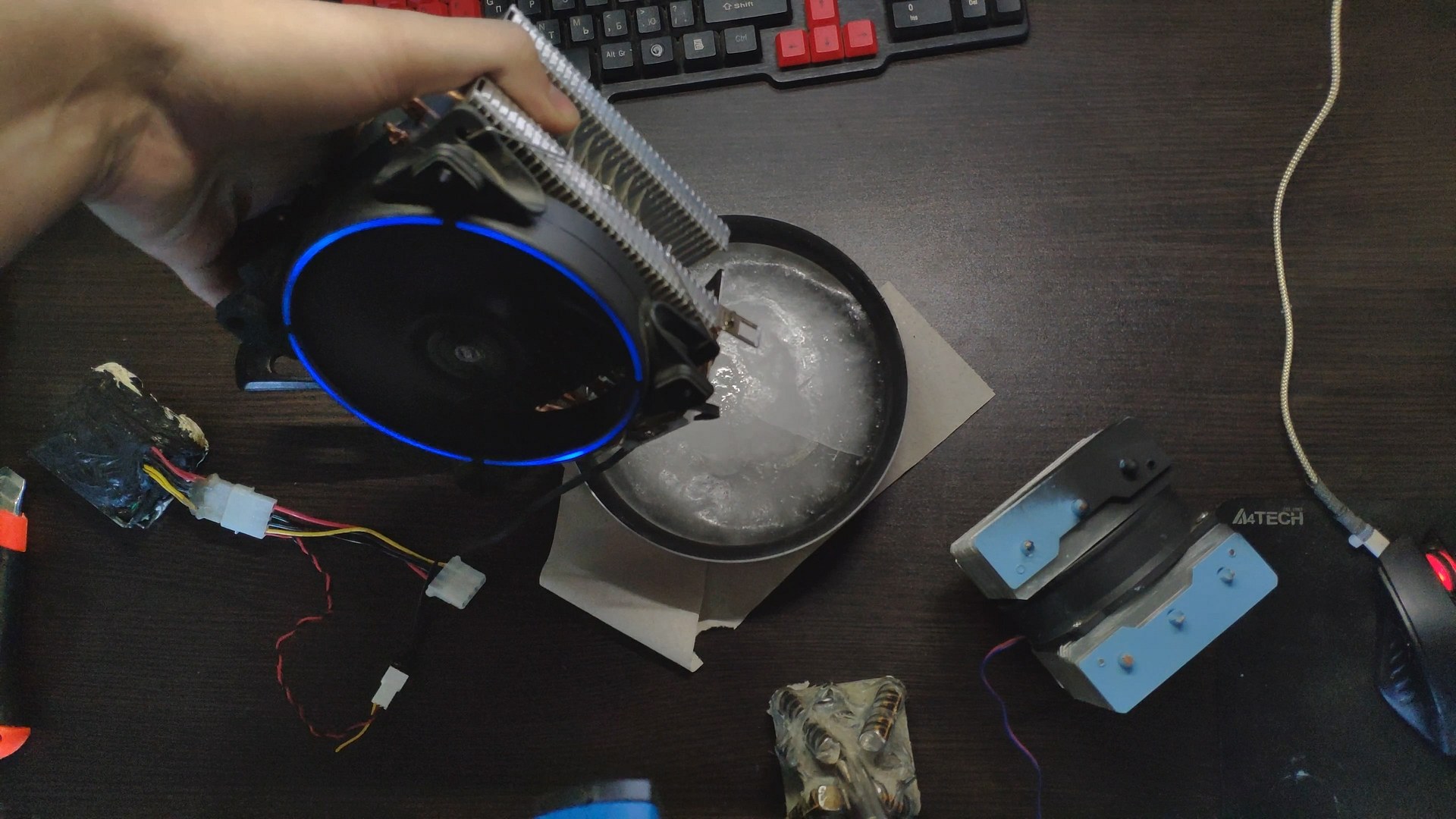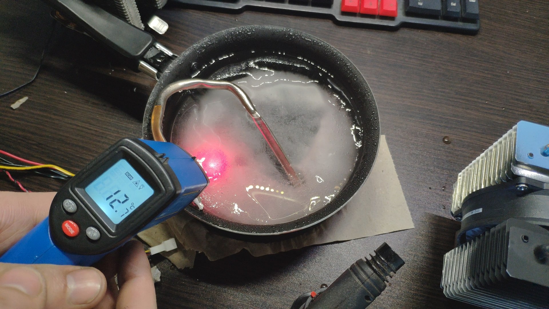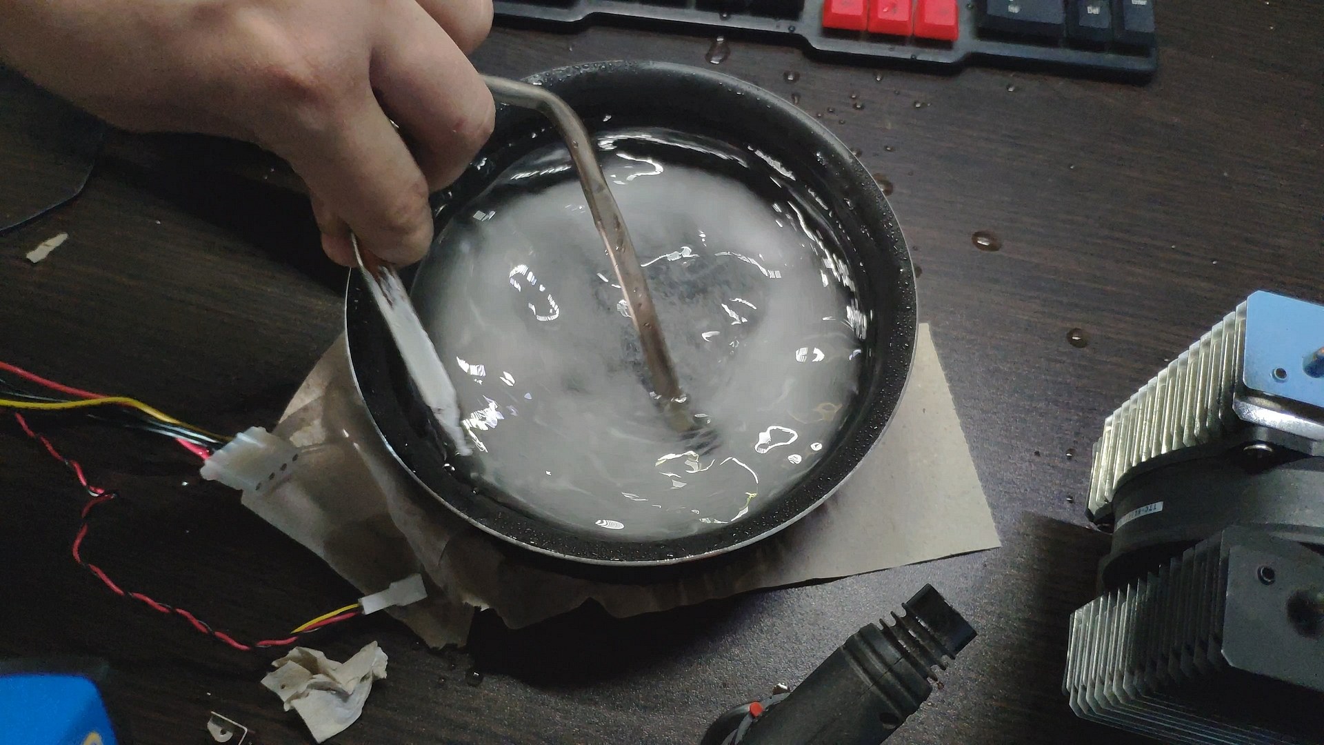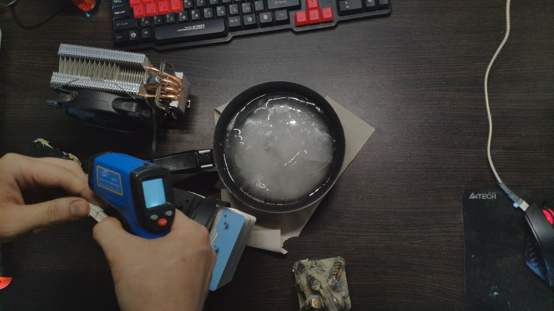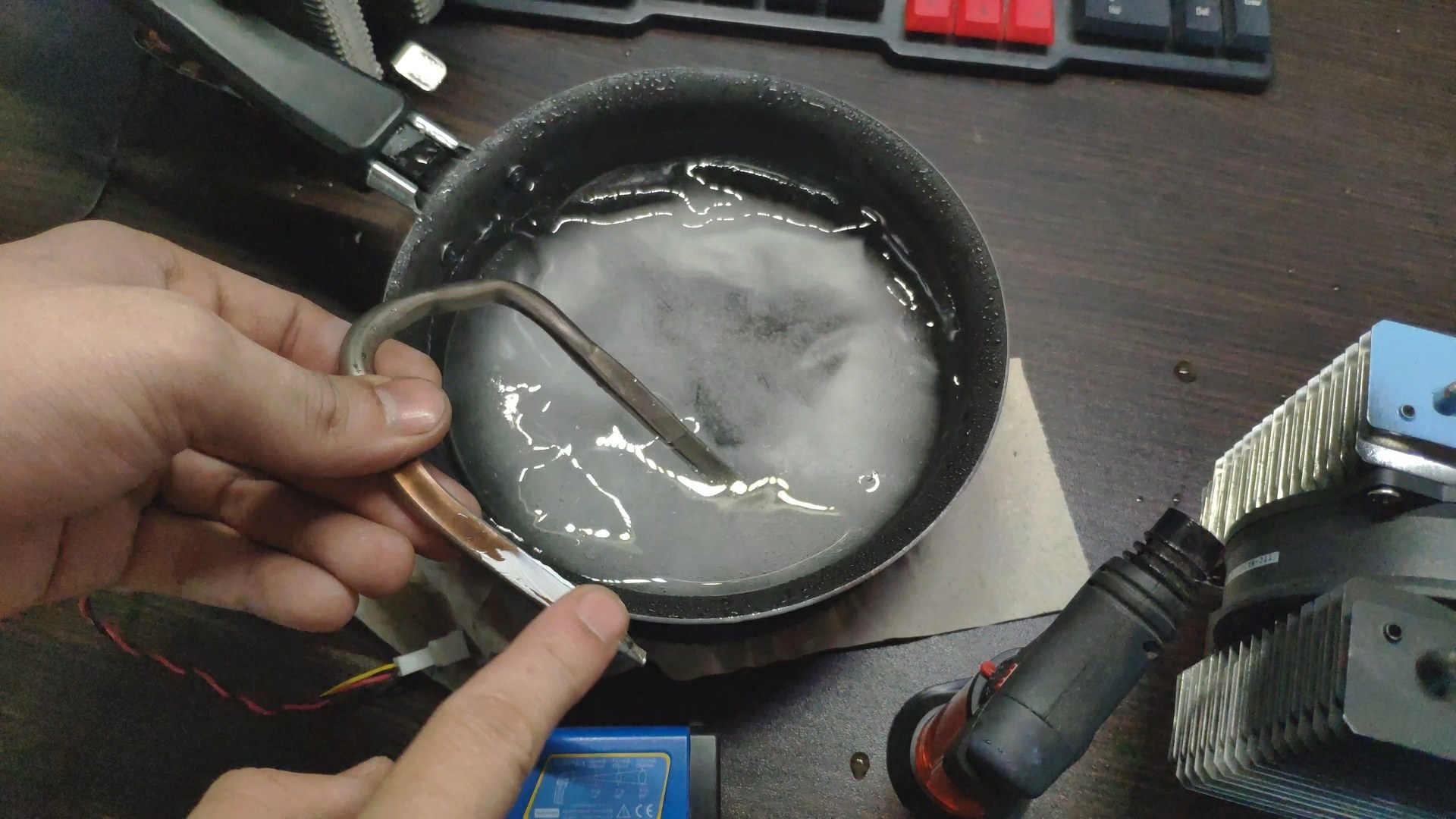 Далее я просто воткнул пятку башни в глыбу льда, и за считанные секунды пошли ручейки воды, а температура поверхности радиатора возле трубок начала стремительно падать.