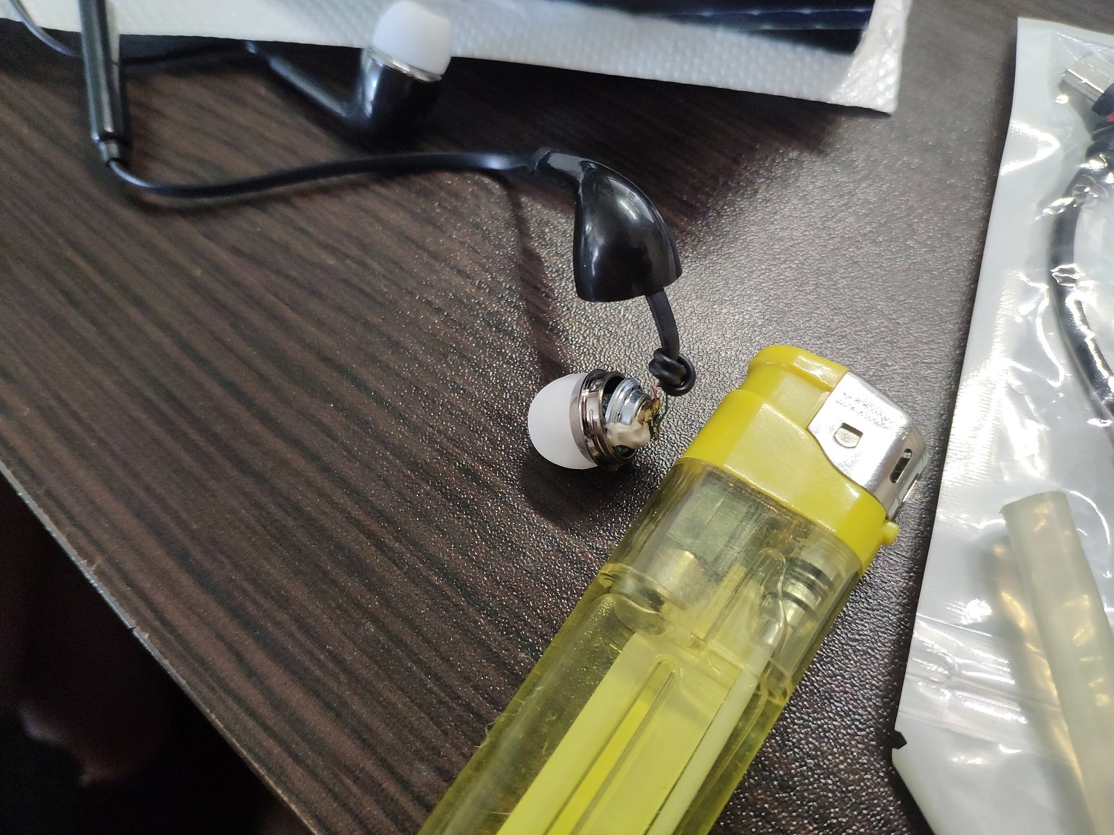 Внутри еще была клейкая пористая прокладка к которой должны приклеивать динамик при сборке, но сборщики настолько торопились что динамик просто вбросили и закрыли, точно так же был собран и второй наушник...