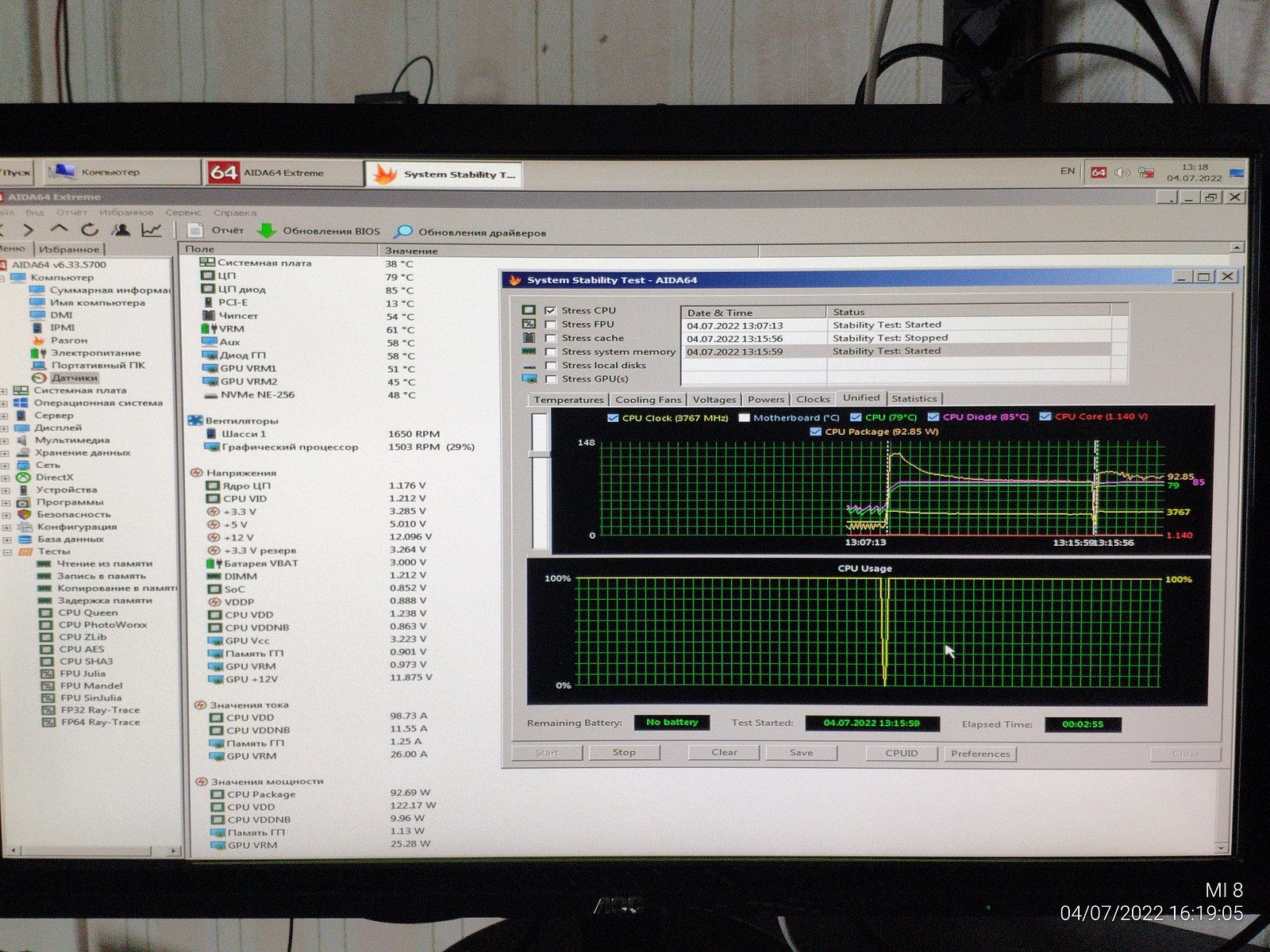 В данный момент система без ограничений по мощности, только напряжение на ЦП снижено примерно на 0.1в, сразу же я взялся за тесты: