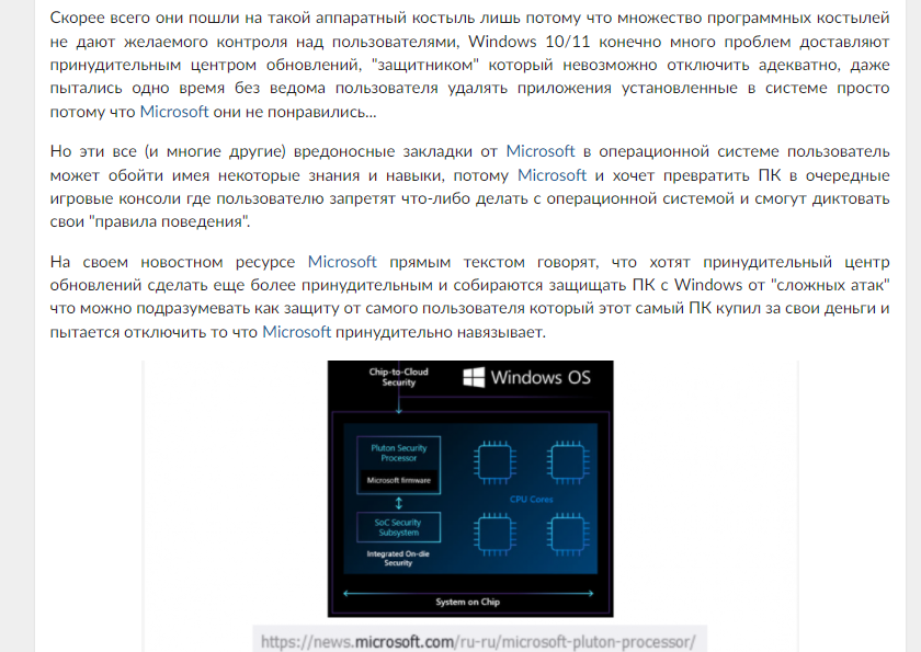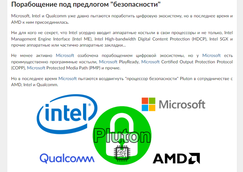 Для тех кто не в курсе, Microsoft Pluton это аппаратный DRM-костыль который имеет абсолютно полный доступ к системе пользователя, может делать все что угодно по указке Microsoft и от этого костыля никак не избавиться так как реализован прямо в кристалле процессора.