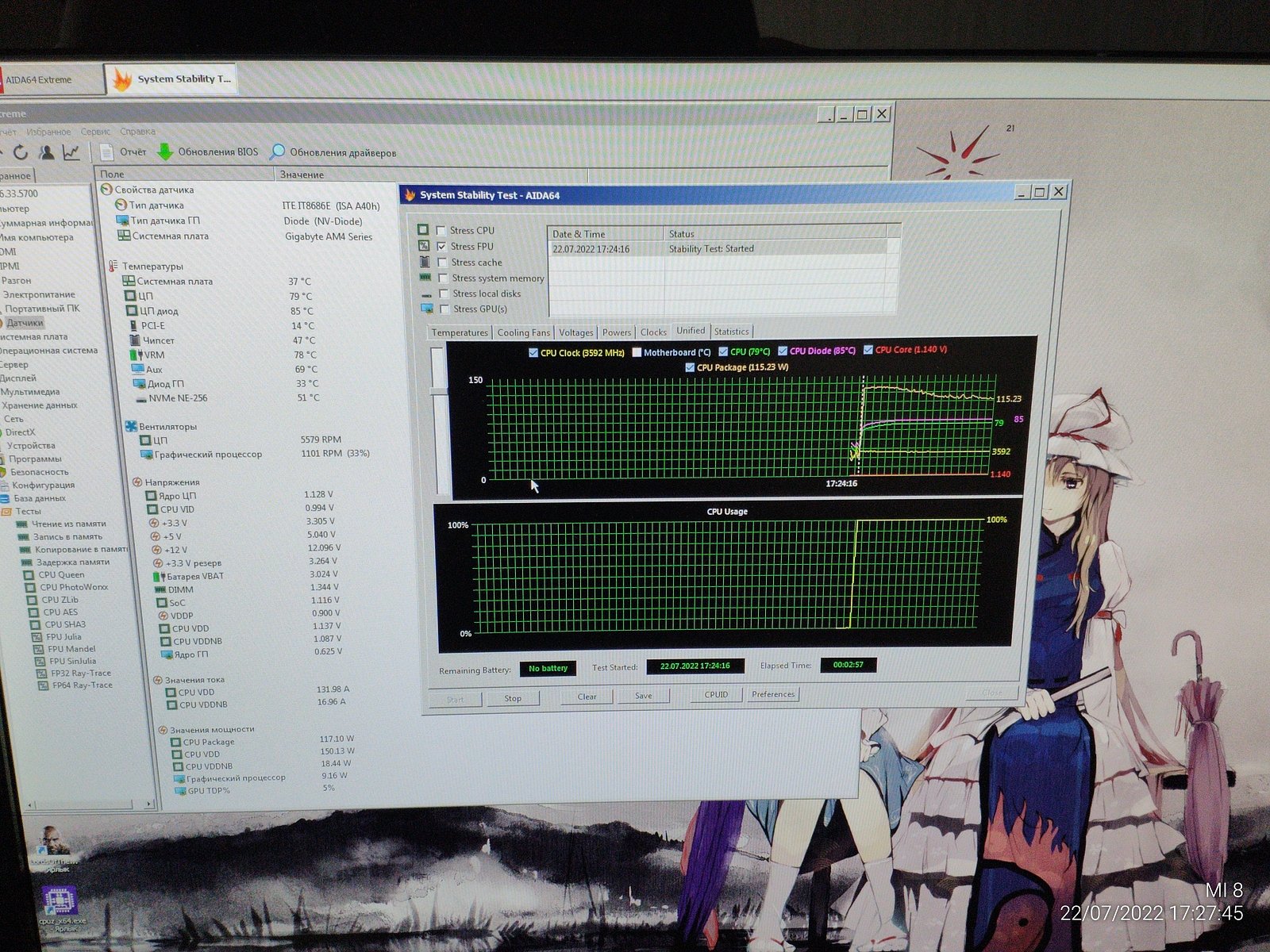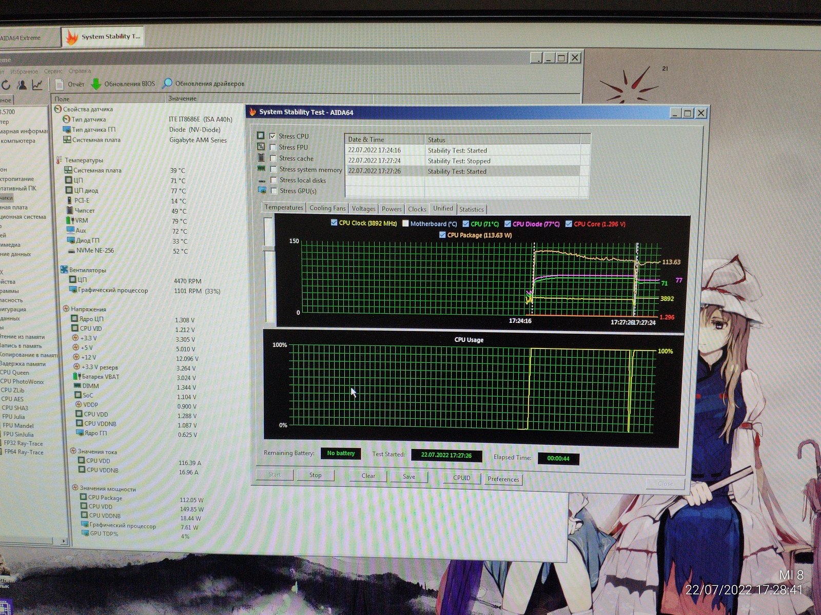 Спустя некоторое время частота всех 8 ядер при нагрузке на FPU упала до ~3.6 ГГц и выделяемая мощность вышла примерно на уровень 115 Вт, термопара тем временем показывает температуру воздуха в корпусе на уровне 48 градусов, вот это уже скоро можно будет называть "духовкой".