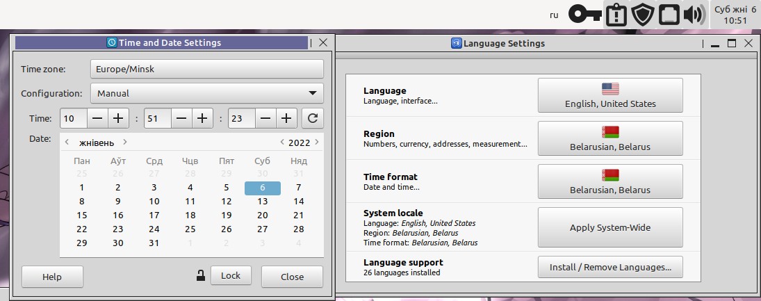 А еще настройки связанные с часами разбросаны по разным разделам в контрольном центре системы, а смена "формата" даты и времени работает только после перезагрузки, и ничего кардинально не меняет кроме "Fri Aug 52" -> "Суб жни 6".